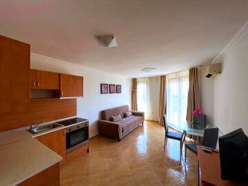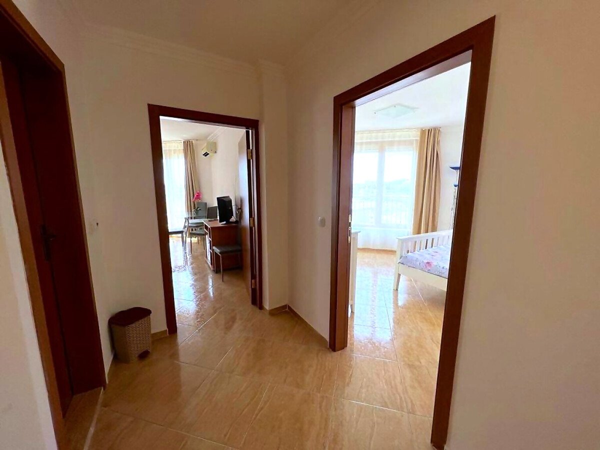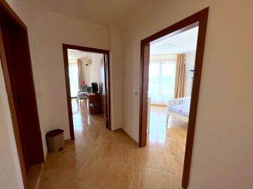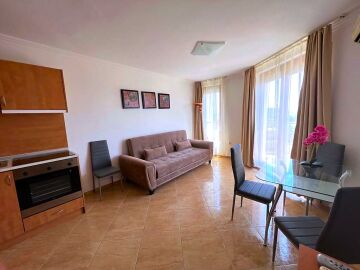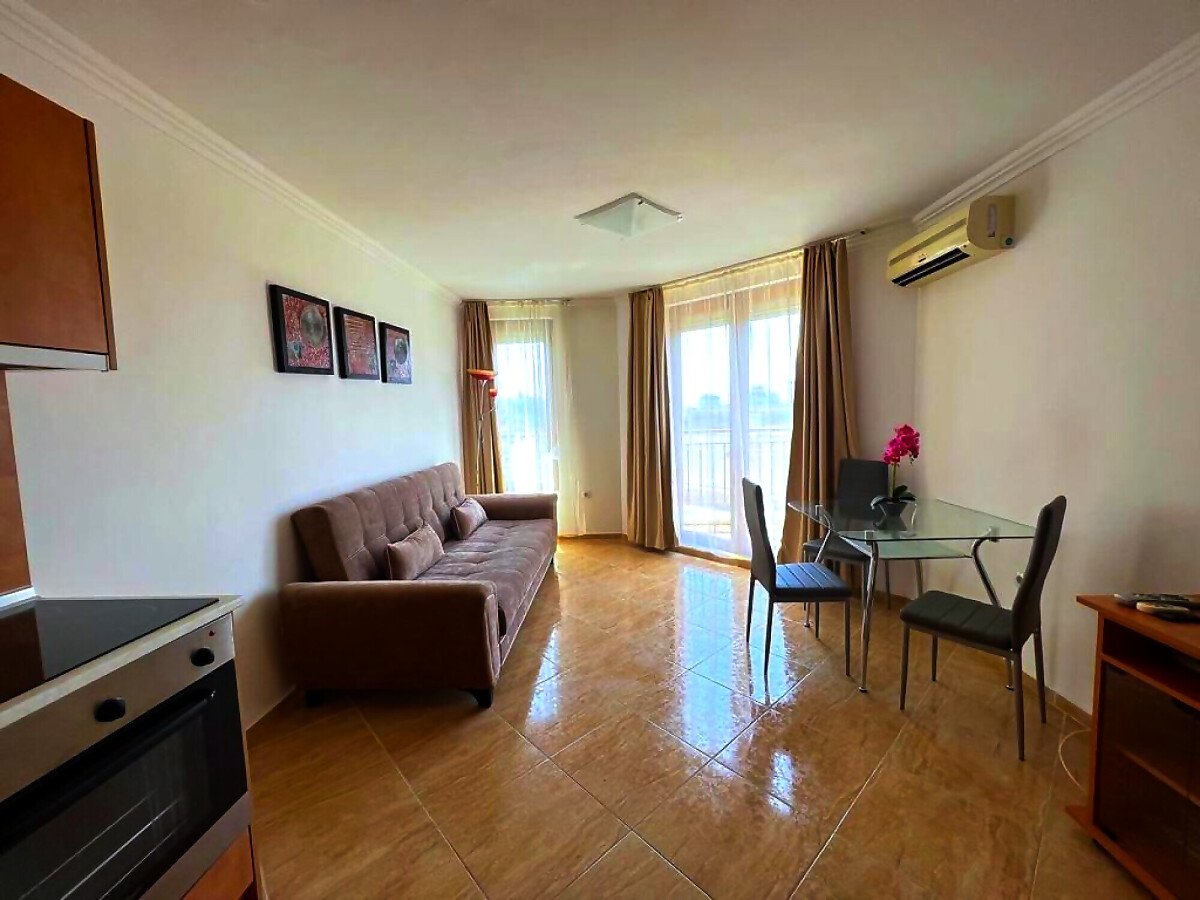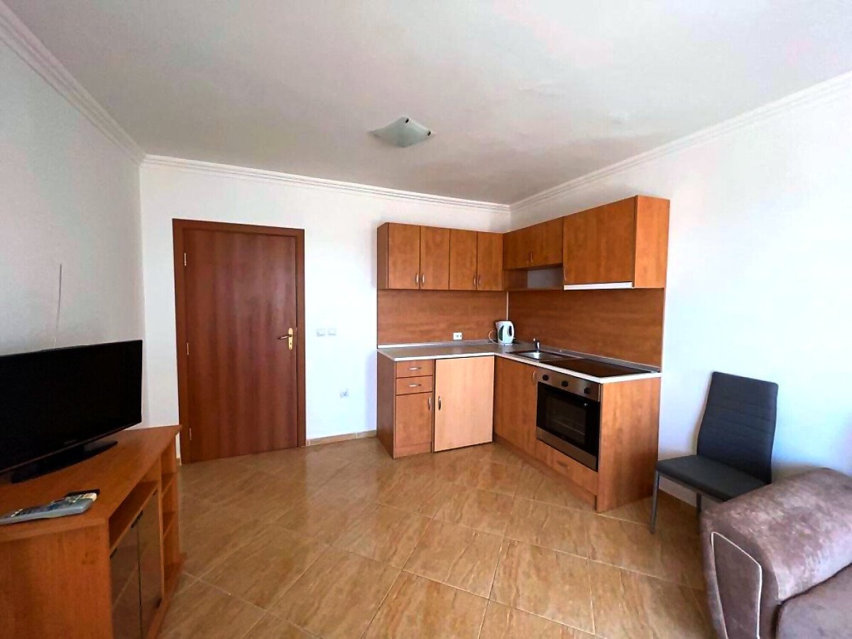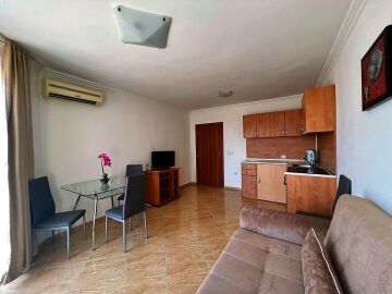 Апартаментът се продава в идеално състояние, напълно обзаведен с качествени мебели, оборудван с необходимата домакинска техника, готов за нанасяне. Състои се от входно антре, всекидневна с трапезария и кухненски бокс, спалня, баня с тоалетна, тераса с красива гледка към морето, басейна и планината. Във всекидневната има климатик.