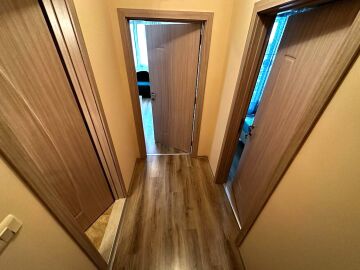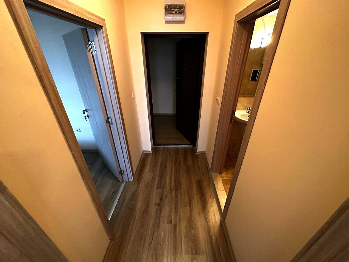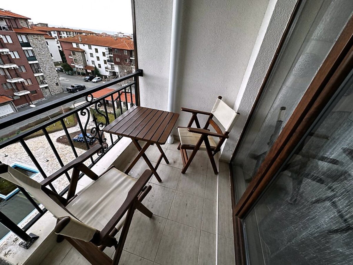 Апартаментът е разположен на шести, последен етаж, като сградата разполага с асансьор. Състои се от входно антре, всекидневна с обособен кухненски бокс, спалня, баня с тоалетна, тераса с красива гледка към басейна и частична гледка към морето. Продава се оборудван с необходимата домакинска електротехника, напълно обзаведен с качествени и стилни мебели, готов за нанасяне.