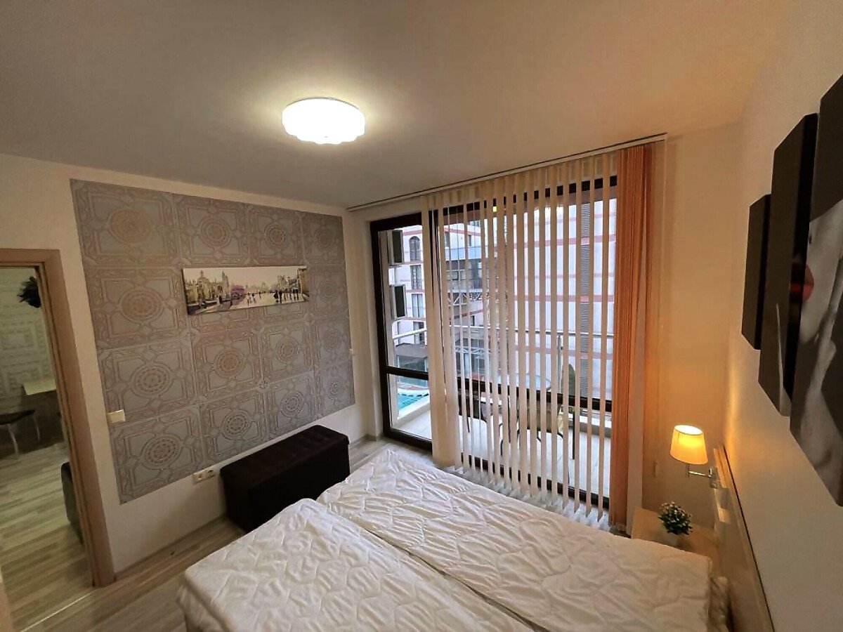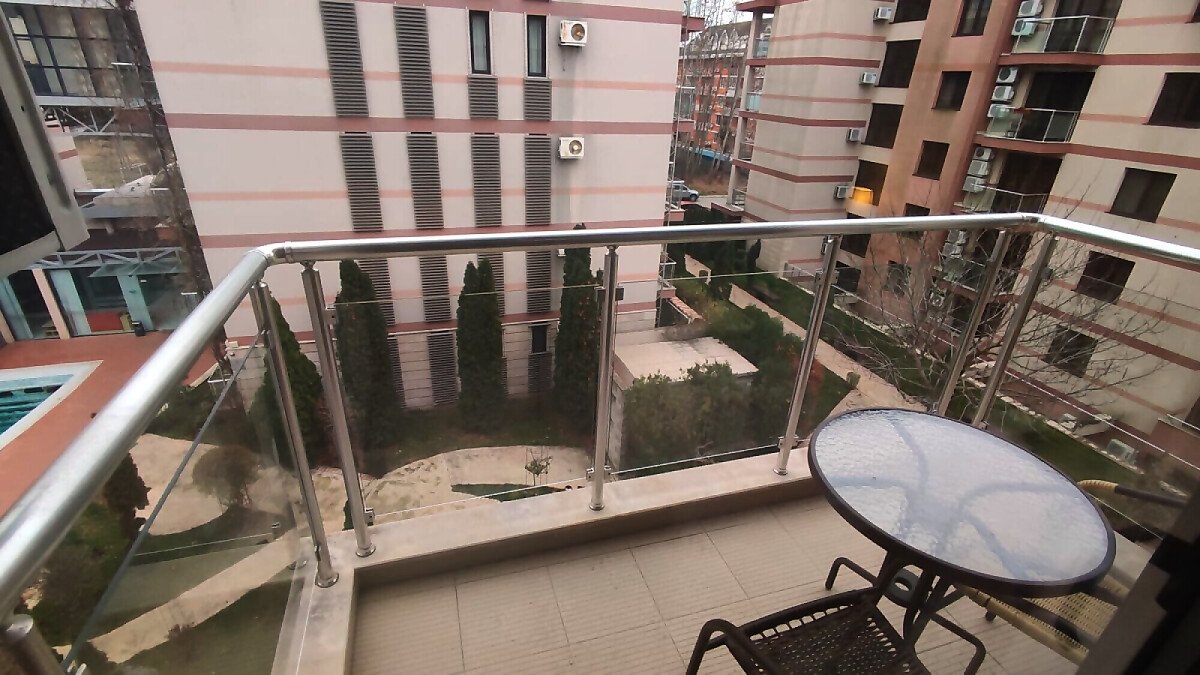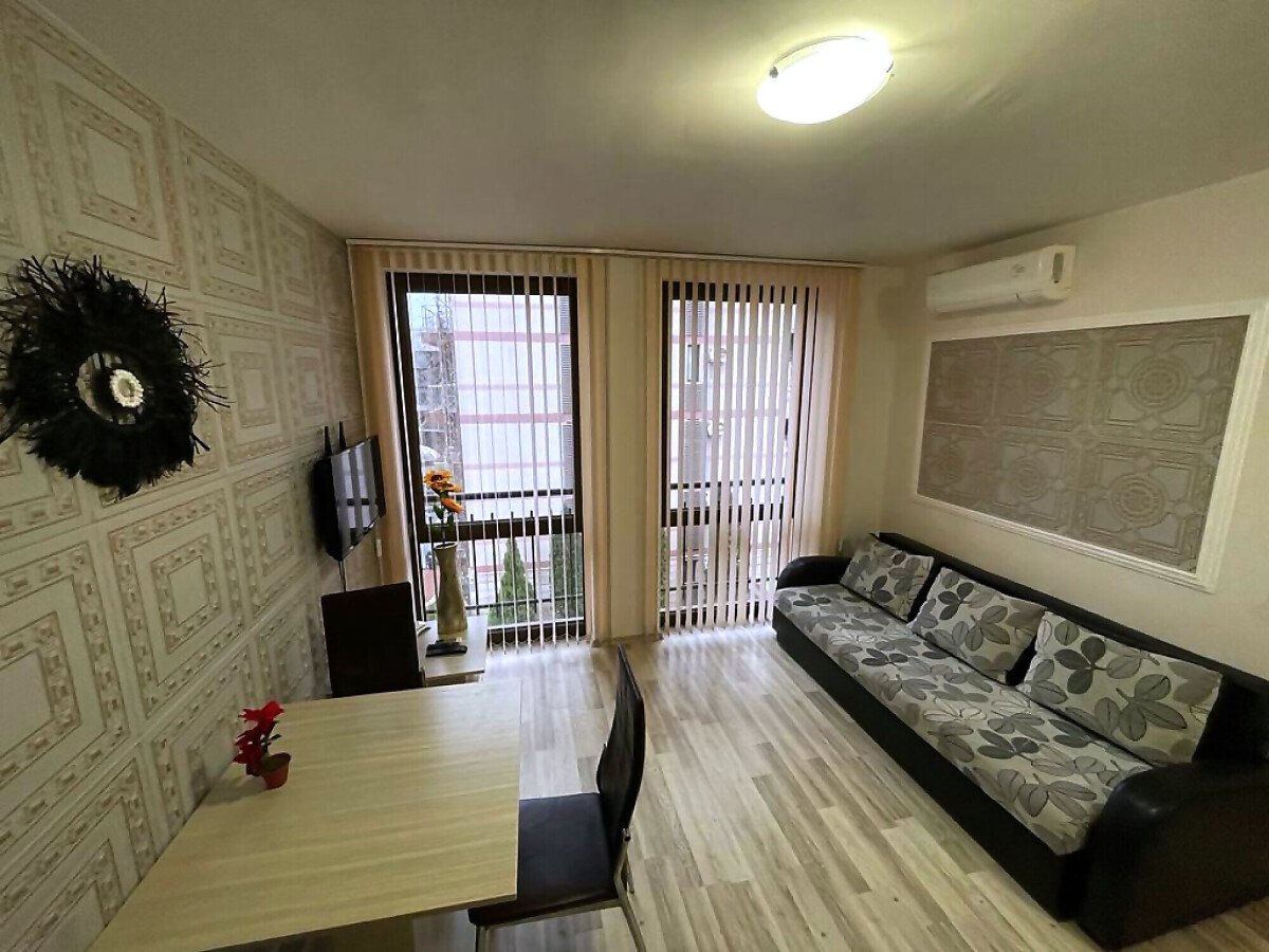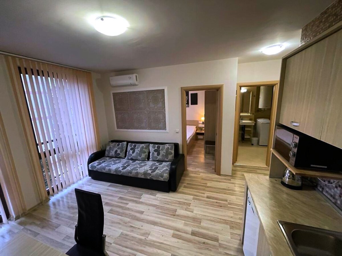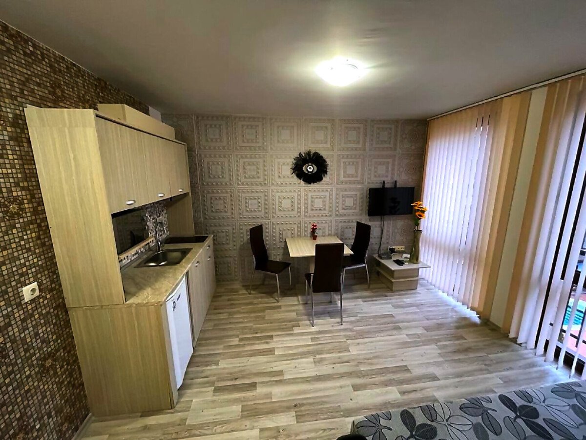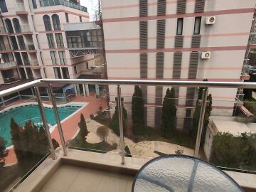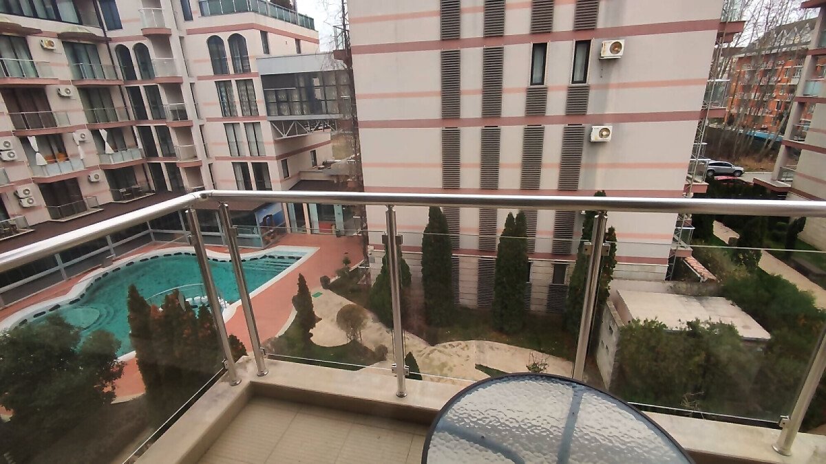 Апартаментът е в идеално състояние, оборудван с необходимата техника, напълно обзаведен, готов за нанасяне. Състои се от всекидневна с кухненски бокс и трапезария, спалня, баня с тоалетна и душ кабина, тераса с красива гледка към басейна и вътрешната част на комплекса.