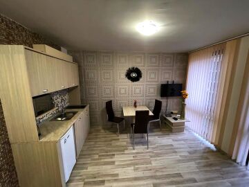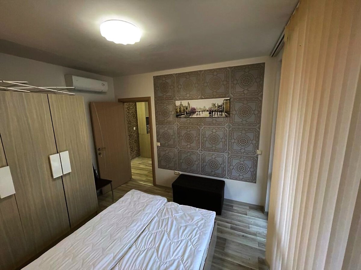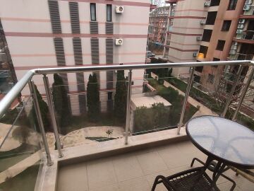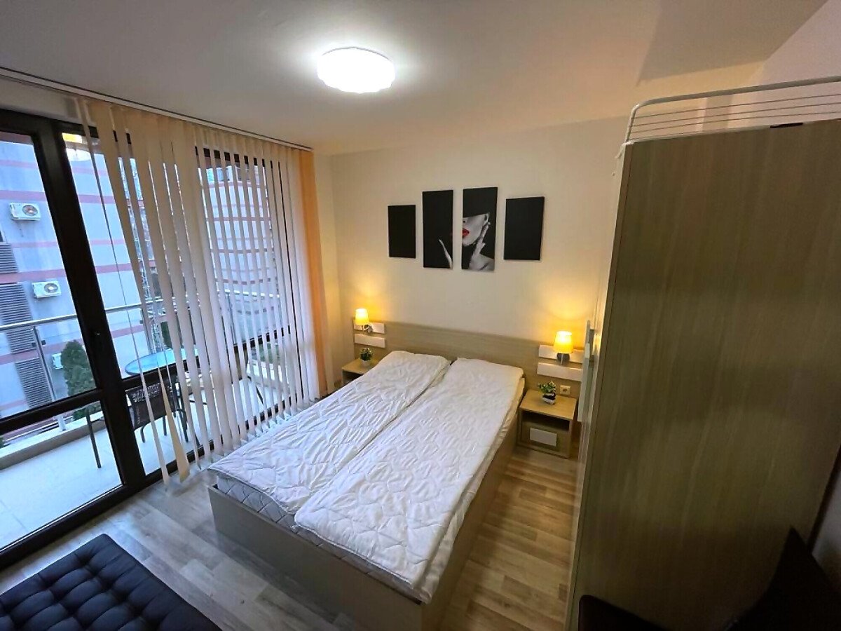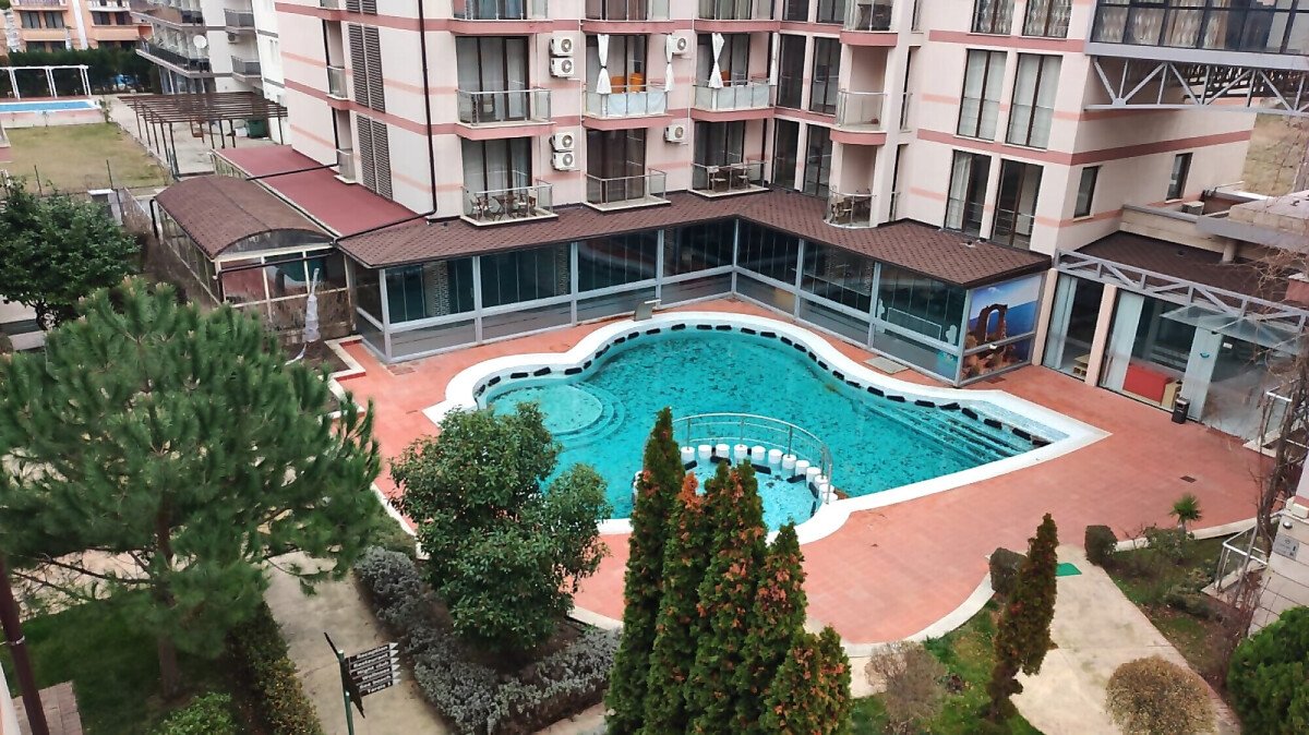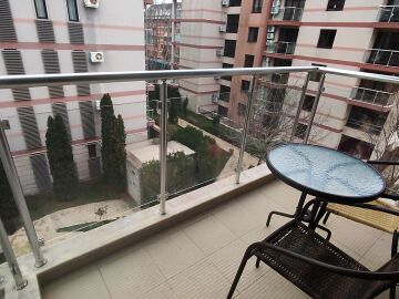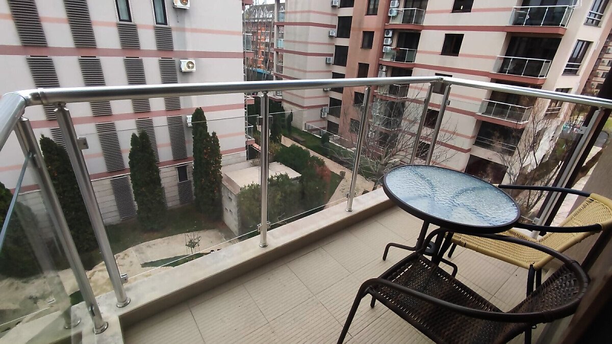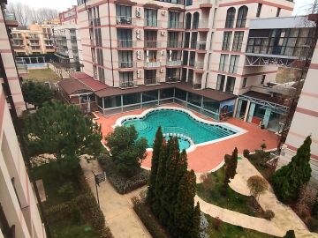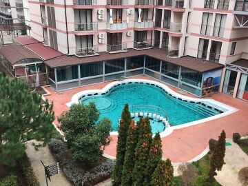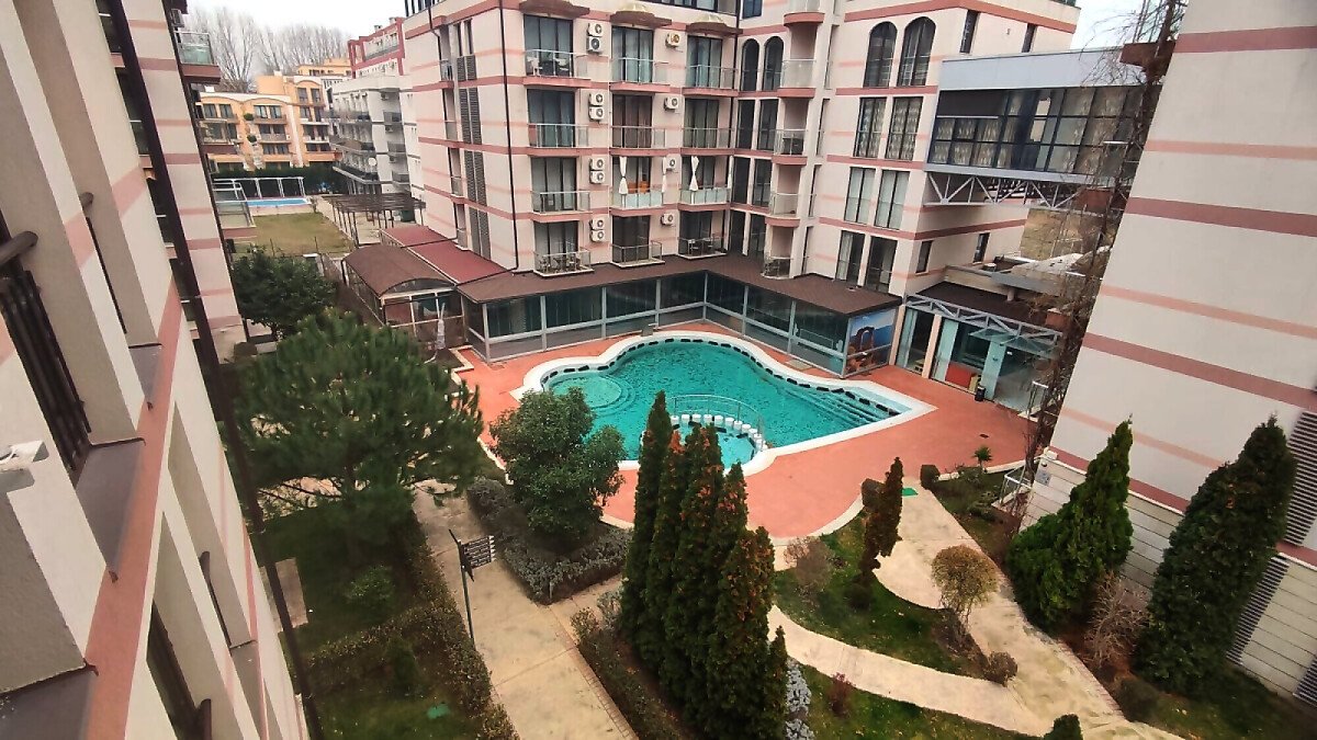 Апартаментът е в идеално състояние, оборудван с необходимата техника, напълно обзаведен, готов за нанасяне. Състои се от всекидневна с кухненски бокс и трапезария, спалня, баня с тоалетна и душ кабина, тераса с красива гледка към басейна и вътрешната част на комплекса.