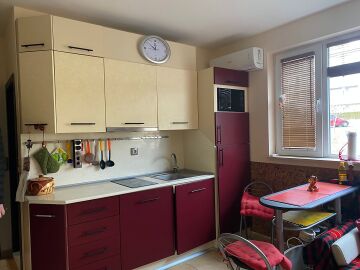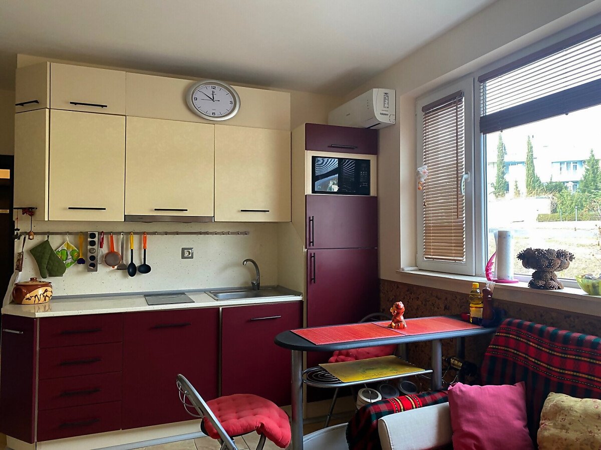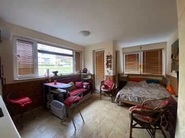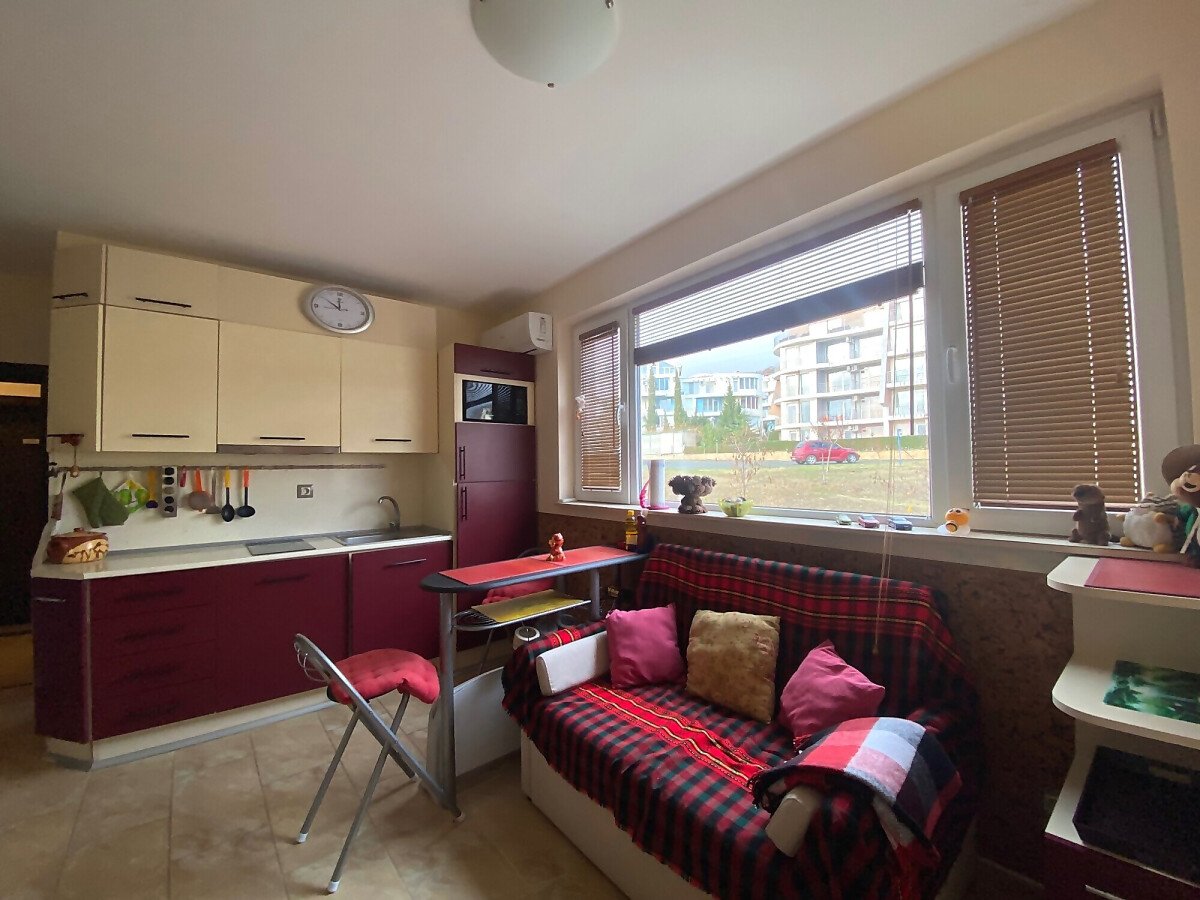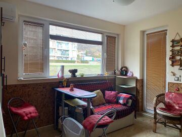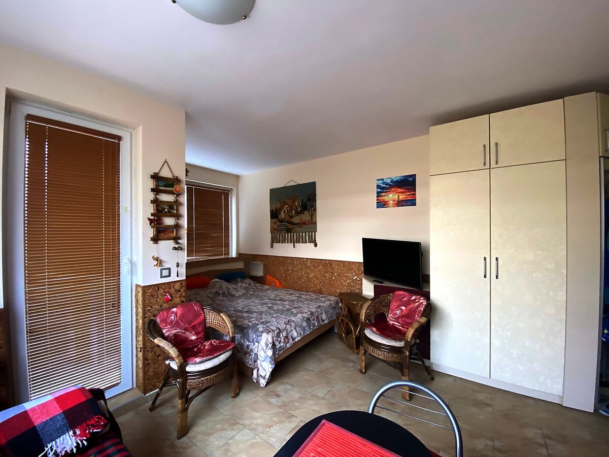 Студиото се състои от всекидневна с кухненски бокс, баня с тоалетна и вана, тераса. Имотът е в добро състояние, оборудван с необходимата домакинска техника, напълно обзаведен, готов за нанасяне. В цената е включено паркомясто!