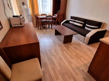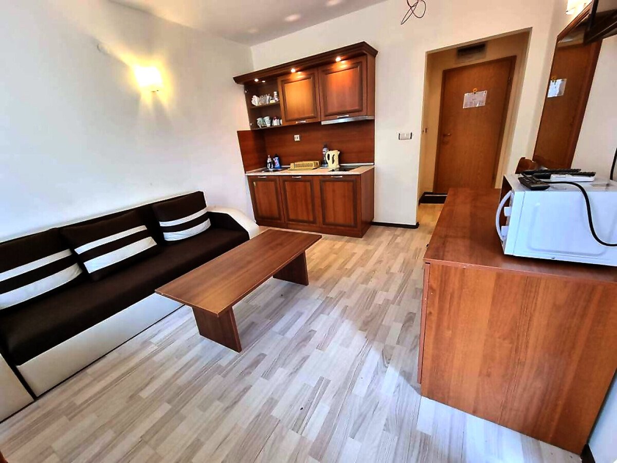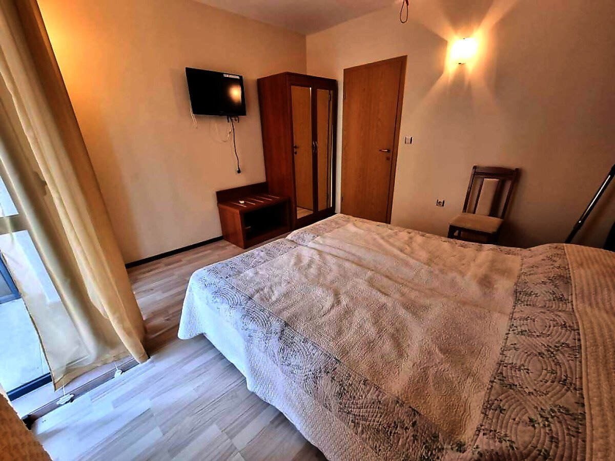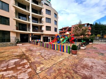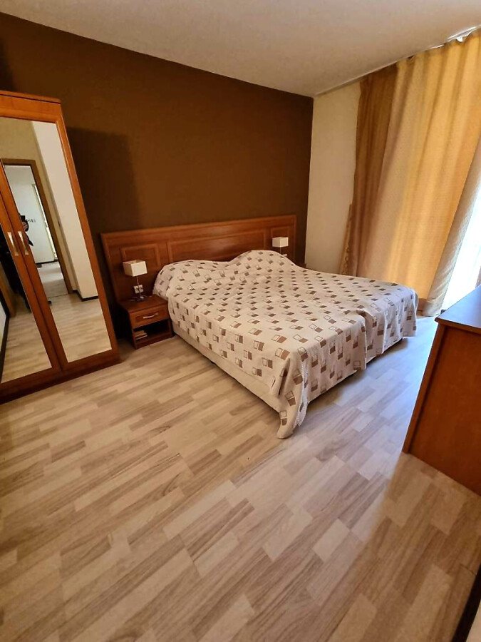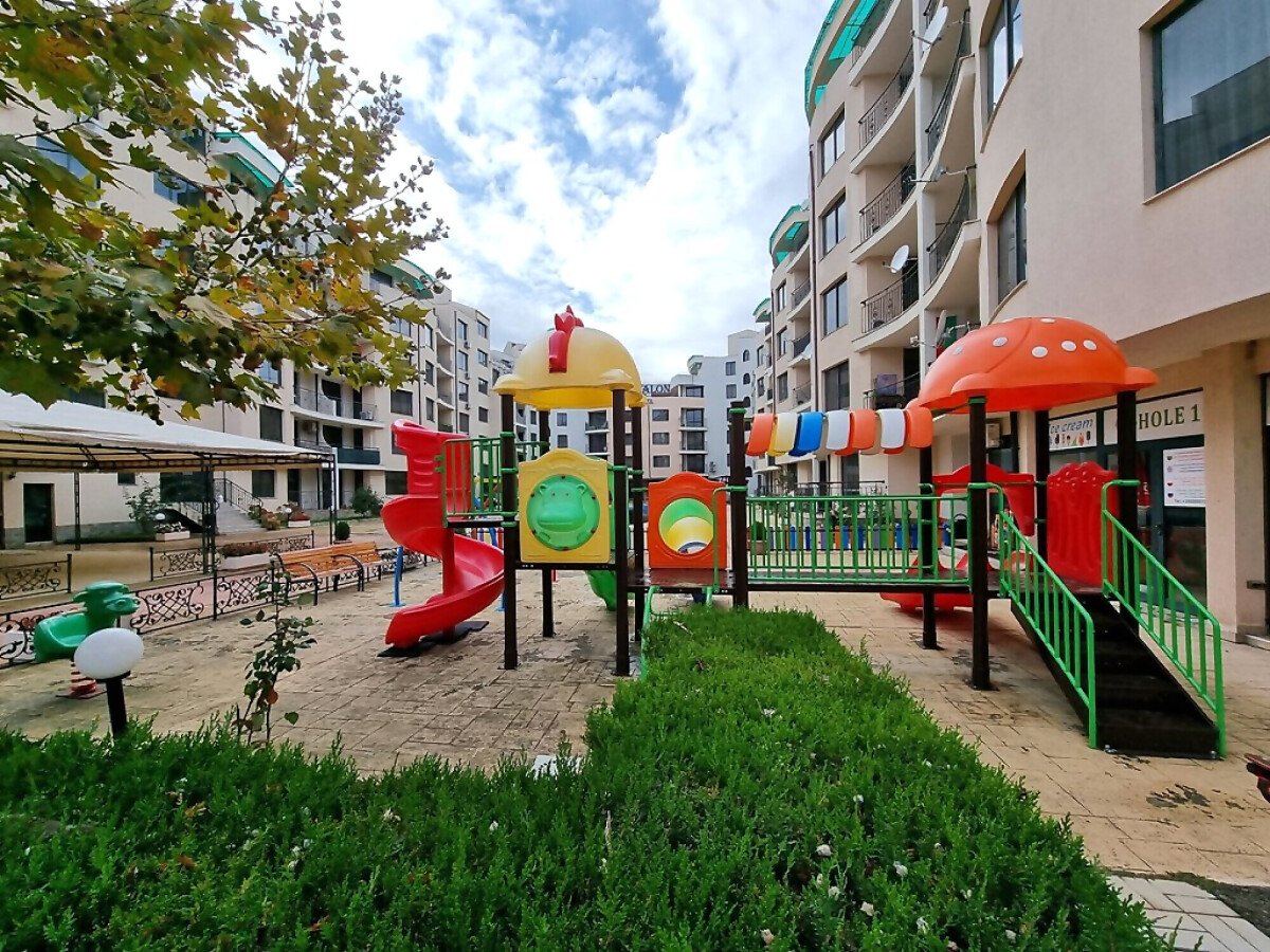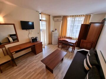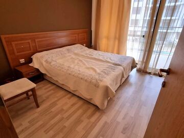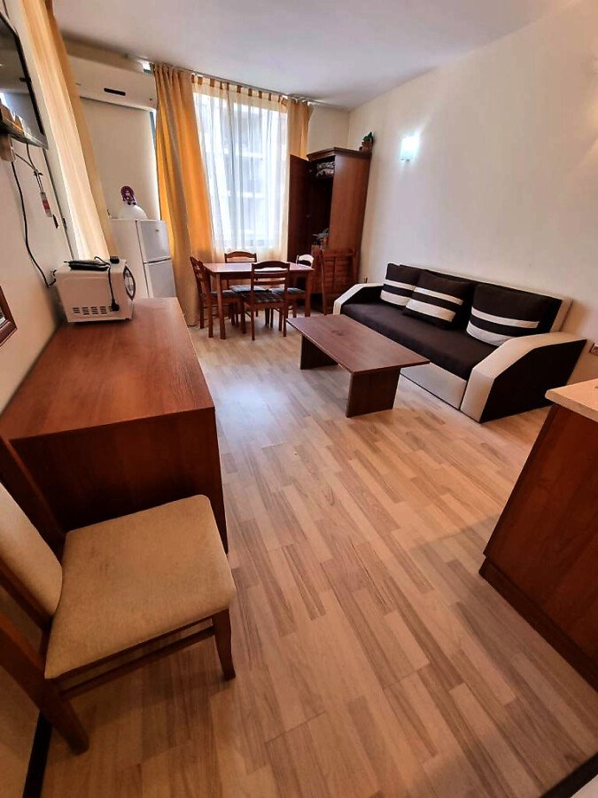 Апартаментът е уютен, светъл и функционален. Състои се от входно антре, всекидневна с кухненски бокс и зона за хранене, две спални, баня с тоалетна и душ кабина, тераса с гледка към басейна и вътрешната част на комплекса. Продава се в много добро състояние, оборудван с необходимите електроуреди, напълно обзаведен, готов за нанасяне.