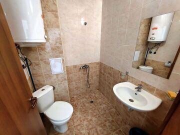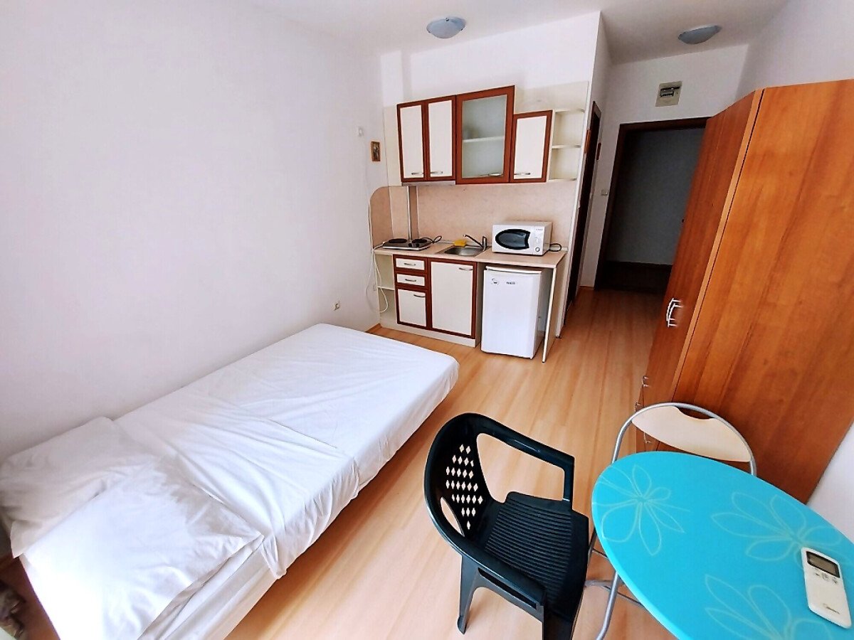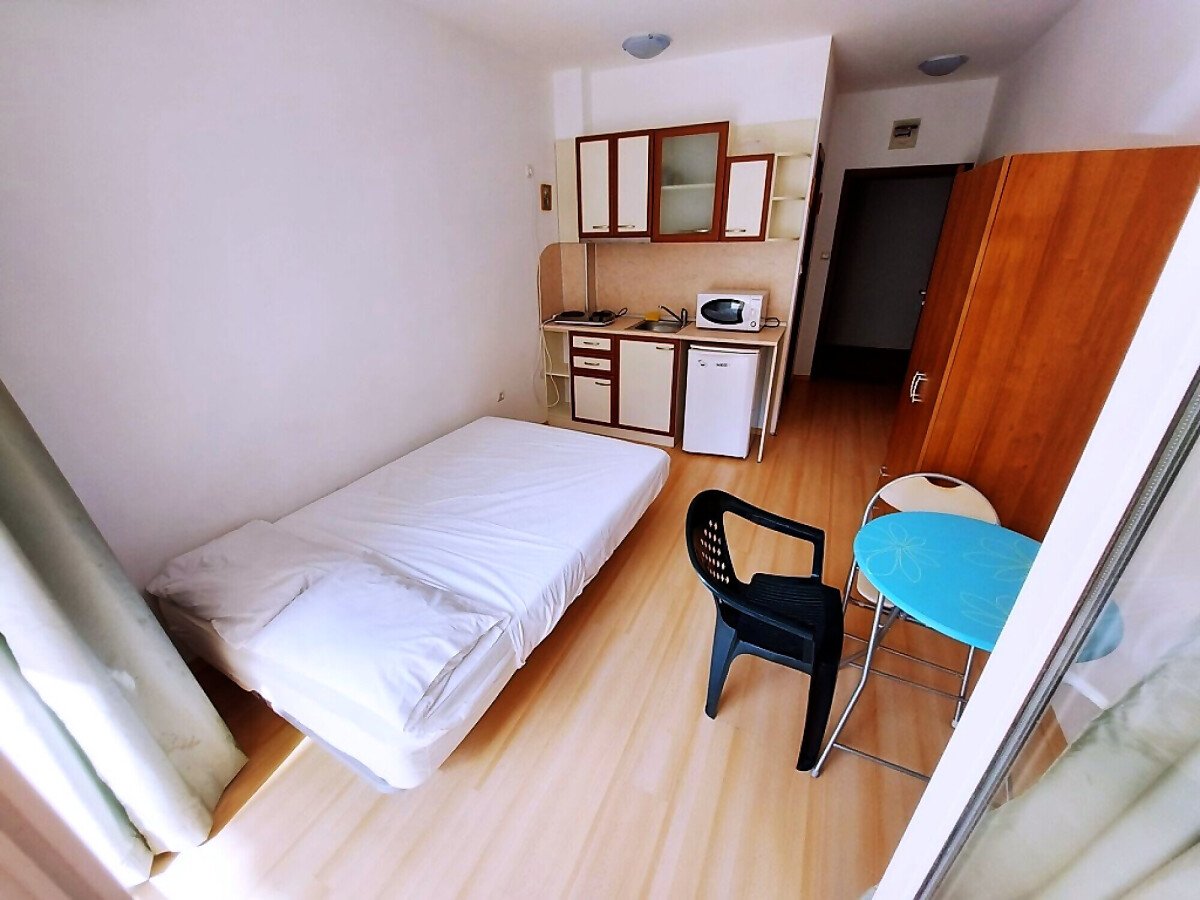 Студиото е компактно, разположено на втори етаж. Състои се от входно антре, всекидневна с обособена спалня и кухненски бокс, баня с тоалетна, тераса. Имотът се продава напълно оборудван с техника, обзаведен, готов за нанасяне.
