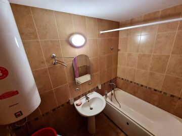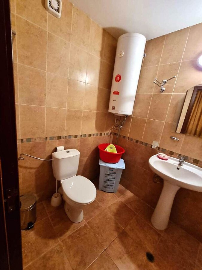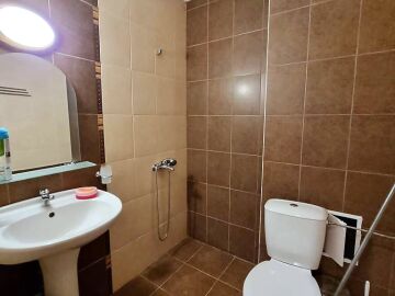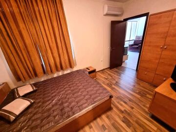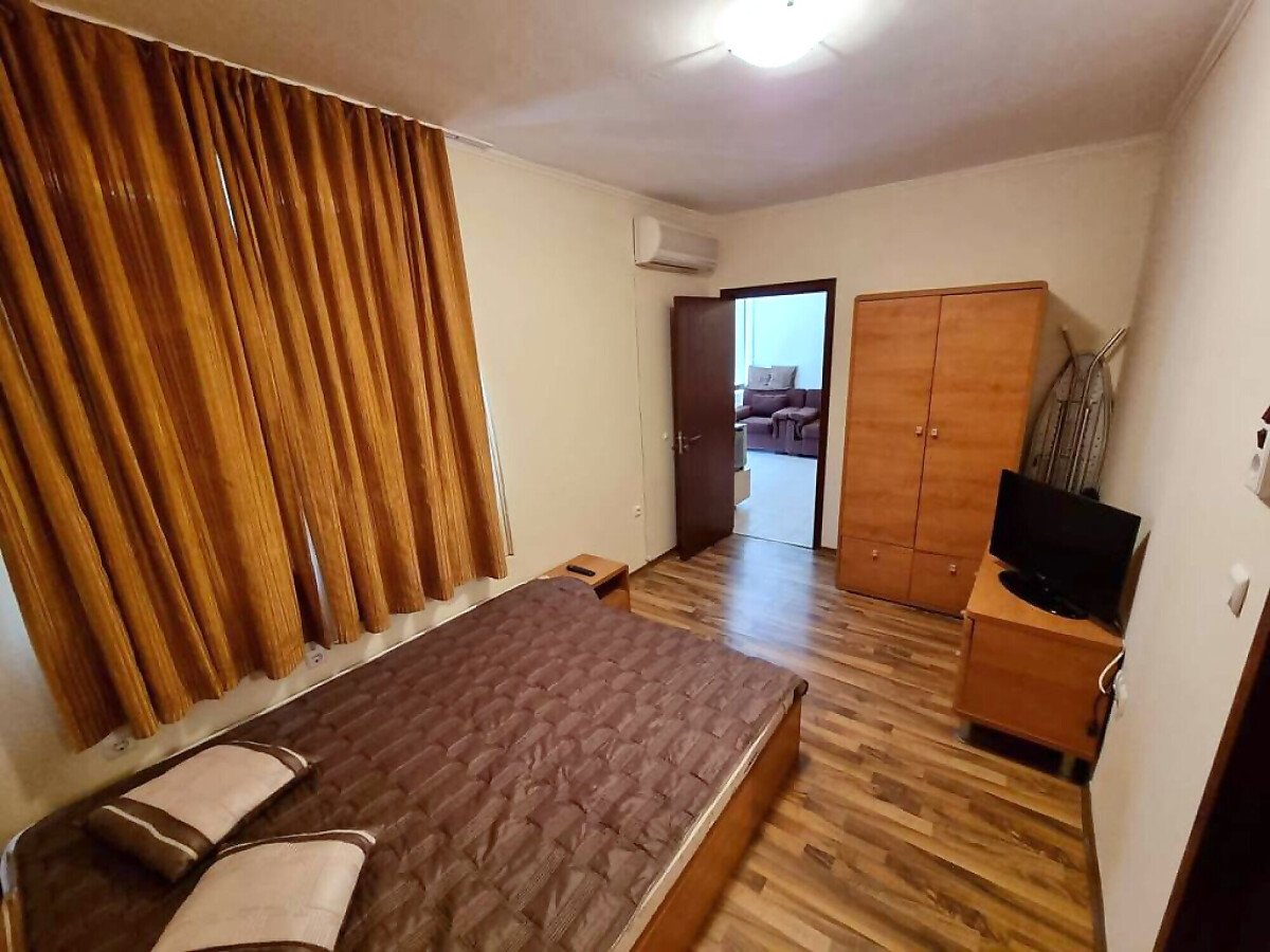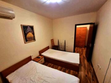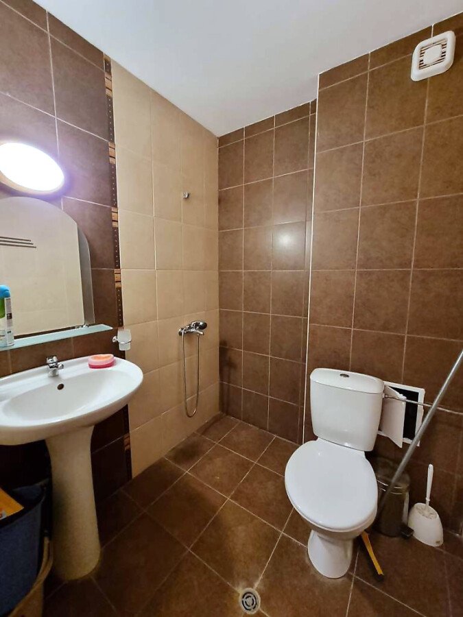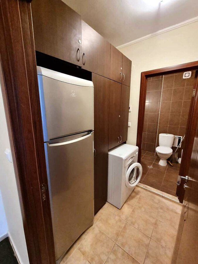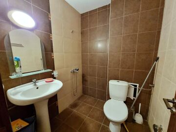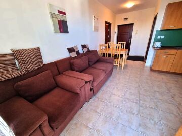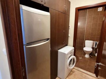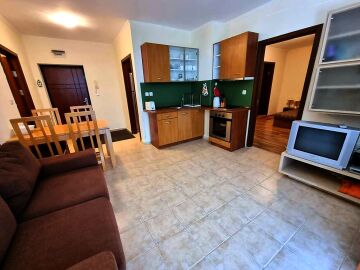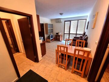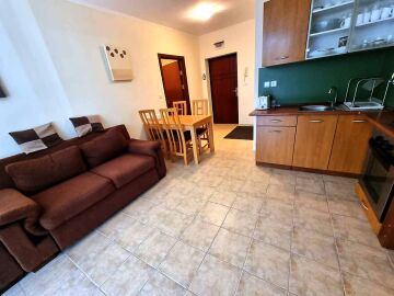 Апартаментът е просторен и функционален, със следното разпределение – голяма всекидневна с кухненски бокс и трапезария, мокро помещение, две бани с тоалетна, две спални, тераса с красива гледка към басейна. Продава се оборудван с всички необходими домакински електроуреди, напълно обзаведен, в много добро състояние, готов за нанасяне.
