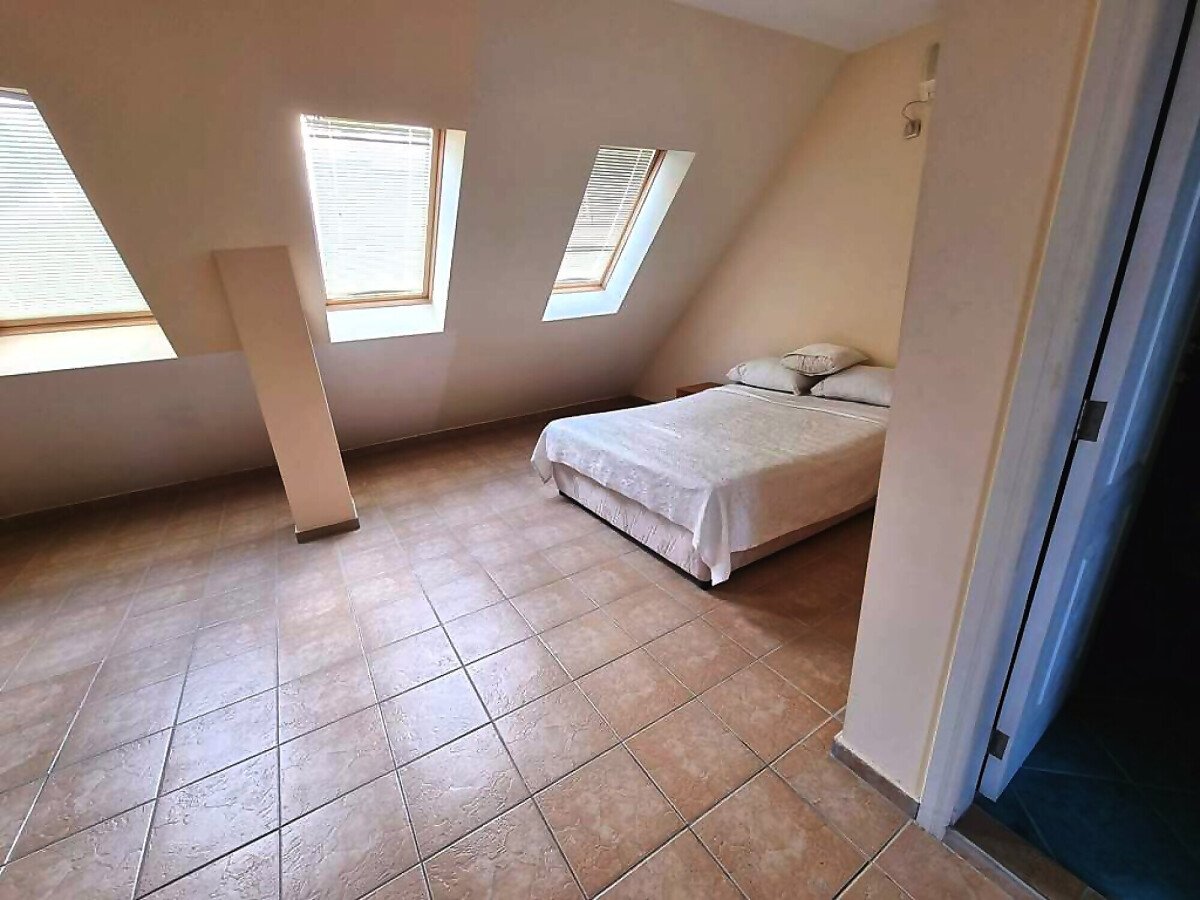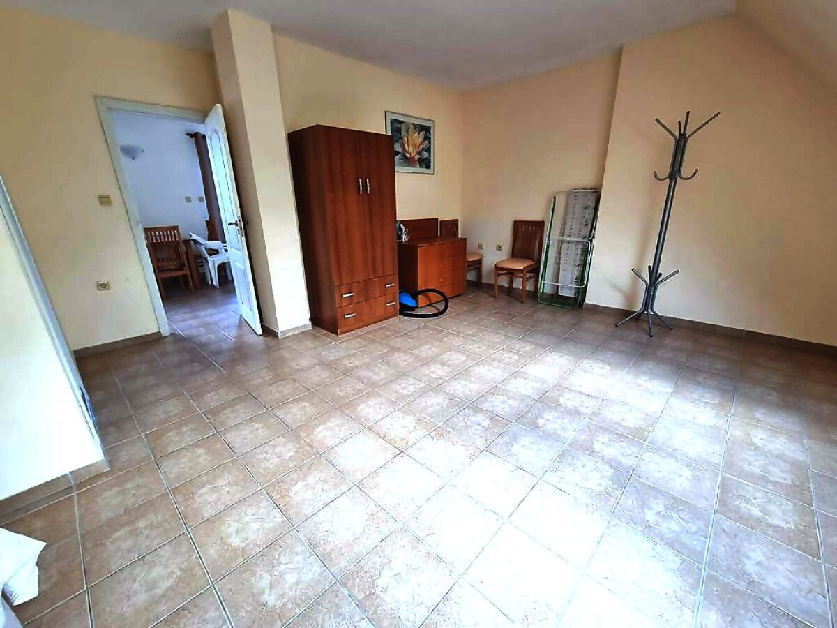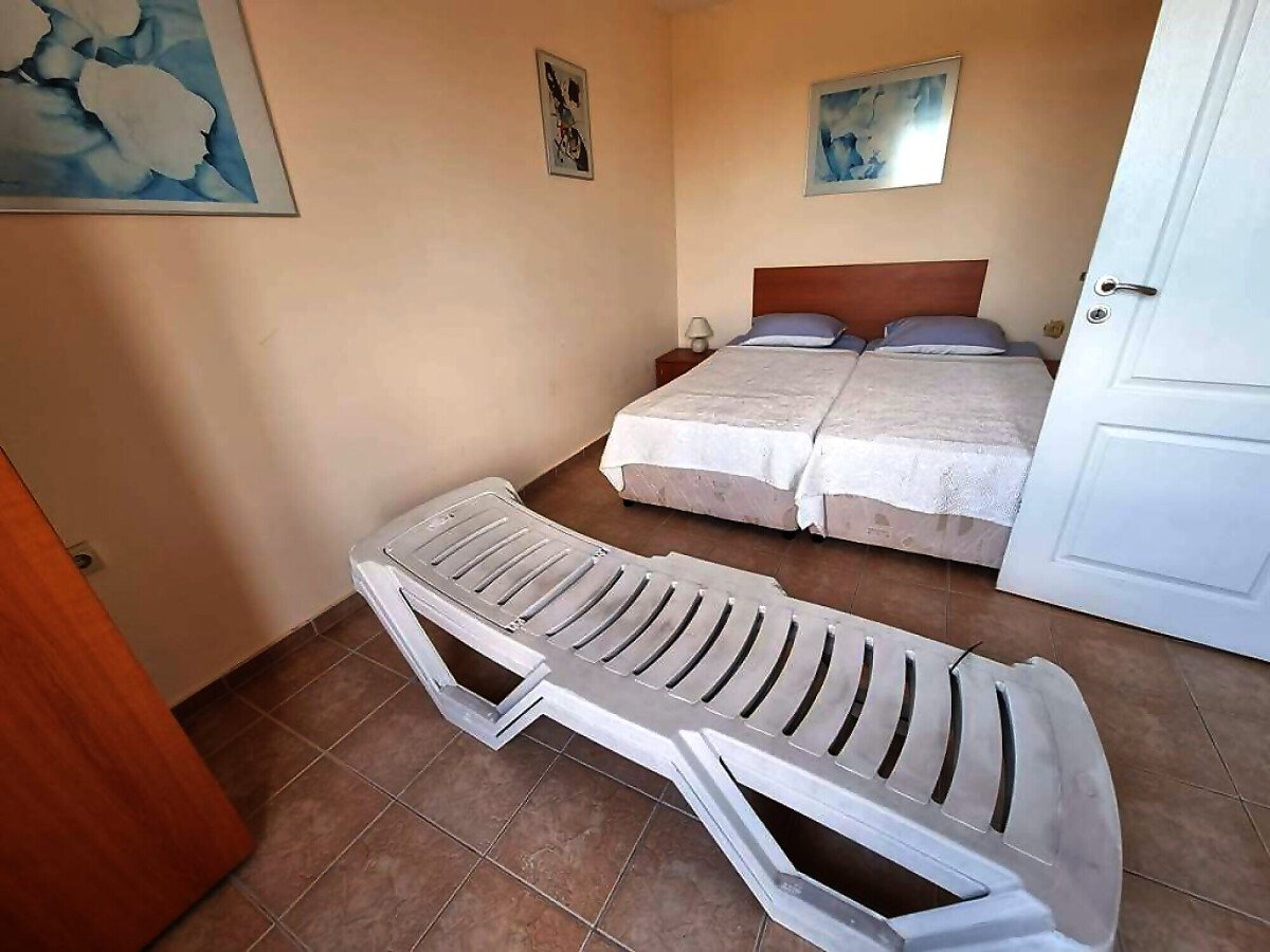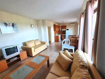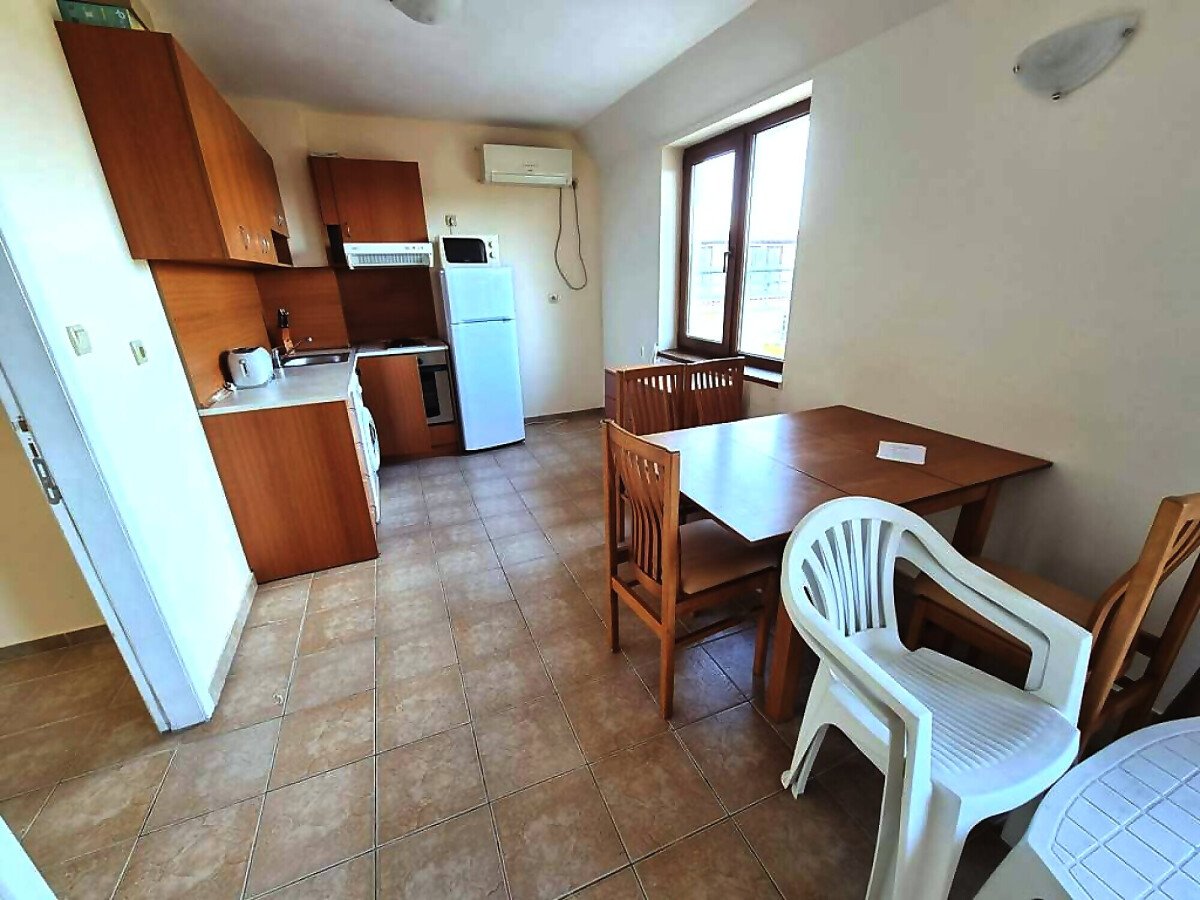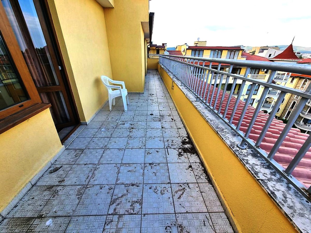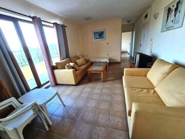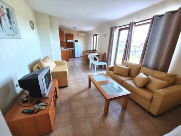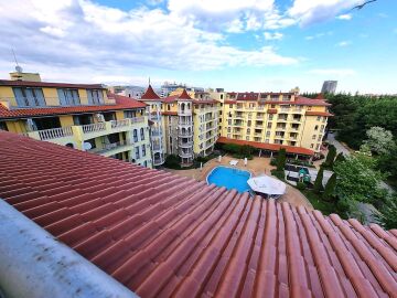 Апартаментът е много просторен, тип пентхаус. Разположен е на шести, последен етаж, като сградата разполага с асансьор. Състои се от голяма всекидневна с кухненски бокс, две спални, две бани с тоалетна, тераса с красива гледка към басейна и вътрешната част на комплекса. Продава се в отлично състояние, обзаведен, напълно оборудван с електроуреди, готов за нанасяне.