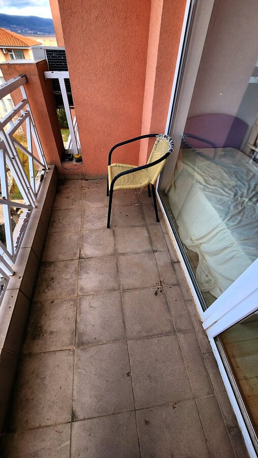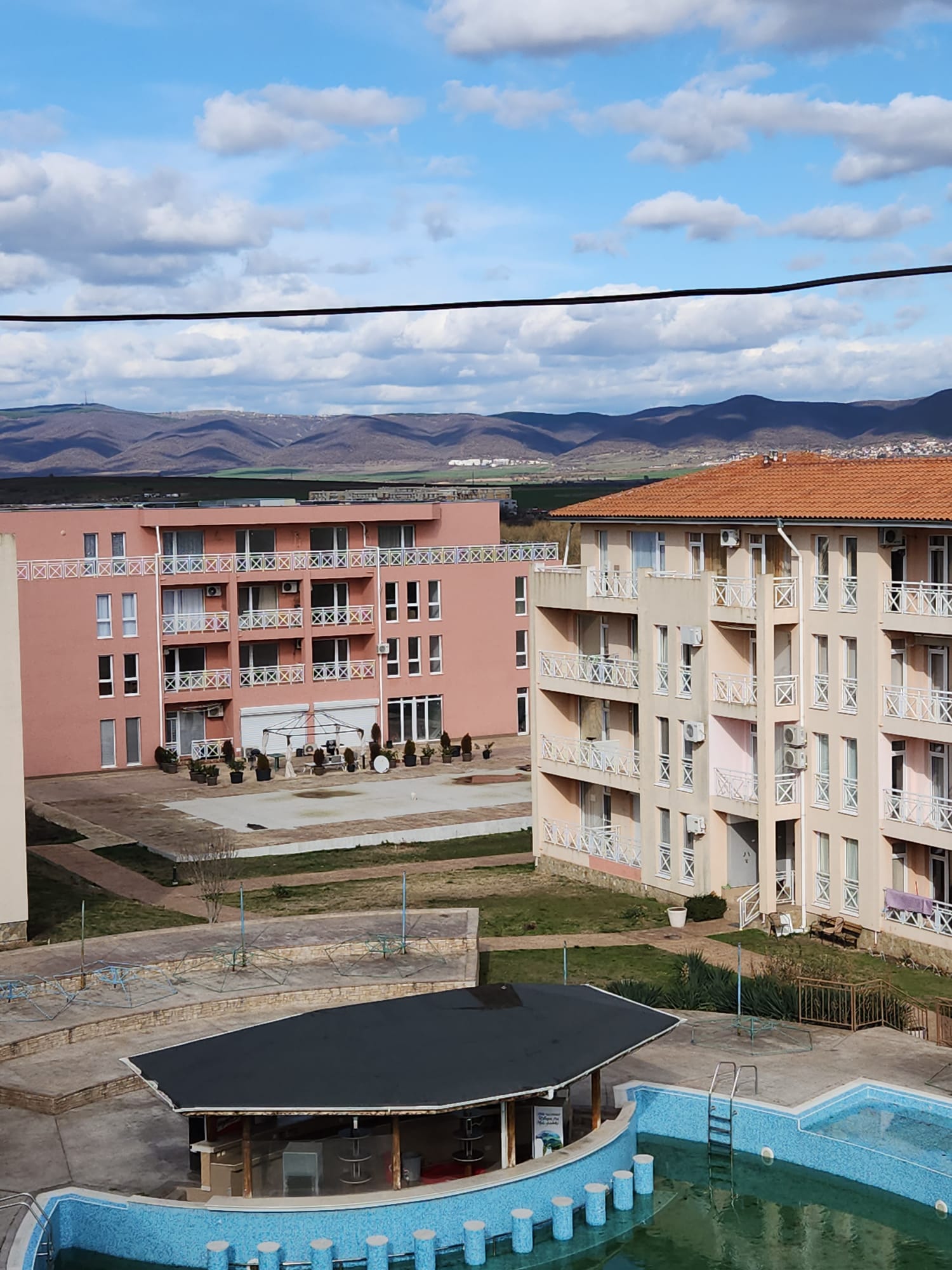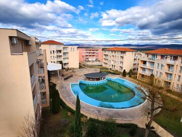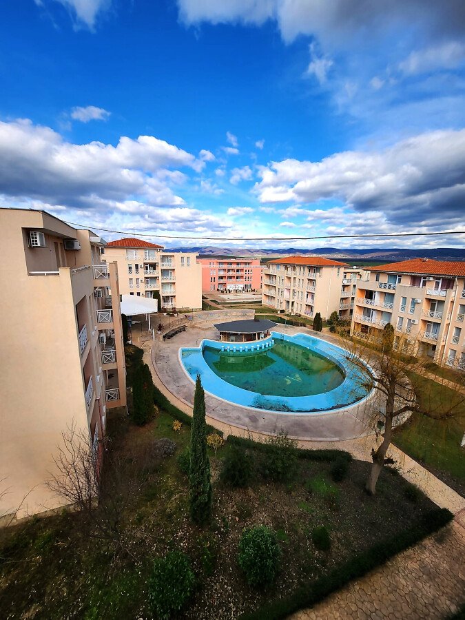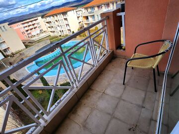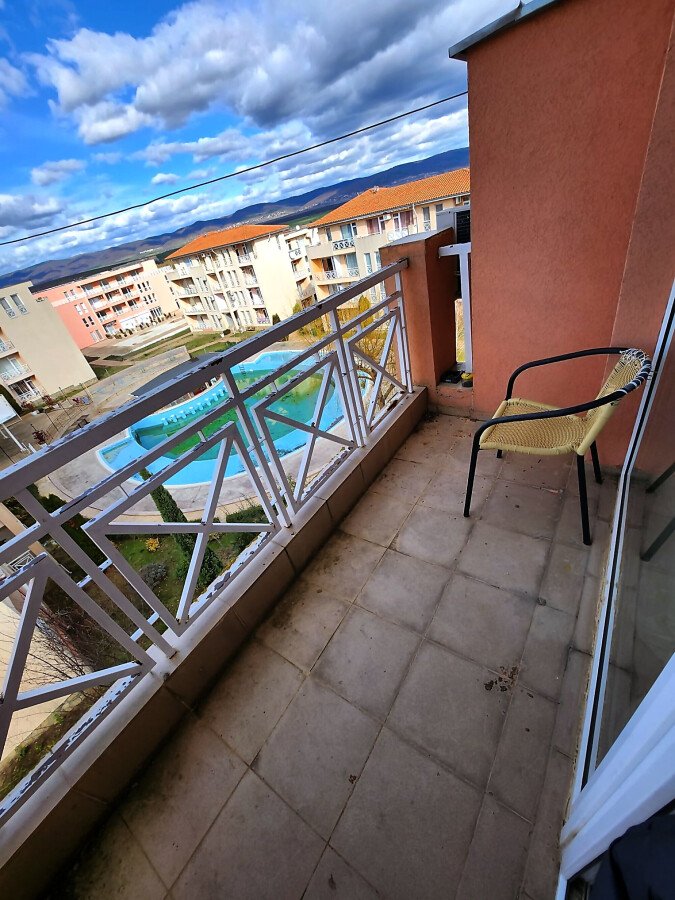 Гледката от терасата на студиото е към планината, басейна и вътрешната част на комплекса.