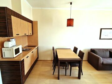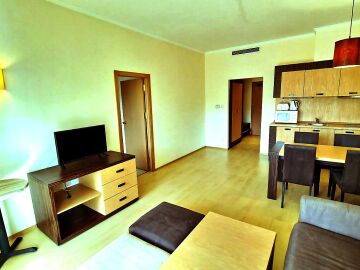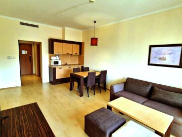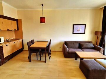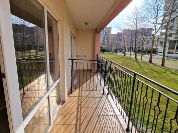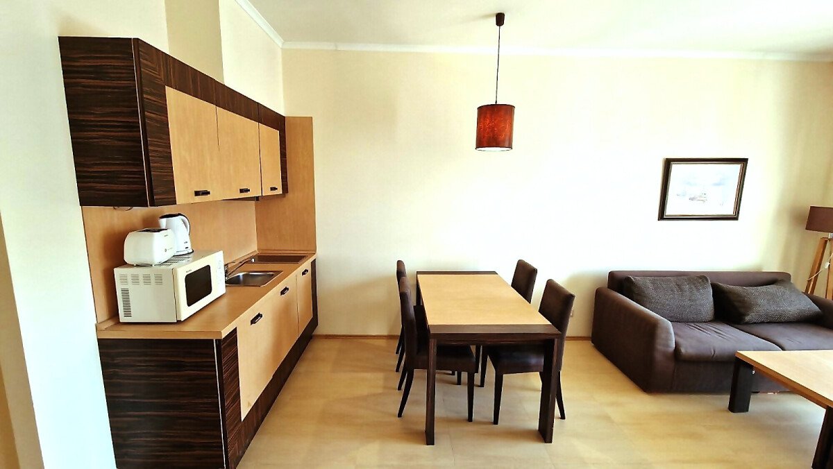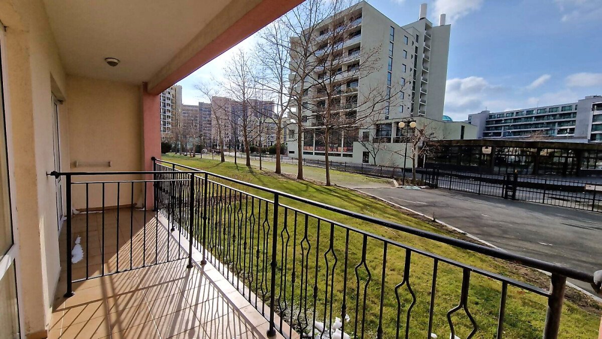 Имотът, който Ви предлагаме се намира на първия етаж, в тихата част на сградата. Състои се от входно антре, всекидневна с кухненски бокс и трапезария, баня с тоалетна и вана, спалня, тераса с гледка към градината. Продава се в отлично състояние, напълно оборудван с необходимата техника, обзаведен с хубави мебели, готов за нанасяне.