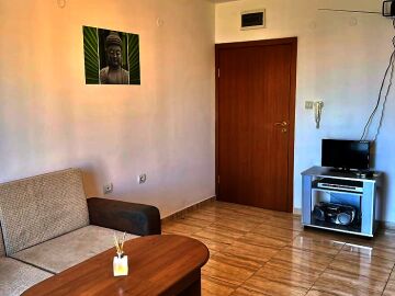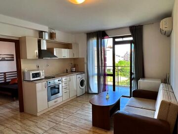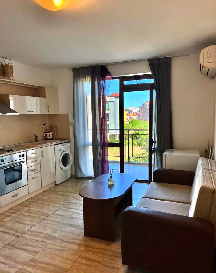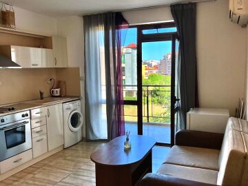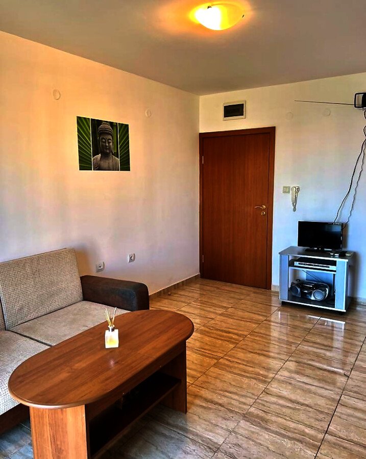 Апартаментът е много функционален, със следното разпределение – всекидневна с кухненски бокс, спалня, баня с тоалетна и душ кабина, тераса. Продава се напълно оборудван с необходимата домакинска електротехника, обзаведен, в много добро състояние, готов за нанасяне. Такса поддръжка на този имот е 600 евро за година.