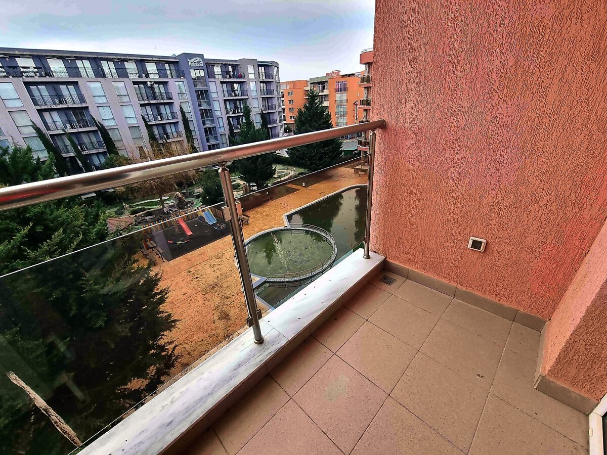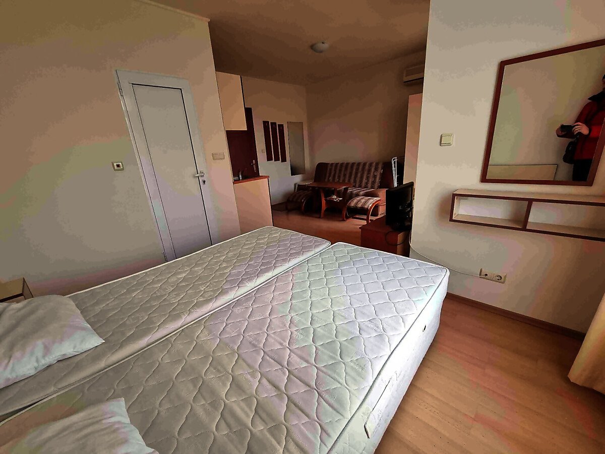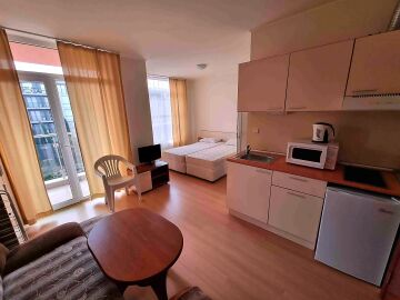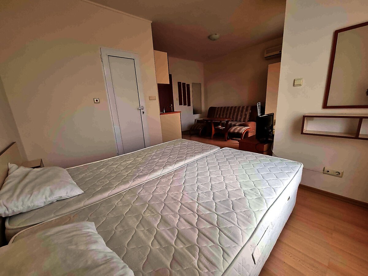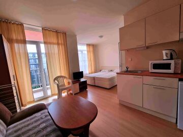 Студиото е добре обзаведено, много функционално, готово за нанасяне. Разположено е на четвърти етаж, като сградата разполага с асансьор. Състои се от всекидневна с кухненски бокс и обособена спалня, баня с тоалетна и душ кабина, тераса с чудесна гледка към басейна. Такса поддръжка на жилището е 10 евро за кв.м., годишно. Продава се с мебели и домакинска техника, в много добро състояние.