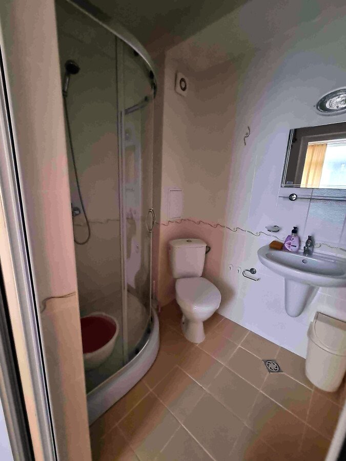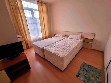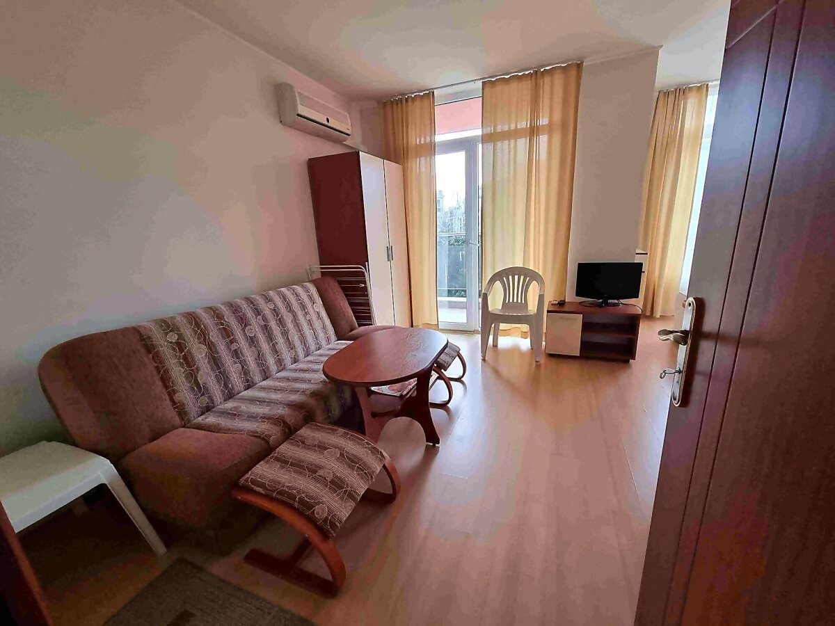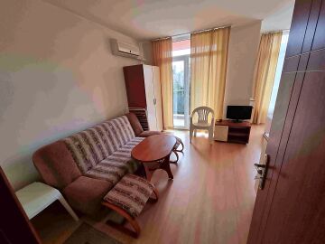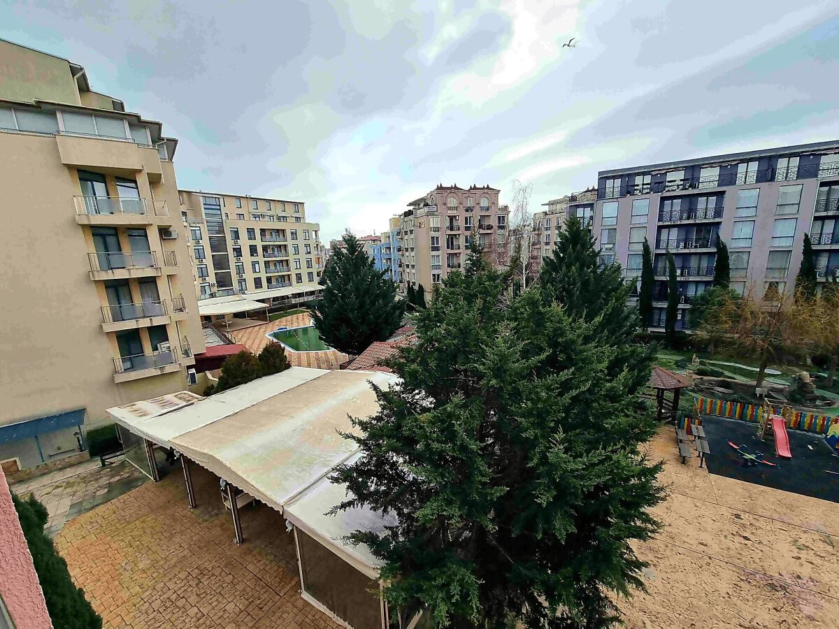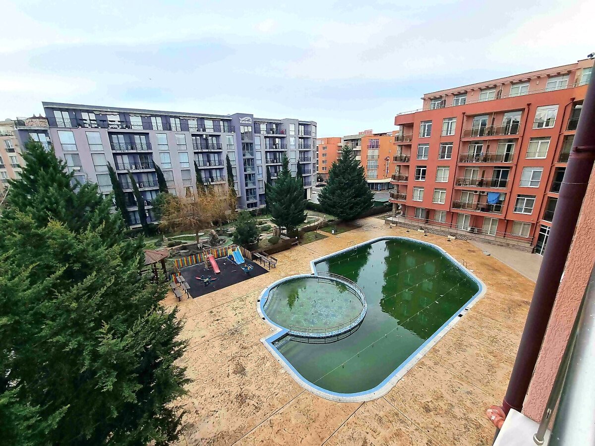 Студиото е добре обзаведено, много функционално, готово за нанасяне. Разположено е на четвърти етаж, като сградата разполага с асансьор. Състои се от всекидневна с кухненски бокс и обособена спалня, баня с тоалетна и душ кабина, тераса с чудесна гледка към басейна. Такса поддръжка на жилището е 10 евро за кв.м., годишно. Продава се с мебели и домакинска техника, в много добро състояние.