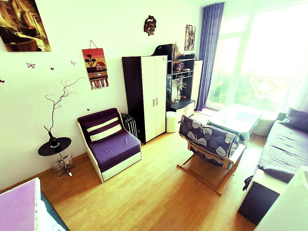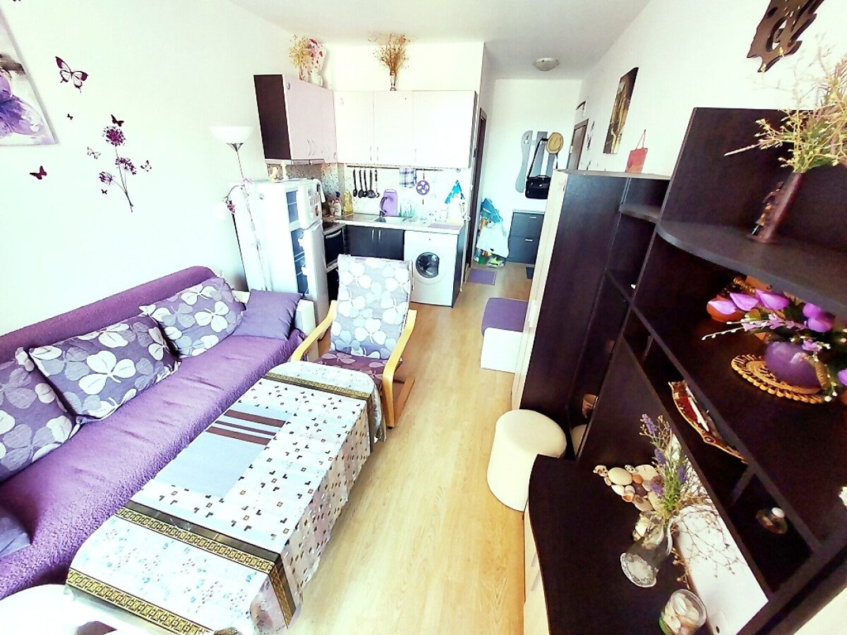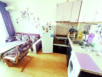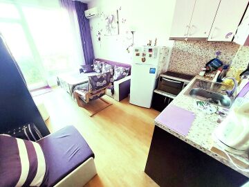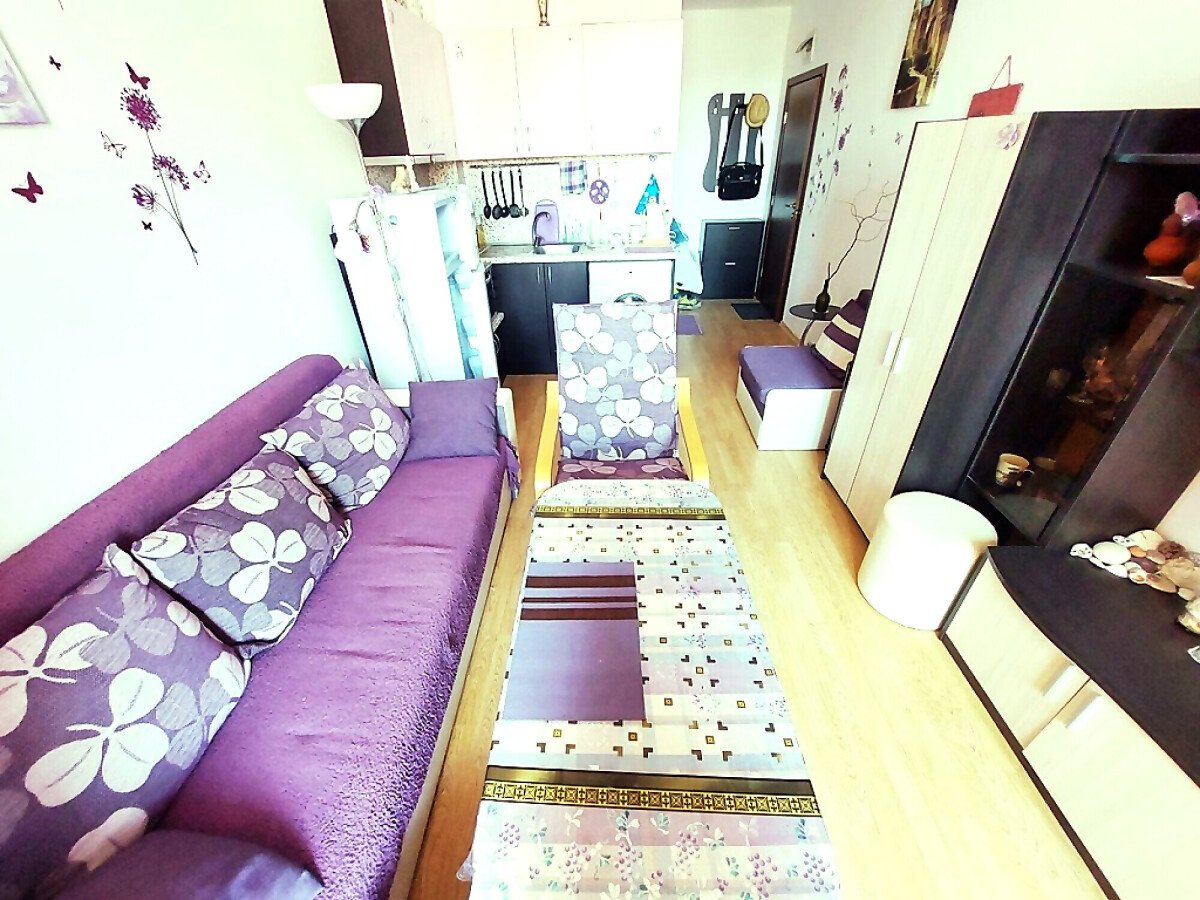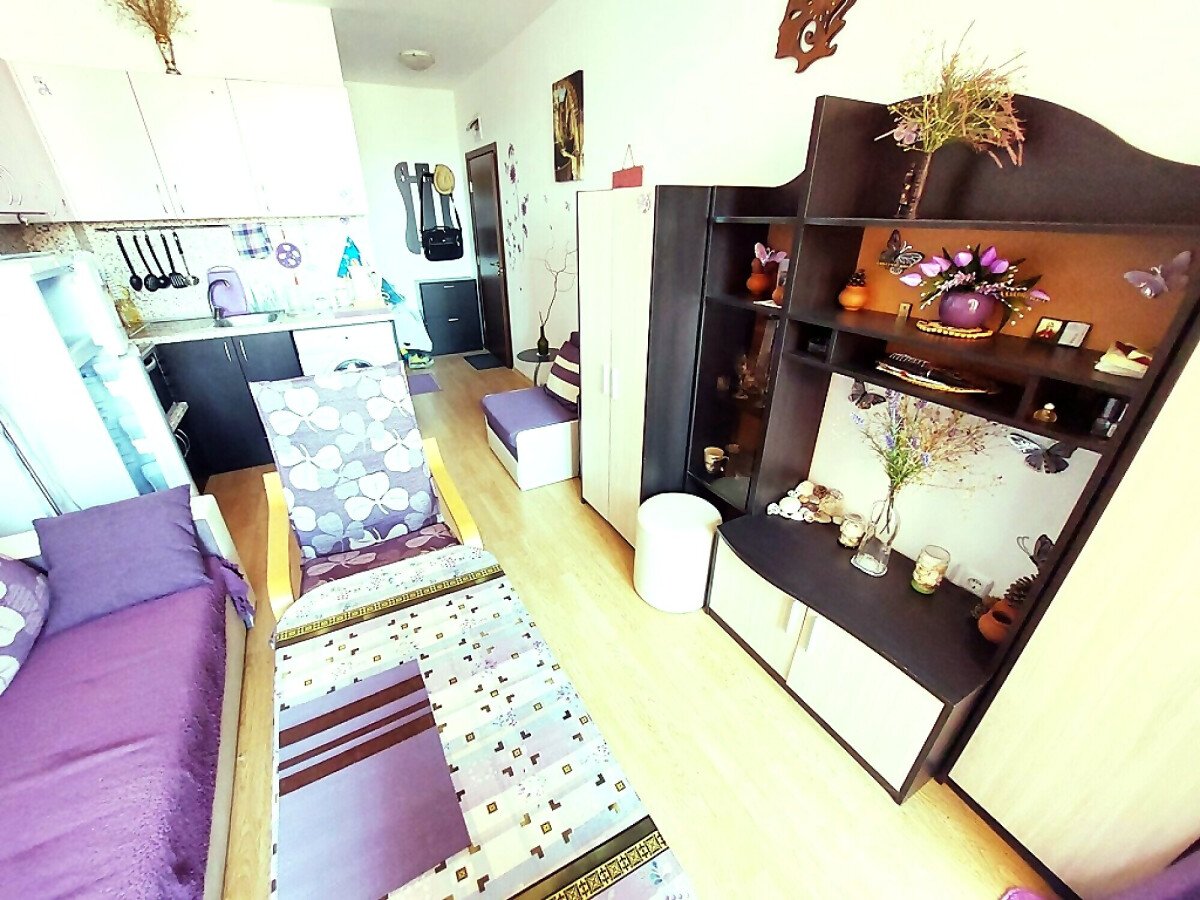 Студиото, което предлагаме, е напълно обзаведено и оборудвано с домакинска техника. Състои се от входно антре, всекидневна с кухненски бокс, баня с тоалетна, тераса с гледка към градината.