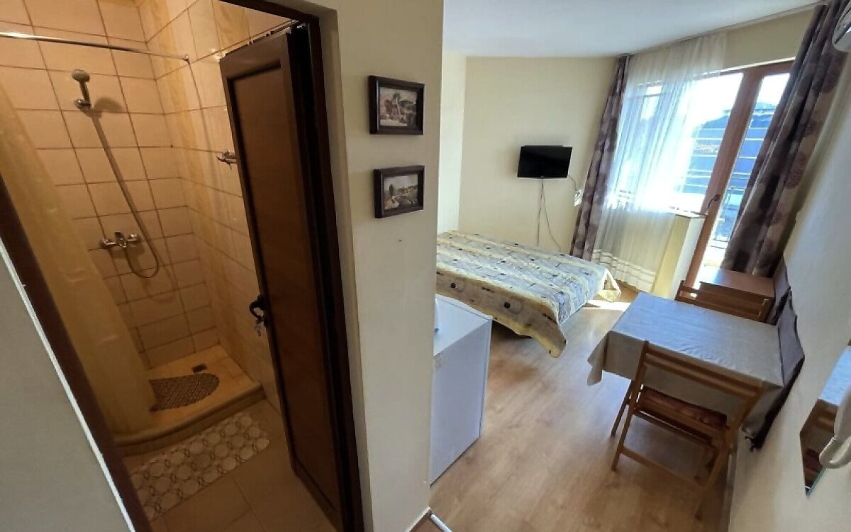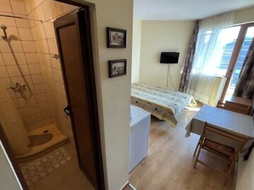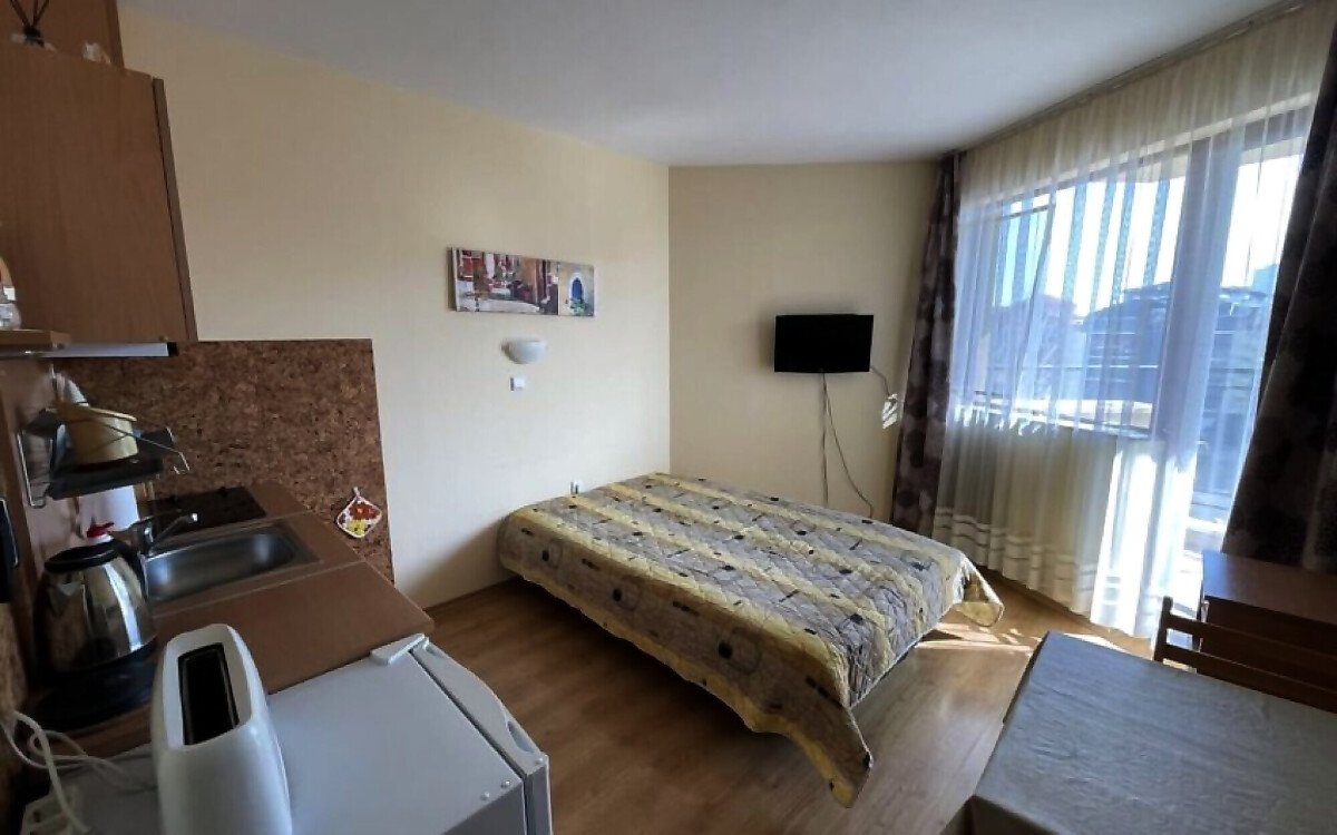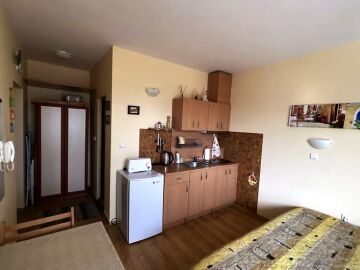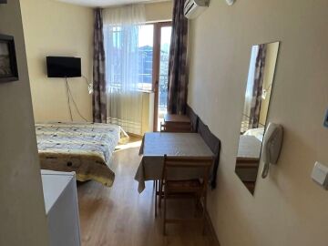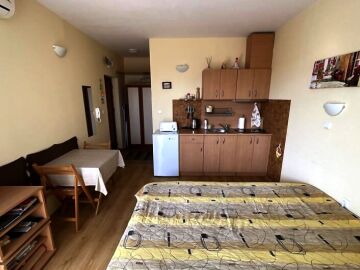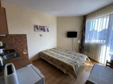 Студиото е разположено на четвърти етаж, в сграда с асансьор и има следното разпределение – входно антре, голяма всекидневна със спалня, кухненски бокс и кът за хранене, баня с тоалетна, тераса. Продава се с всичко необходимо за комфортен престой и живеене, оборудвано с техника, напълно обзаведено, готово за нанасяне.