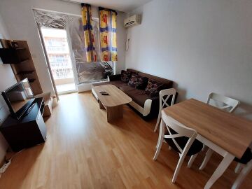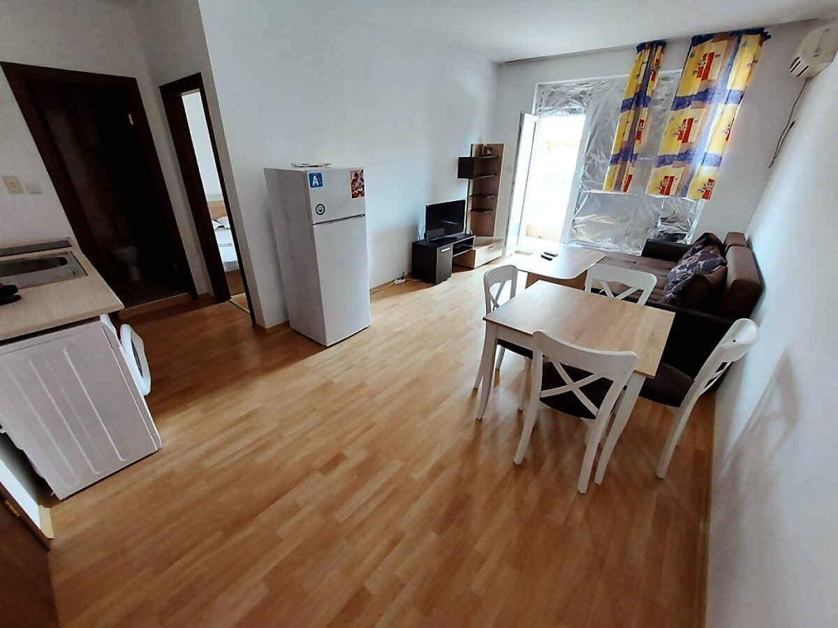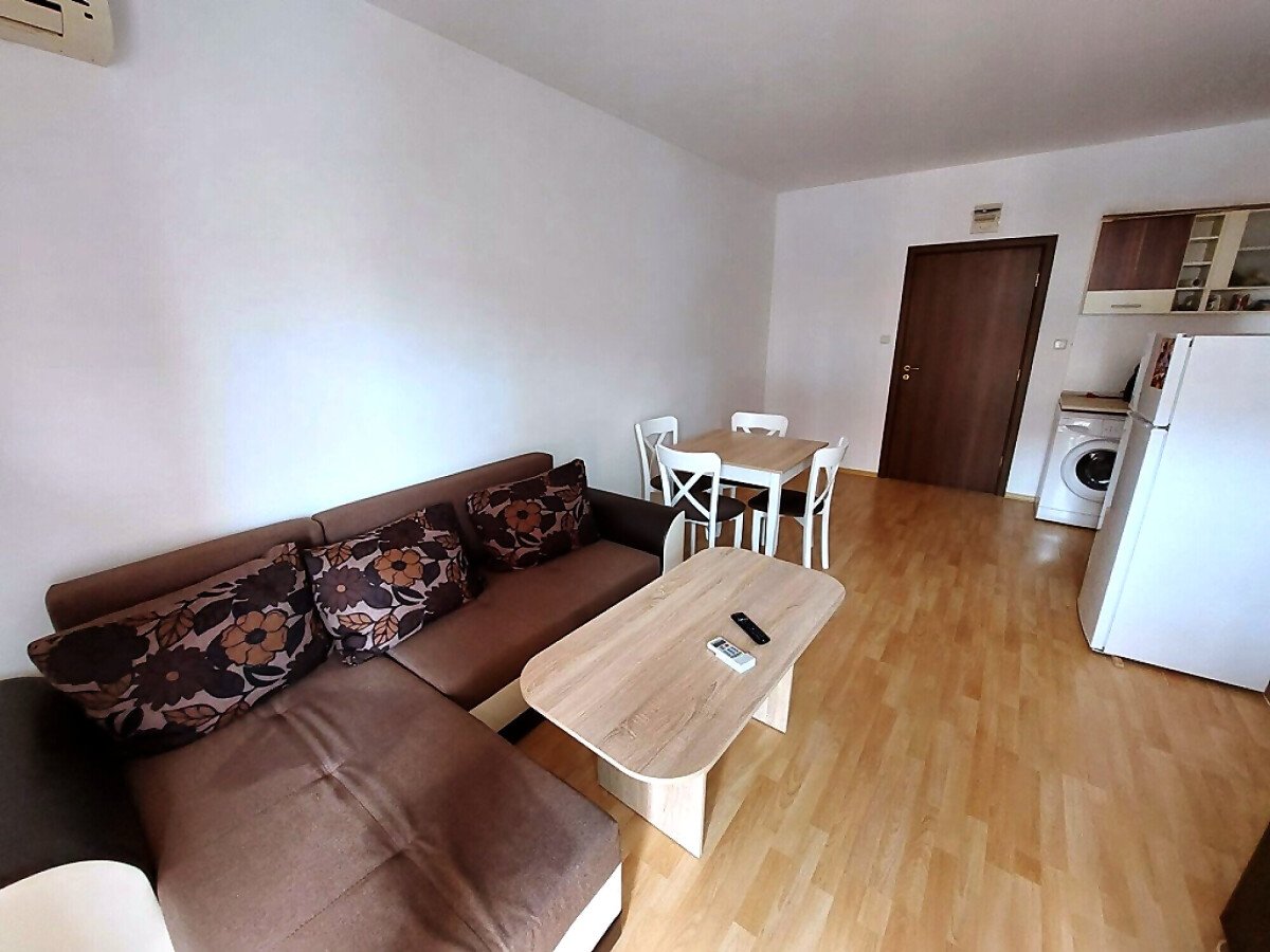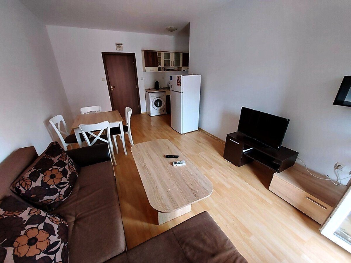 Апартаментът е много функционален, със следното разпределение – голяма всекидневна с трапезария и кухненски бокс, спалня, баня с тоалетна, тераса с гледка към басейна и вътрешната част на комплекса. Продава се с техника и хубаво обзавеждане, готов за нанасяне.