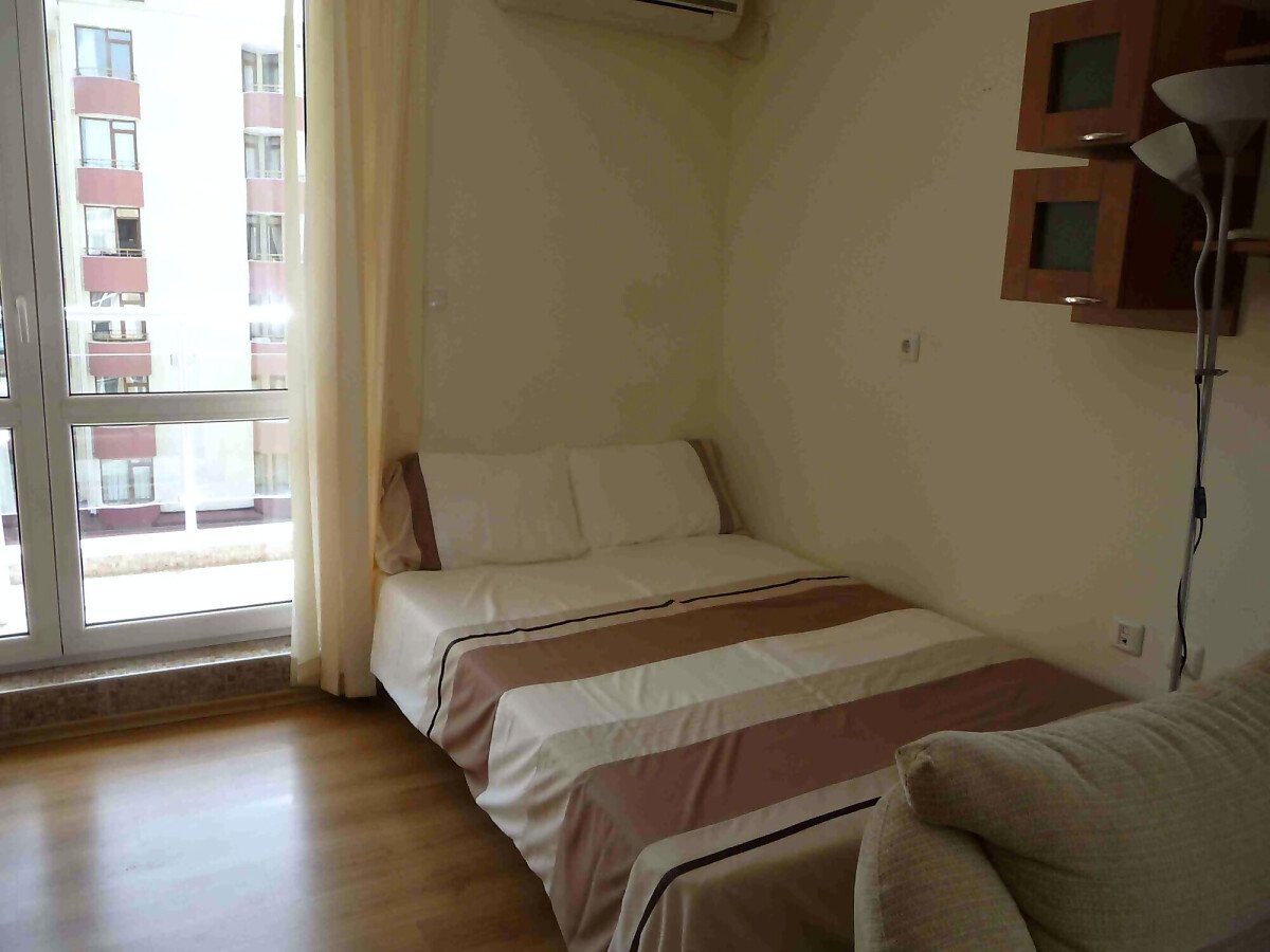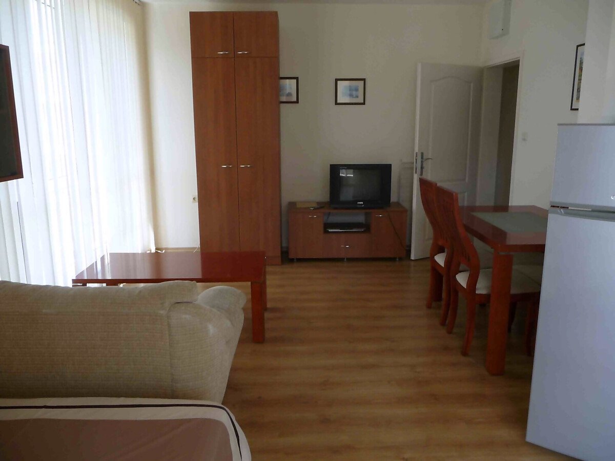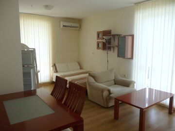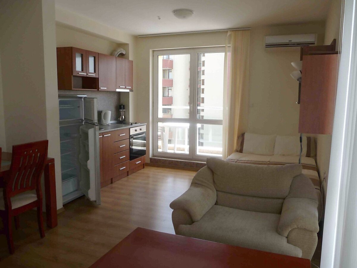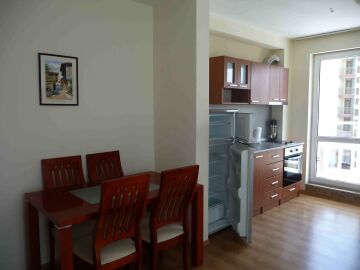 Студиото е разположено на пети етаж, в сграда с асансьор. Състои се от входно антре, голяма всекидневна с обособен кът за хранене и кухненски бокс, баня с тоалетна, тераса с гледка към басейна. Продава се в добро състояние, обзаведено и оборудвано с всичко необходимо за комфортен престой, готово за нанасяне. Такса поддръжка за това жилище е 10 евро за кв.м., годишно.