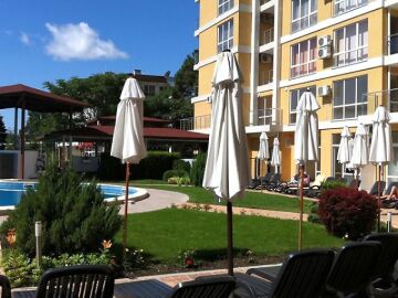 Комплексът е добре поддържан и разполага с голям външен басейн, красива озеленена градина, зона за барбекю, детска площадка, паркинг.
