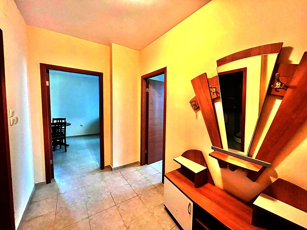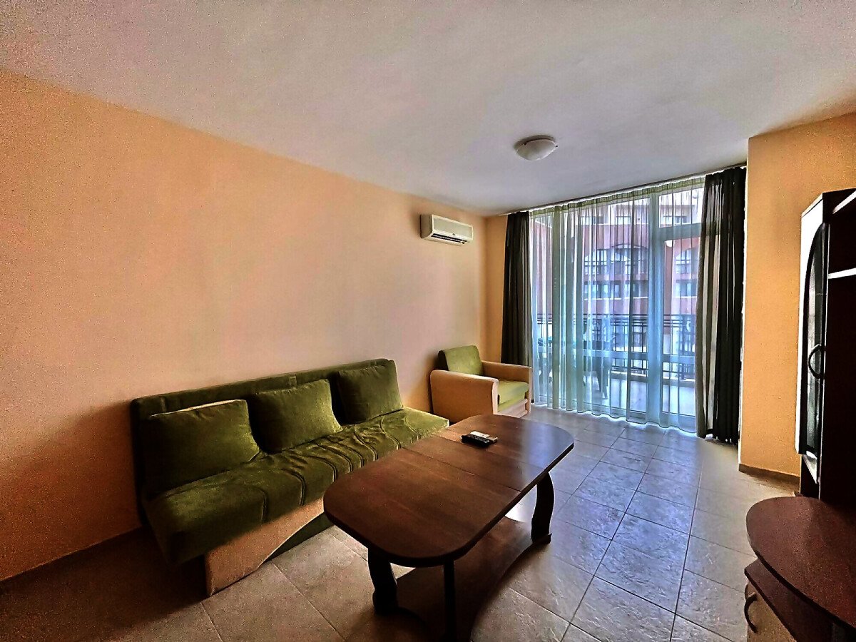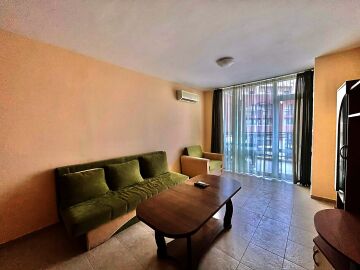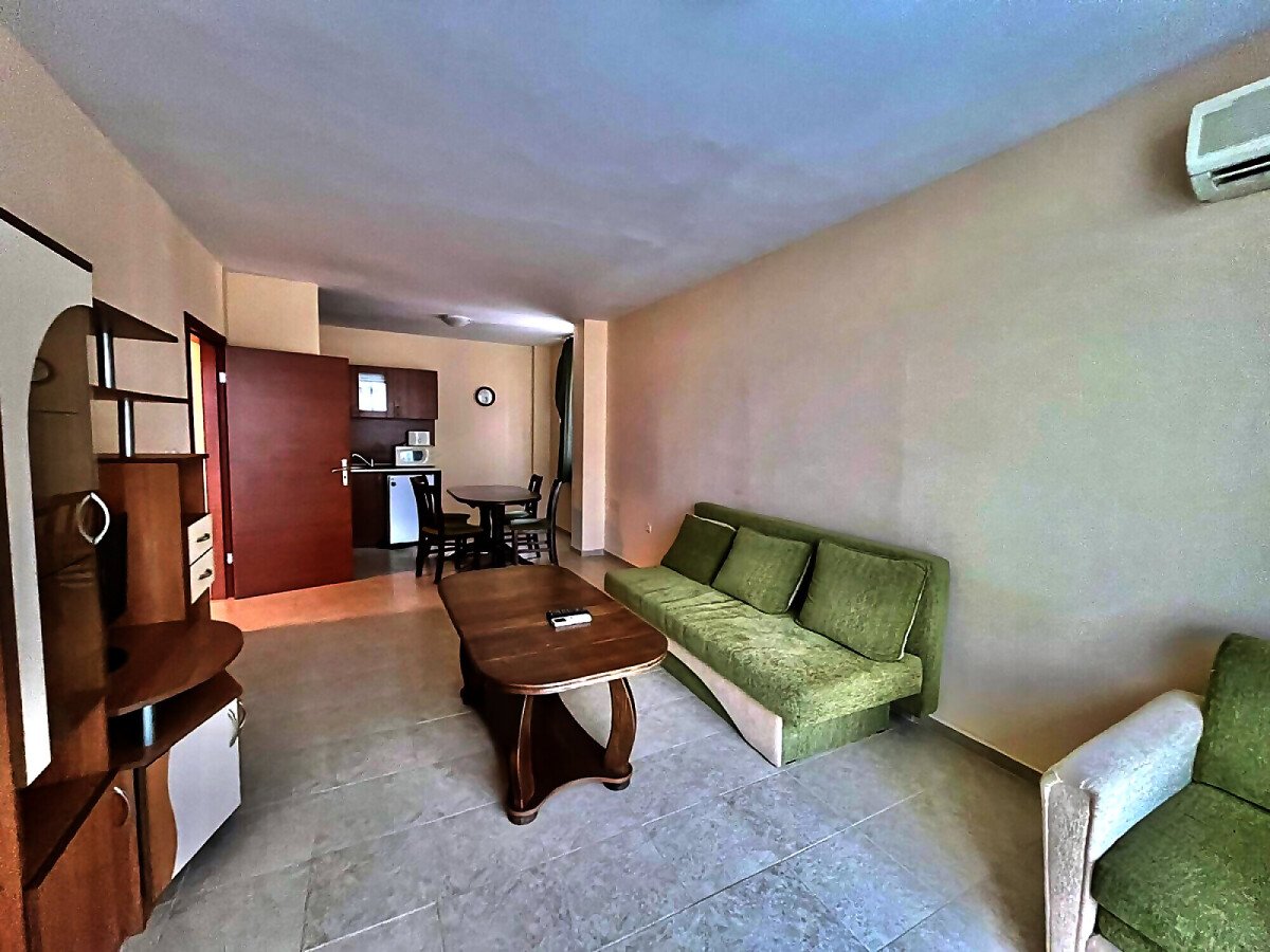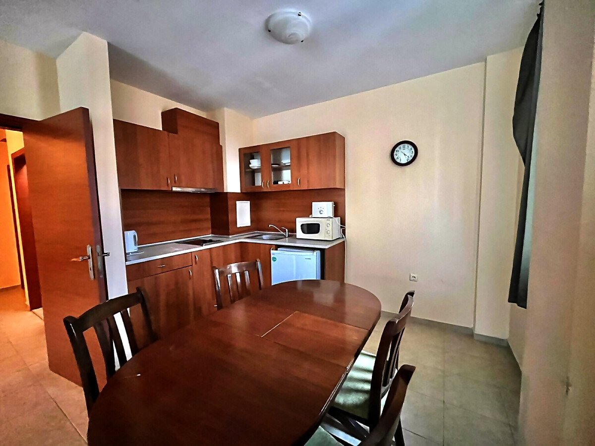 Апартаментът е много просторен и слънчев, със следното разпределение – входно антре, голяма всекидневна с обособен кът за хранене и кухненски бокс, спалня, баня с тоалетна и душ кабина, тераса с красива гледка към басейна. Продава се в отлично състояние, с оборудване и мебели – всичко необходимо за комфортен престой! Годишната такса поддръжка на този имот е 9,6 евро за кв.м.
