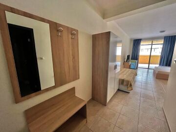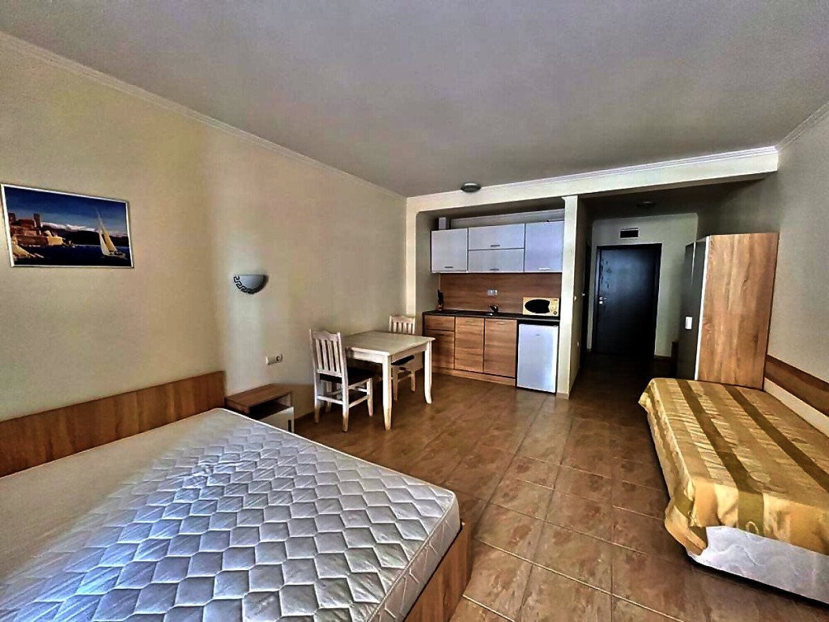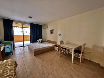 Студиото е много просторно и функционално, със следното разпределение – входно антре, всекидневна с кухненски бокс, кът за хранене и обособена спалня, баня с тоалетна и душ кабина, тераса с красива гледка към морето и вътрешната част на комплекса. Продава се напълно обзаведено и оборудвано с всичко необходимо за Вашето удобство и комфорт!