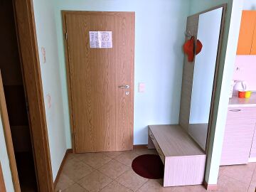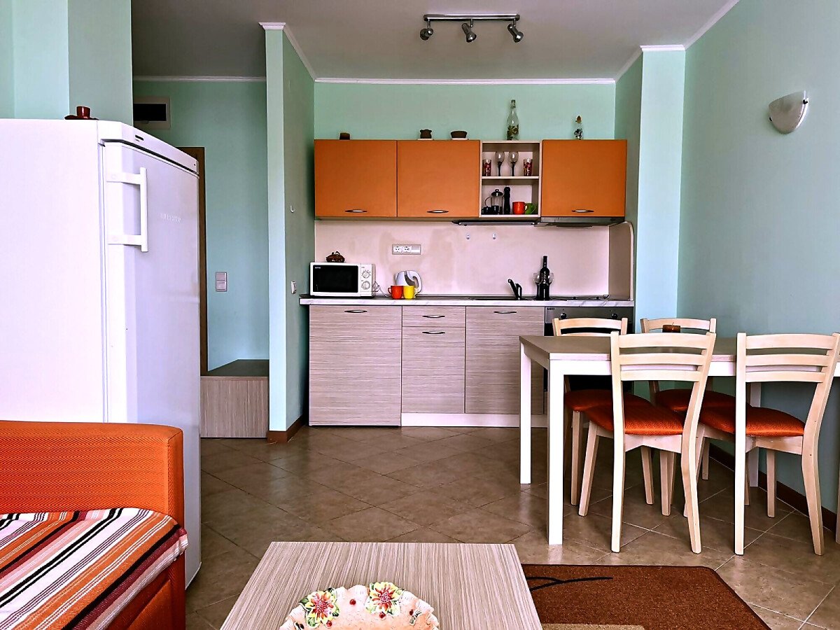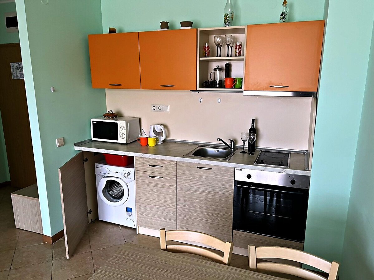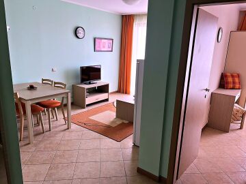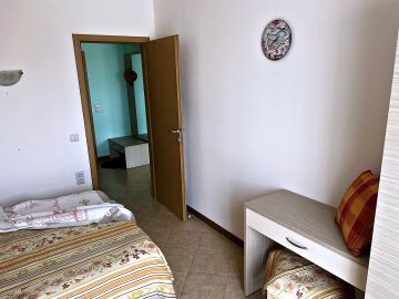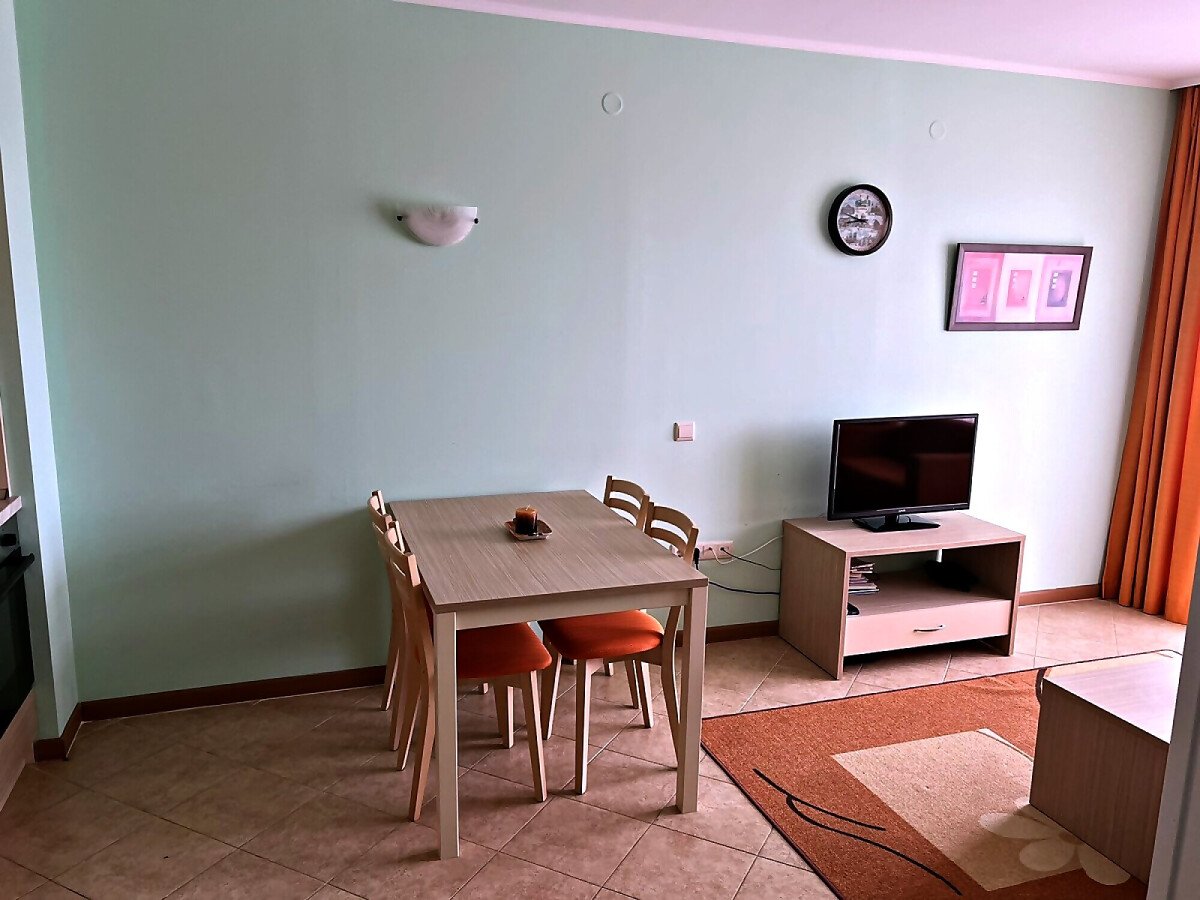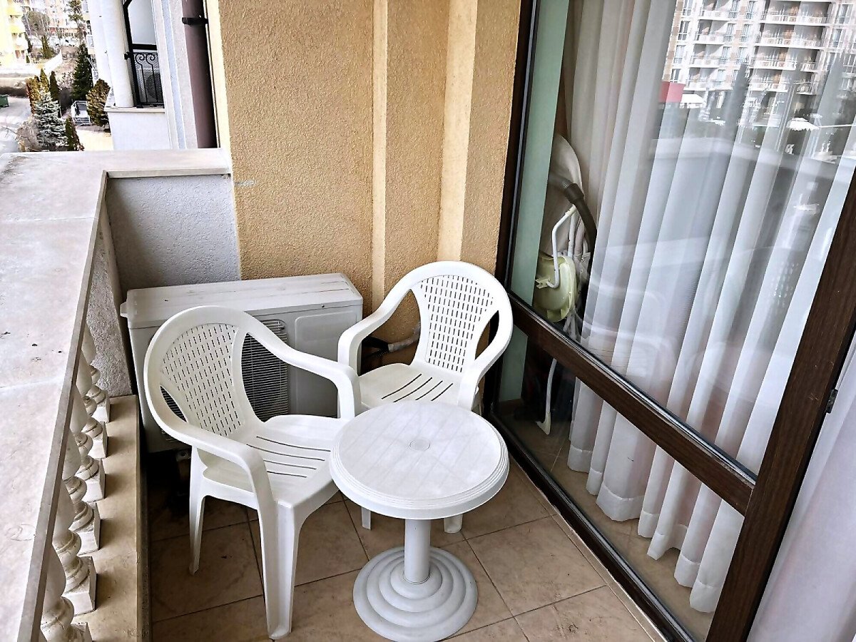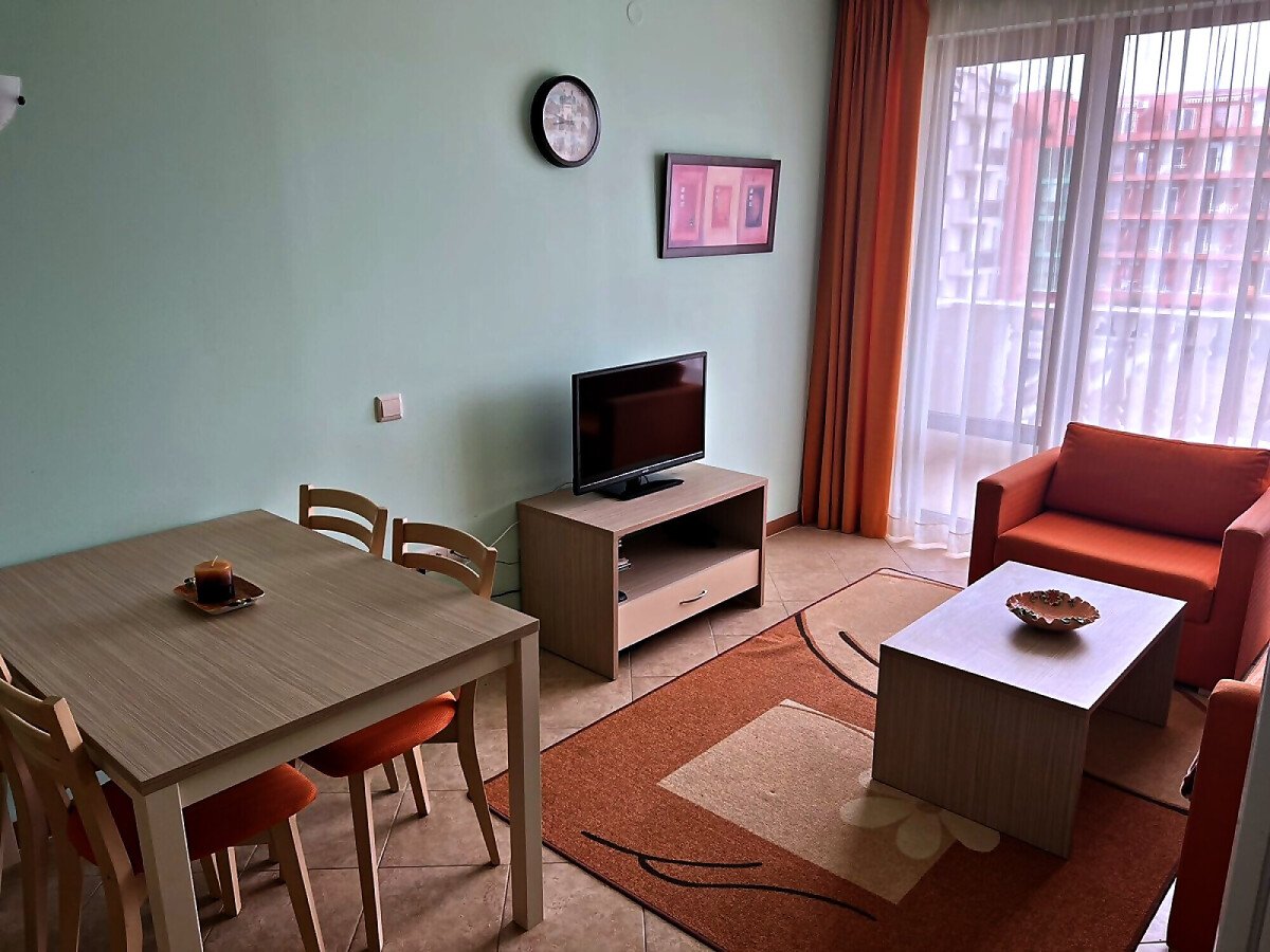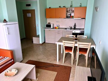 Апартаментът е уютен и светъл, със следното разпределение – входно антре, всекидневна с кът за хранене и кухненски бокс, спалня, баня с тоалетна и вана, тераса. Продава се в отлично състояние, напълно оборудван с домакински електроуреди, обзаведен с хубави мебели, готов за нанасяне. Такса поддръжка за този комплекс е в размер на 12 евро за кв.м., годишно.