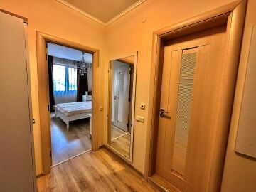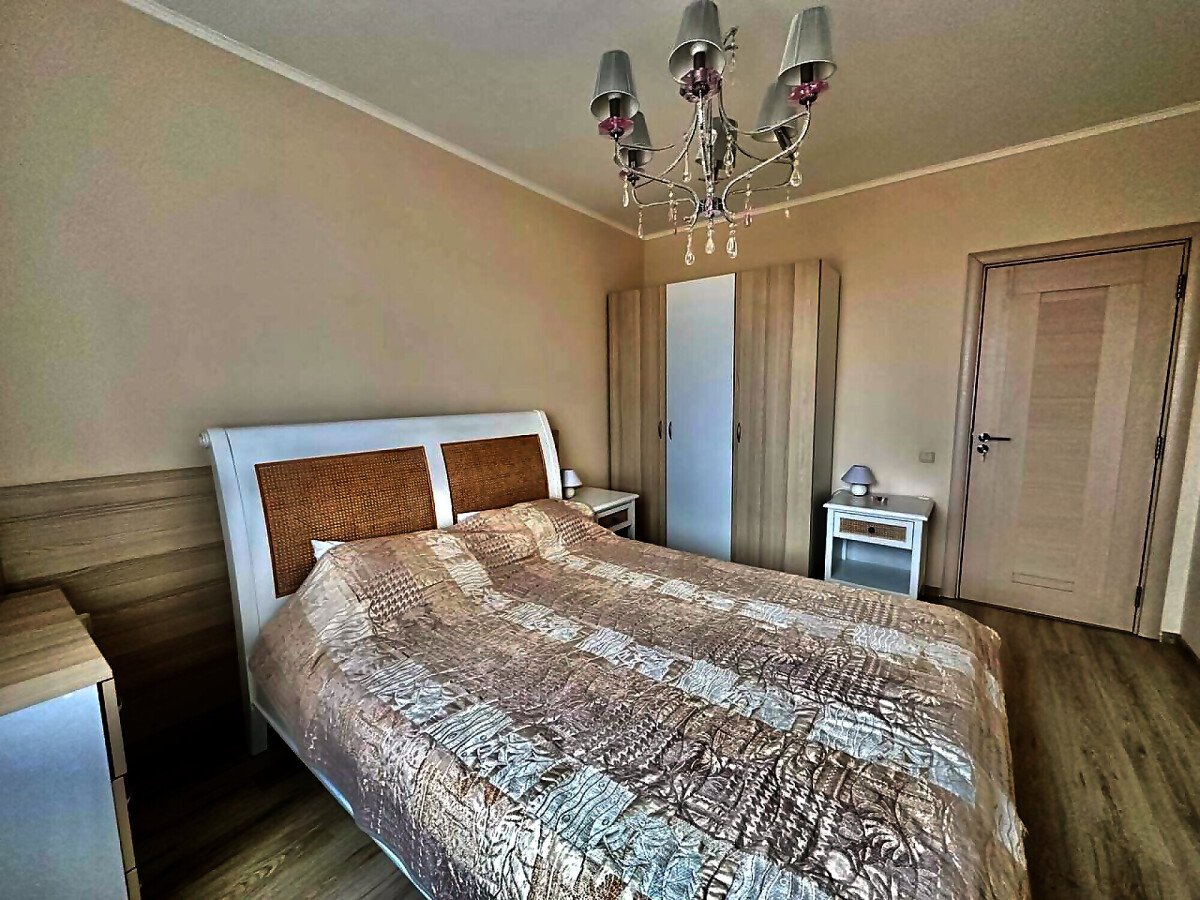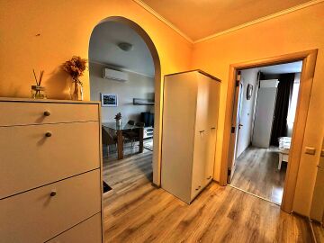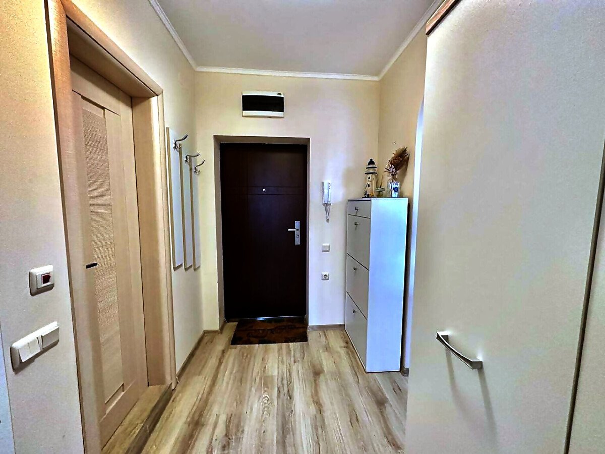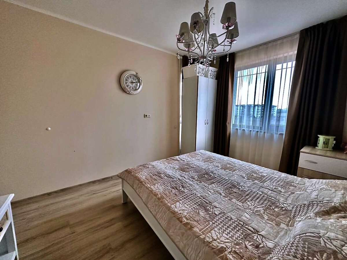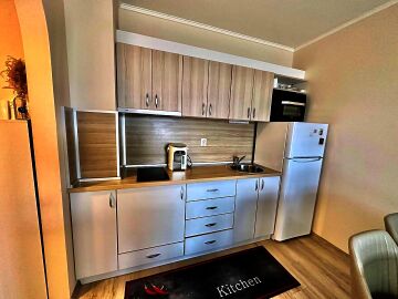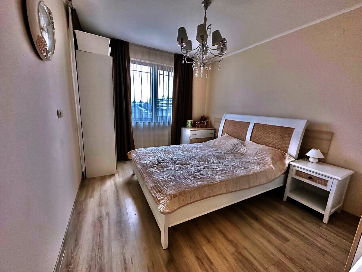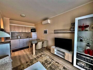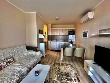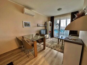 Апартаментът е стилно обзаведен и много функционален, със следното разпределение – входно антре, всекидневна с кухненски бокс и обособен кът за хранене, спалня, баня с тоалетна и голяма тераса. Терасата е уютно обзаведена и много подходяща за релакс през топлите месеци. Жилището се продава мебелирано и оборудвано с всичко необходимо, готово за нанасяне.