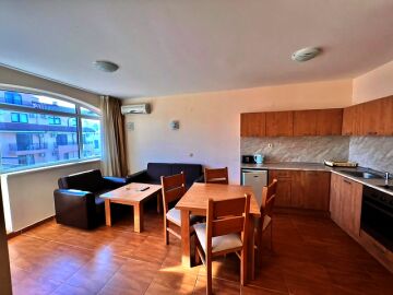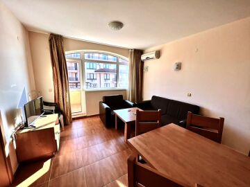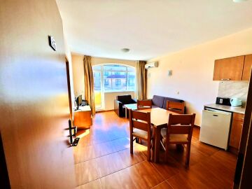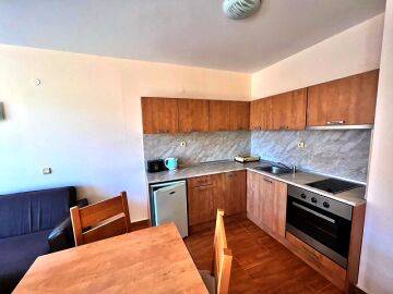 Апартаментът е със следното разпределение – входно антре, всекидневна с кухненски бокс и обособен кът за хранене, спалня, баня с тоалетна, тераса с красива гледка към морето.