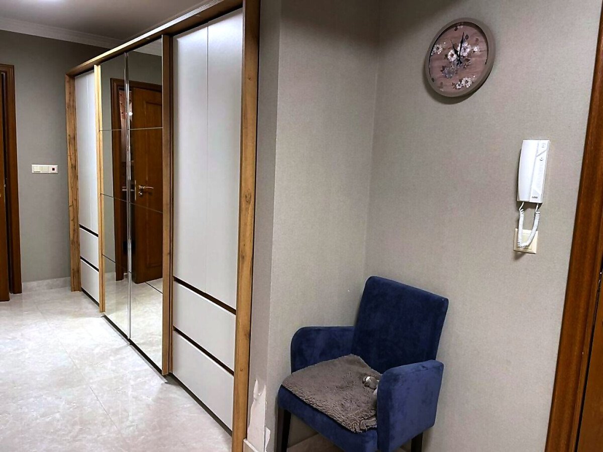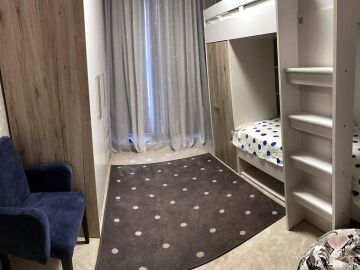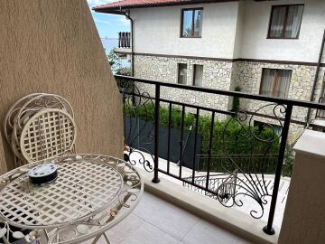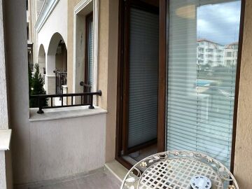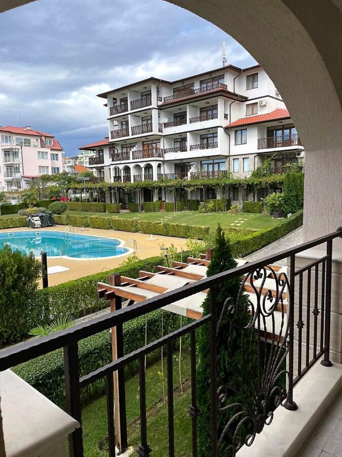 Апартаментът, който предлагаме, е стилно обзаведен и много функционален, със следното разпределение – входно антре, всекидневна с обособен кухненски бокс и кът за хранене, две спални, баня с тоалетна и душ кабина, отделна тоалетна, тераса с прекрасна гледка към морето, басейна и вътрешната територия на комплекса. Продава се в отлично състояние, мебелиран с качествени мебели, напълно оборудван, готов за нанасяне. Годишната такса поддръжка за този прекрасен имот е 600 евро.