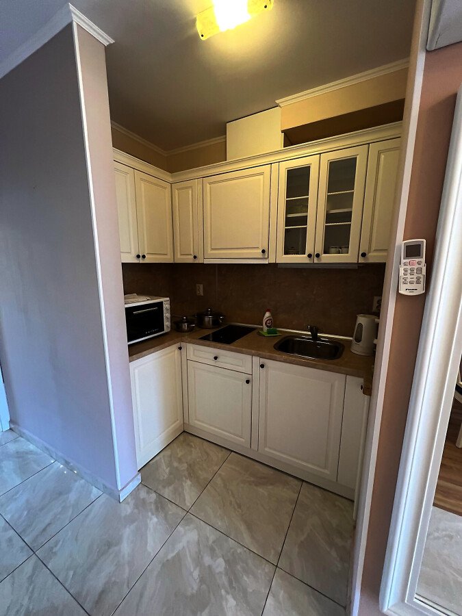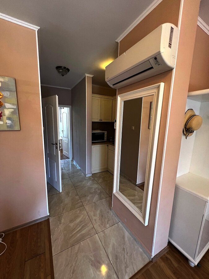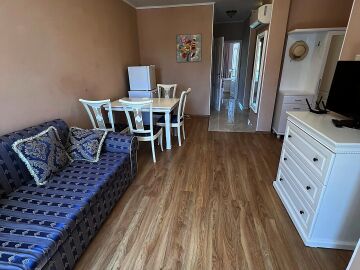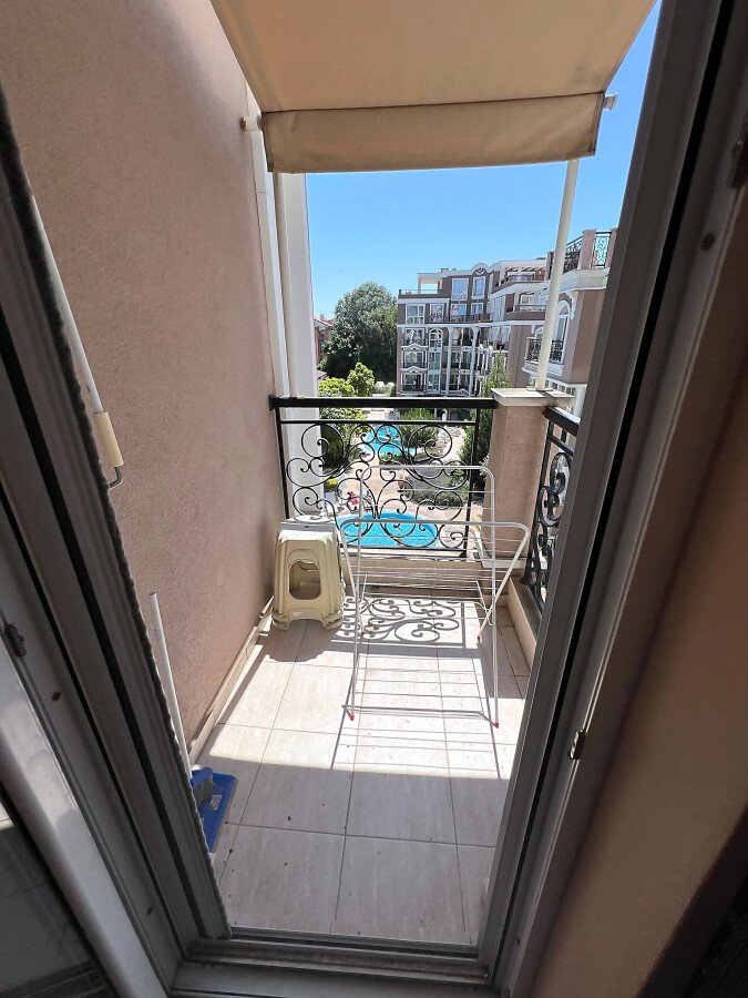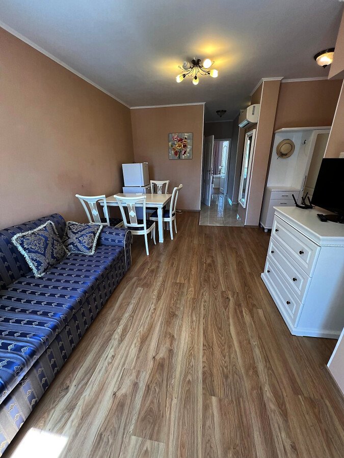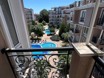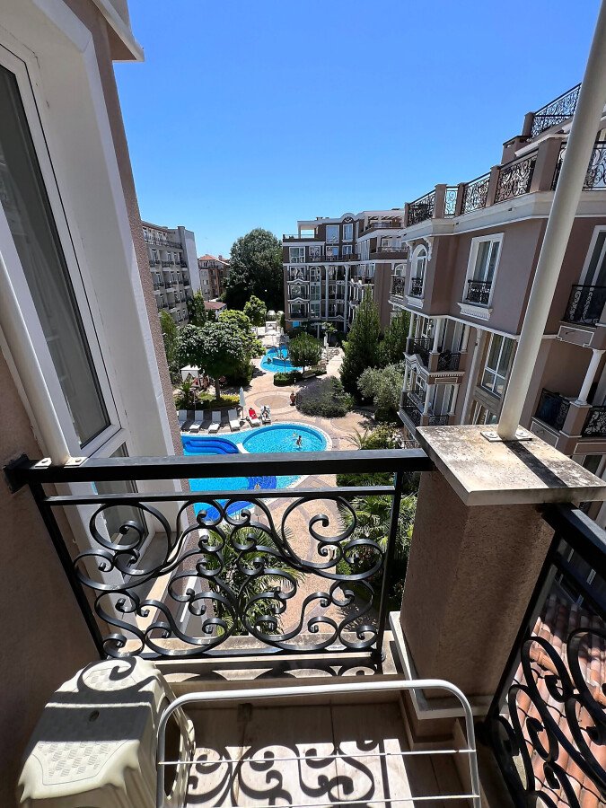 Предлагаме за продажба прекрасен двустаен апартамент с гледка към басейна във впечатляващия комплекс „Изида Палас“. Архитектурата и дизайнът на този комплекс са като на дворец, което се подразбира от името му. Намира се в морския курорт Слънчев бряг, само на 400 метра пешеходно разстояние от плажната ивица и морето.
