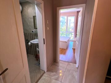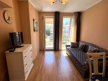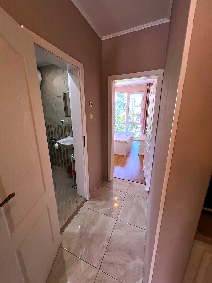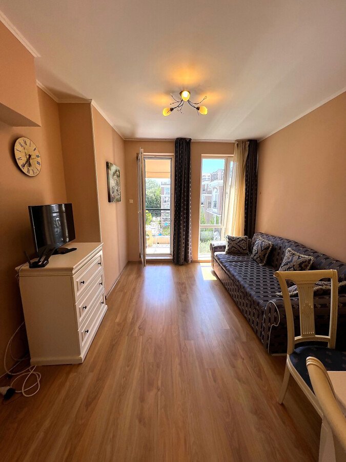 Апартаментът е уютен и много функционален, със следното разпределение – входно антре, всекидневна с обособен кът за хранене, кухненски бокс, спалня, баня с тоалетна и душ кабина, тераса с невероятна гледка към басейна и добре поддържаната вътрешна част на комплекса. Продава се в отлично състояние, много добре обзаведен и напълно оборудван с необходимата домакинска техника, готов за нанасяне.