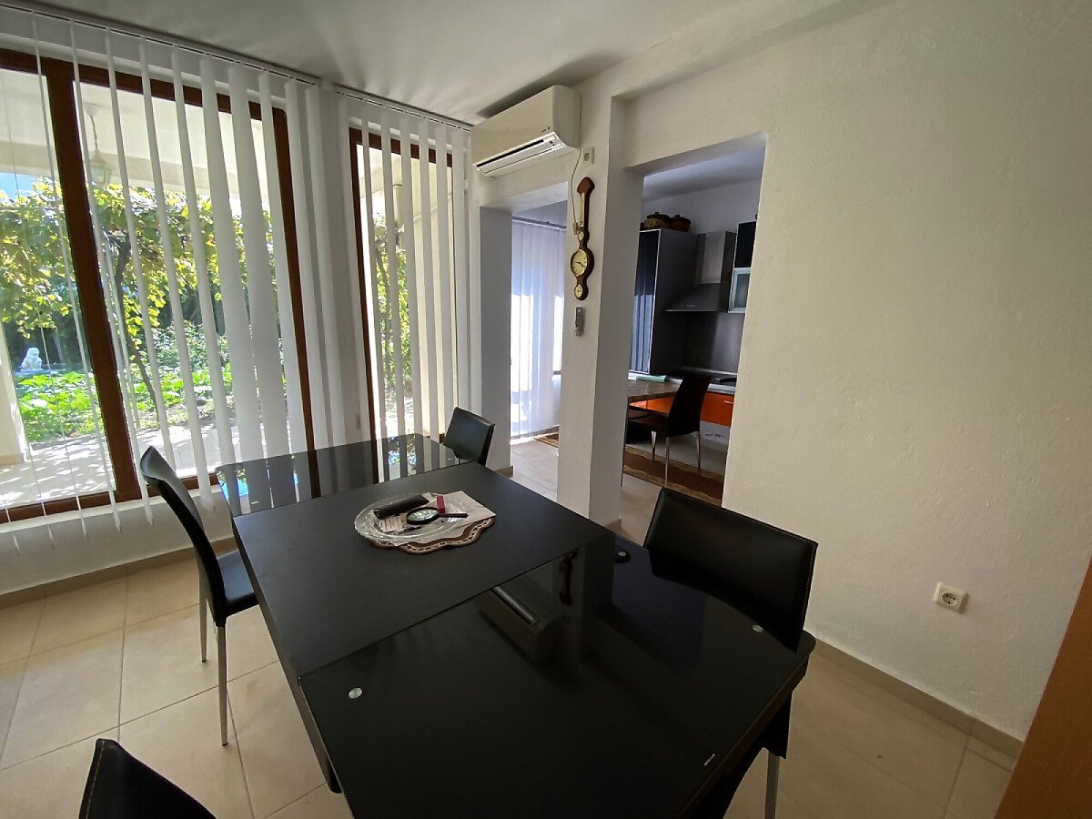 Оградена е с масивна, каменна ограда и разполага с красиво озеленена градина, поливна система, зона за барбекю и много други удобства за комфортен живот на метри от морето!