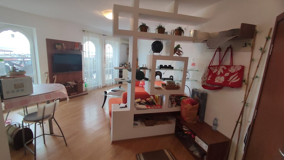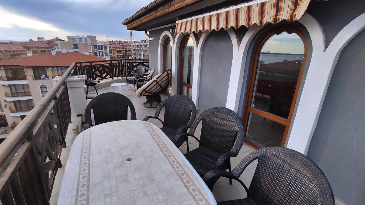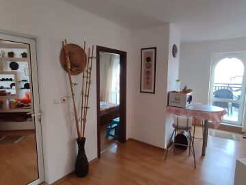 Апартаментът е функционален, със следното разпределение – входно антре, всекидневна с малък кухненски бокс и зона за хранене, спалня, баня с тоалетна и душ кабина, голяма панорамна тераса с уникална гледка към морето, стария град на Несебър и Слънчев бряг.