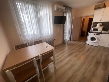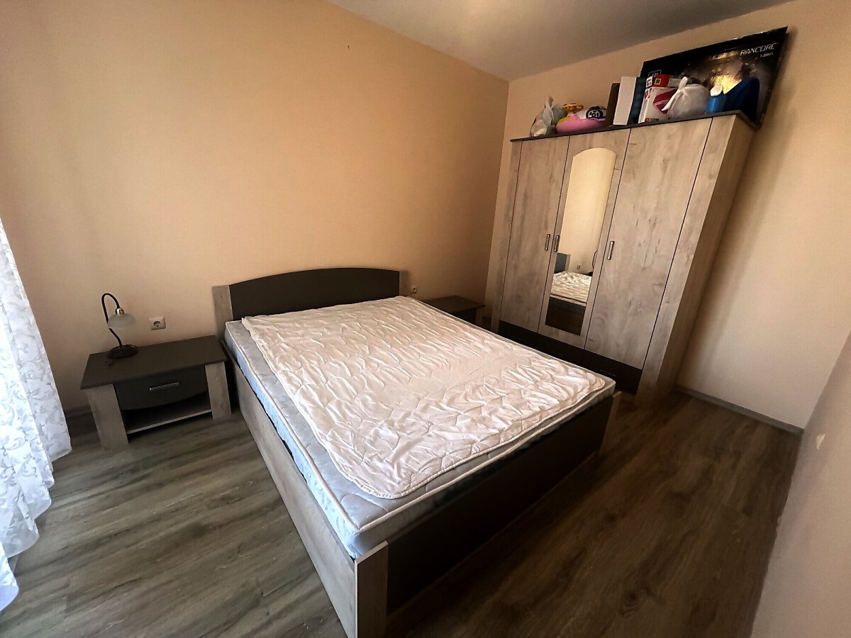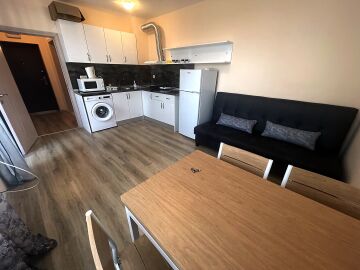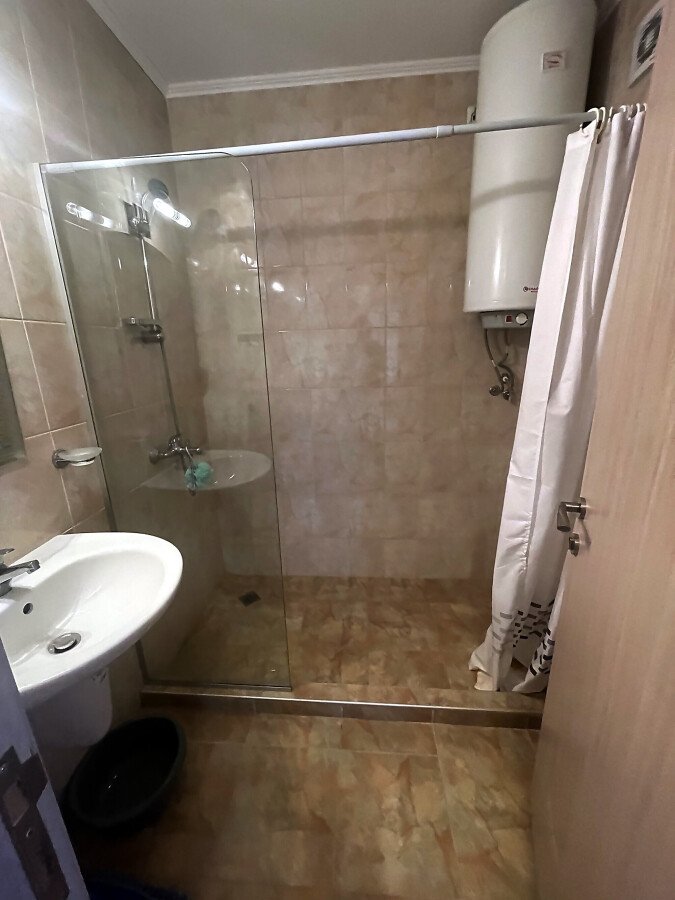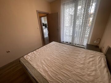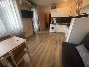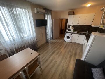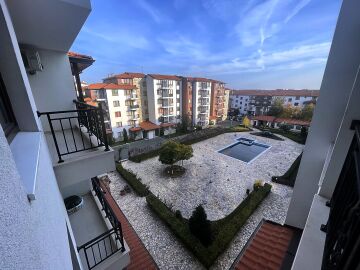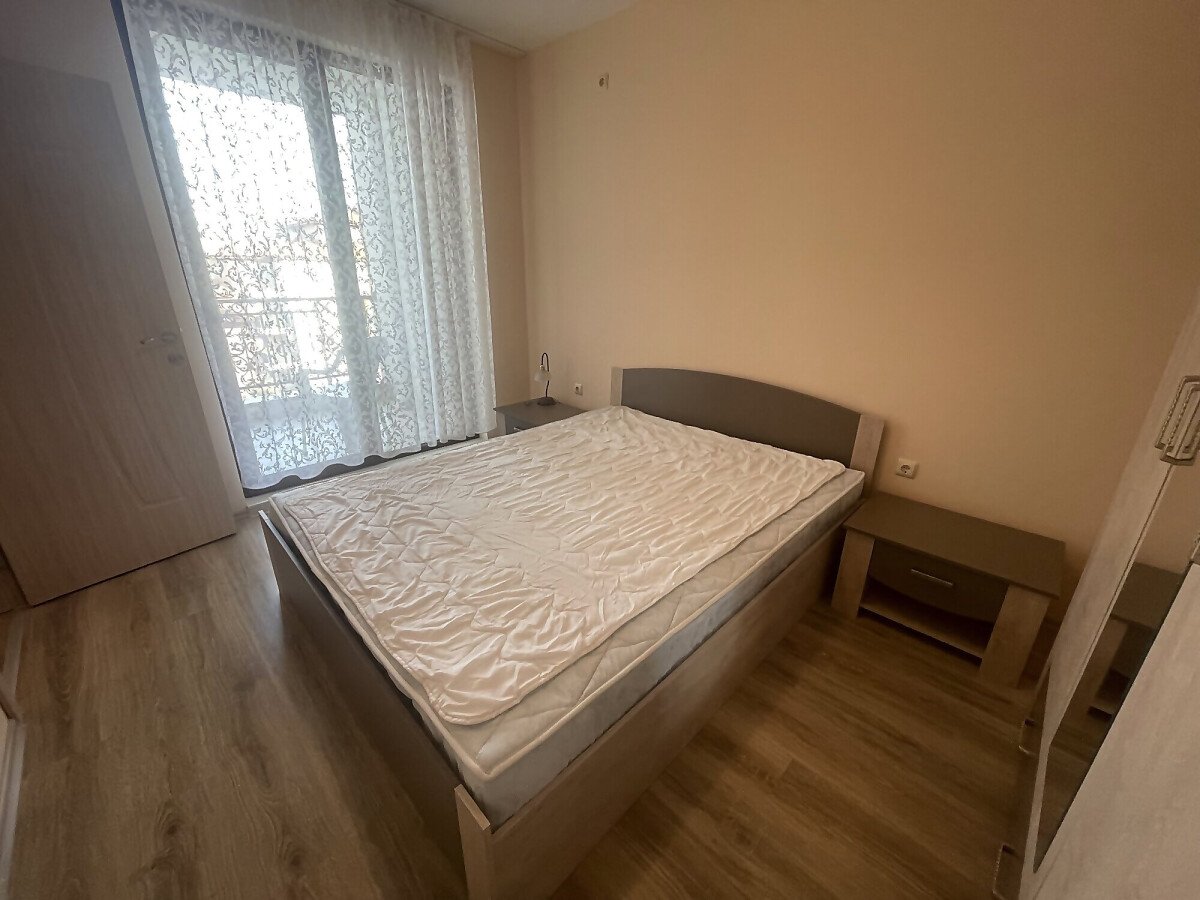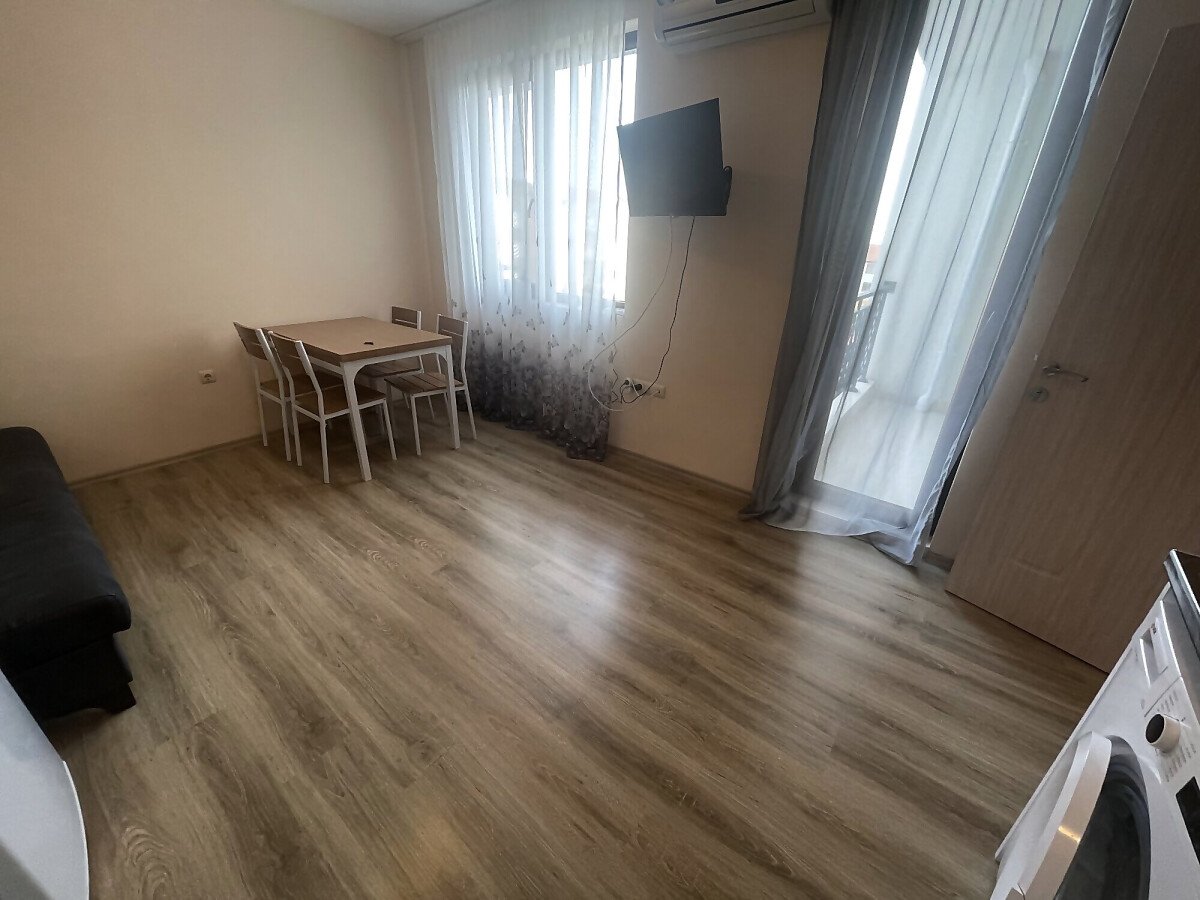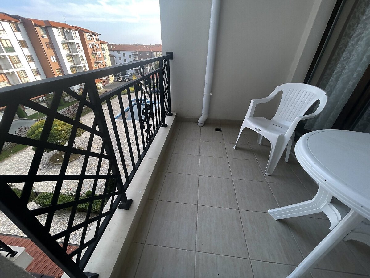 Апартаментът е разположен на пети, предпоследен етаж, като в сградата има асансьор. Жилището е със следното разпределение - входно антре, всекидневна с обособен кухненски бокс и зона за хранене, спалня, баня с тоалетна, тераса с гледка към вътрешната територия и басейна. Продава се оборудван с домакинска електротехника, напълно обзаведен с качествени и стилни мебели - всичко необходимо, както е на снимките.
