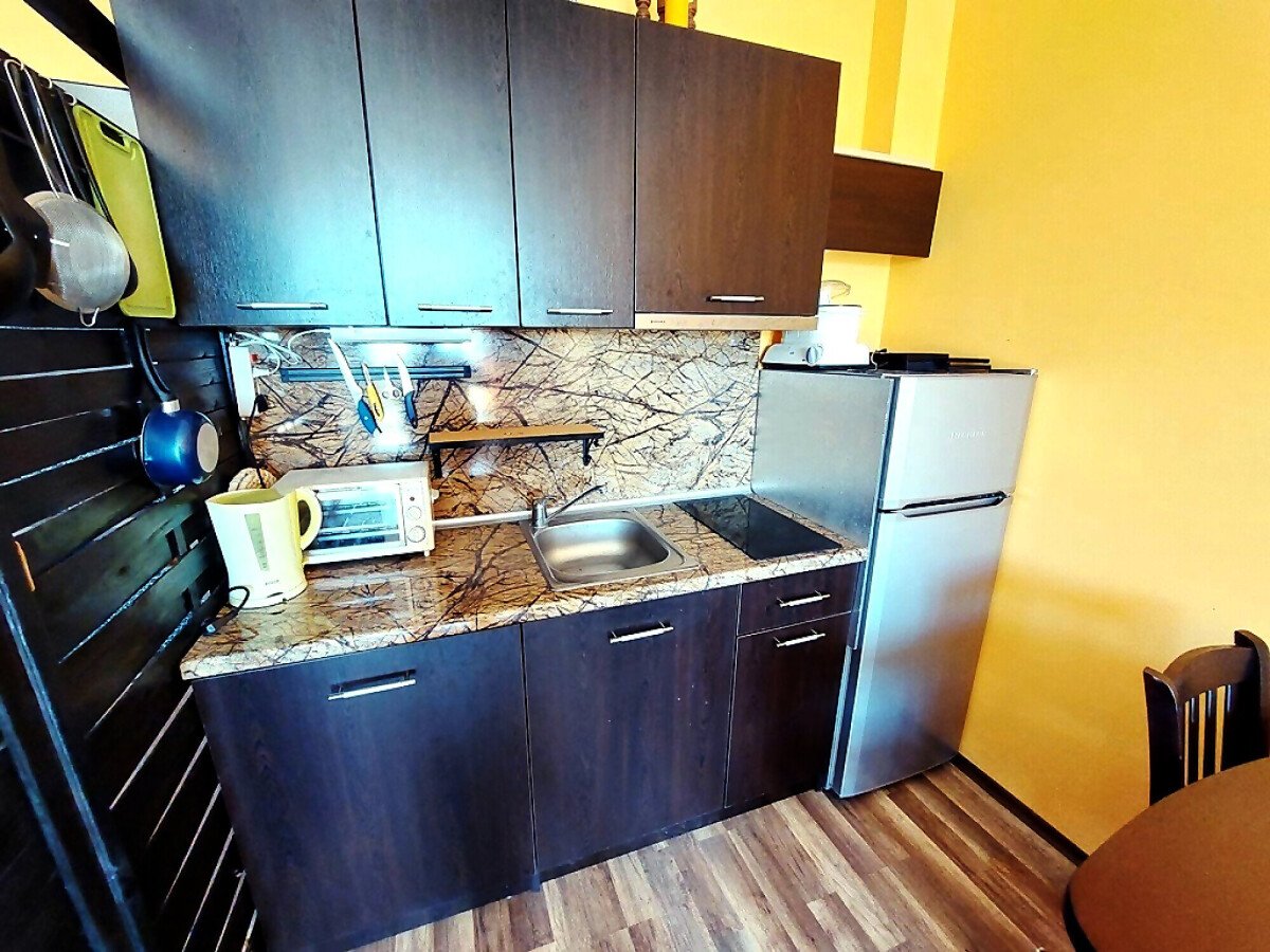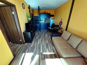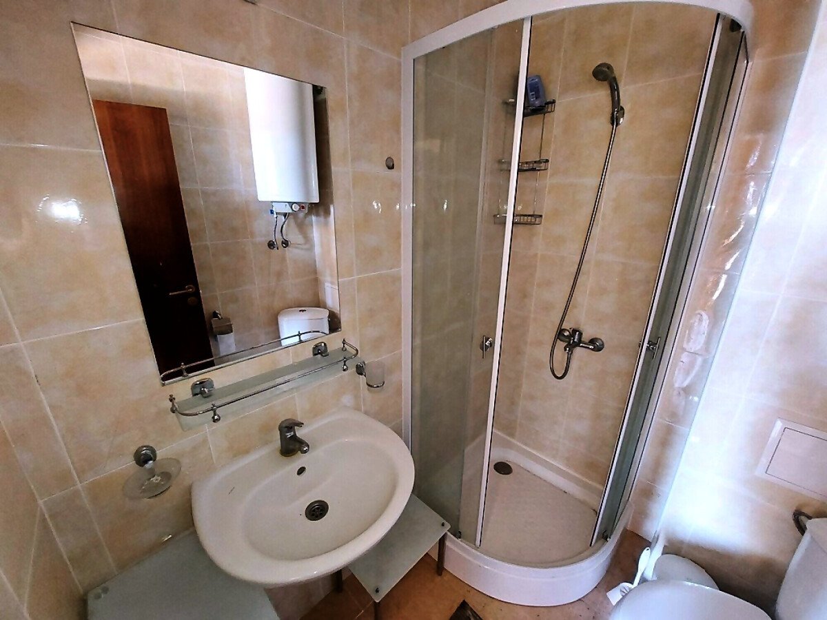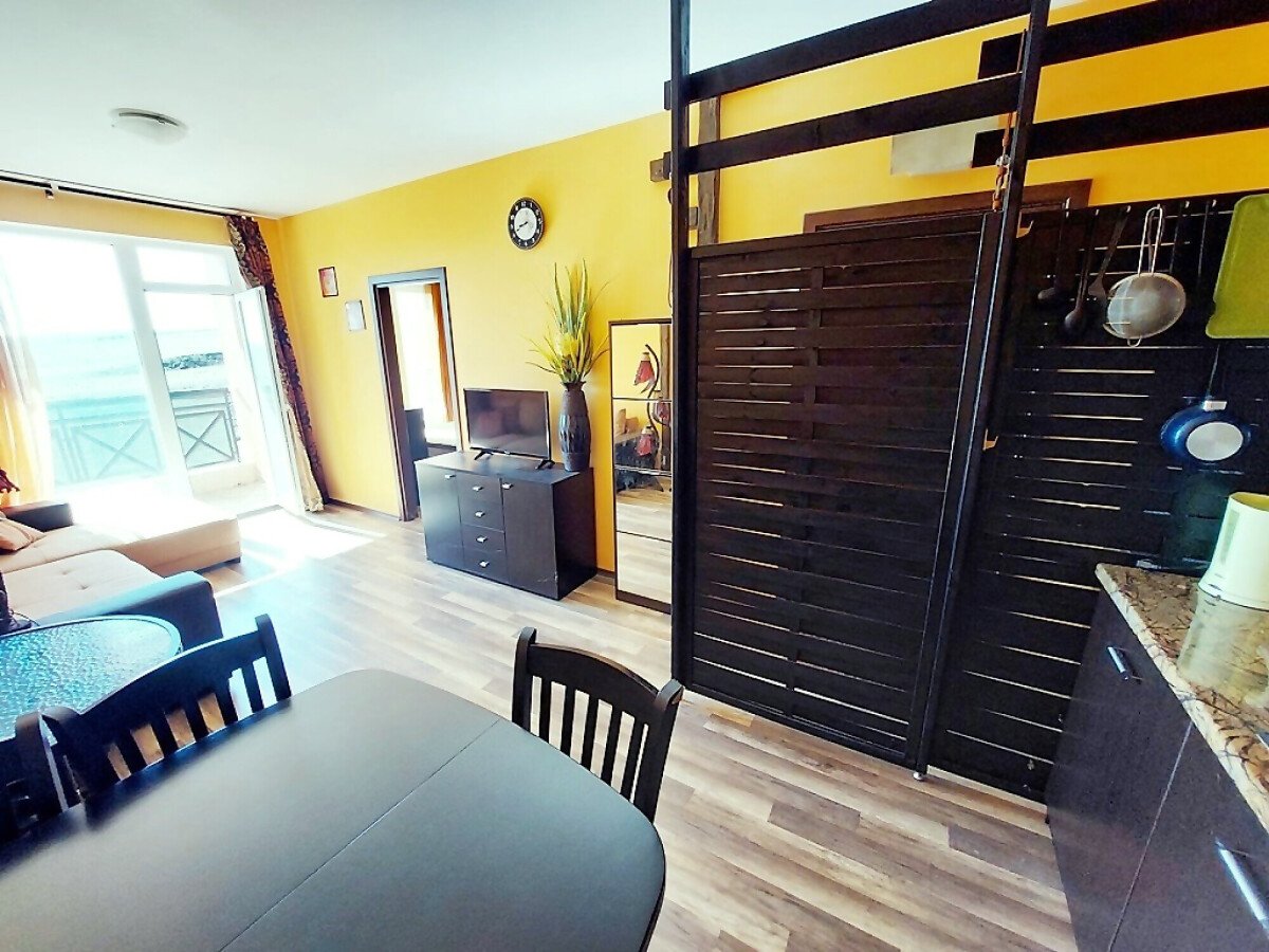 Апартаментът е светъл и функционален, със следното разпределение – всекидневна с обособен малък кухненски бокс и зона за хранене, спалня, баня с тоалетна и душ кабина, тераса. Продава се с целия пакет обзавеждане и оборудване, както е на снимките. Имотът е в отлично състояние, готов за нанасяне.