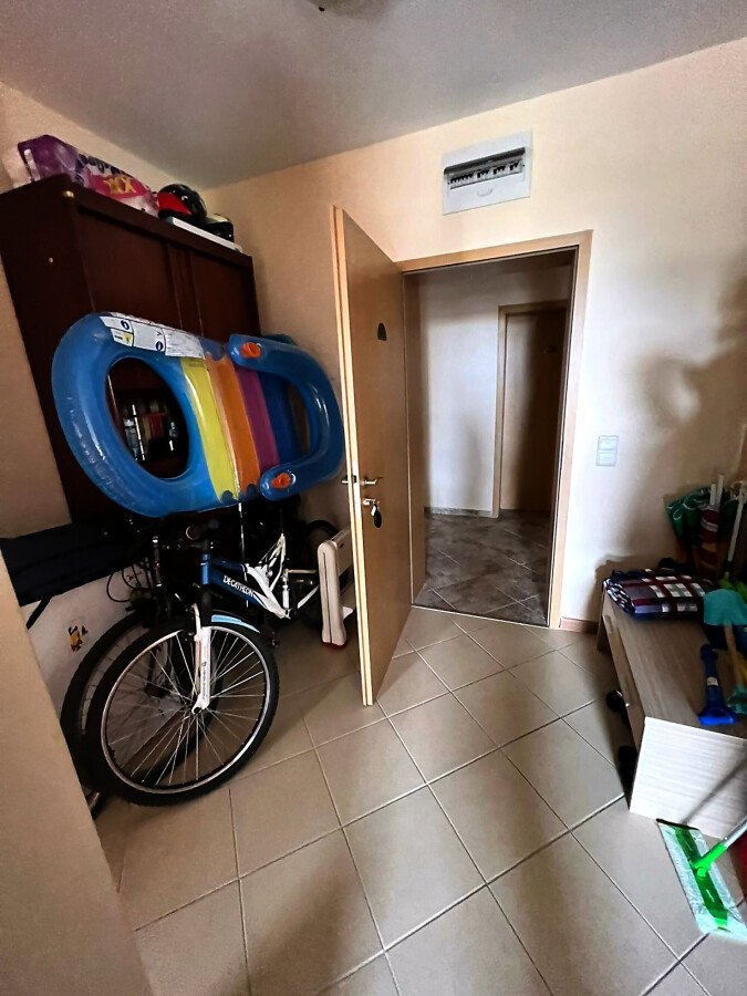 Апартаментът е идеален както за спокоен летен отдих и отдаване под наем, така и за постоянно живеене. Състои се от входно антре, голяма всекидневна с кухненски бокс и обособена зона за хранене, малък коридор, две спални, две бани с тоалетна, тераса с частична гледка към басейна. В едната от баните има душ кабина, а в другата вана.