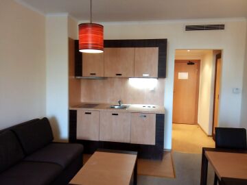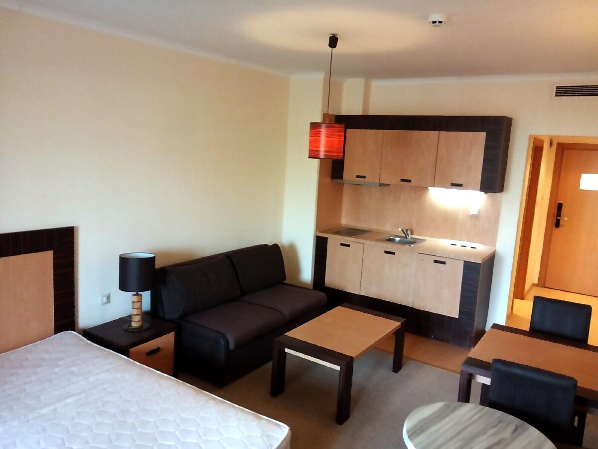 Студиото има следното разпределение – входно антре, всекидневна с малък кухненски бокс и обособена спалня, баня с тоалетна и вана, тераса с гледка към вътрешната част на комплекса.