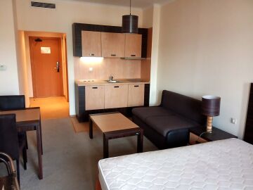 Студиото има следното разпределение – входно антре, всекидневна с малък кухненски бокс и обособена спалня, баня с тоалетна и вана, тераса.