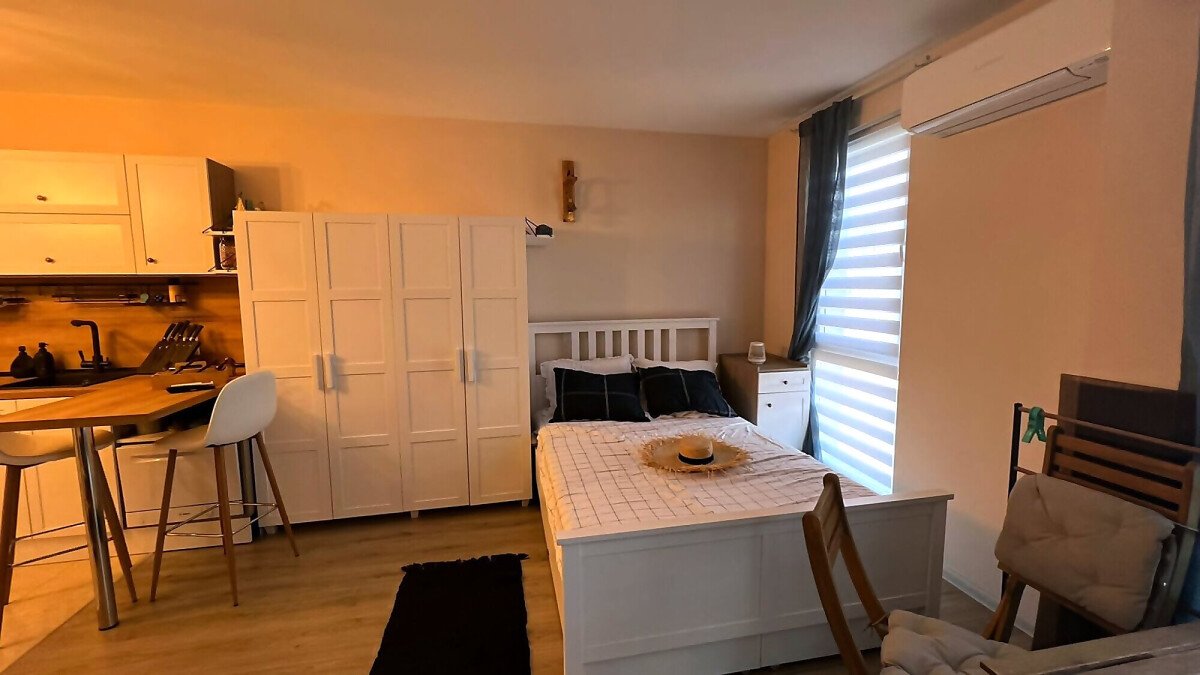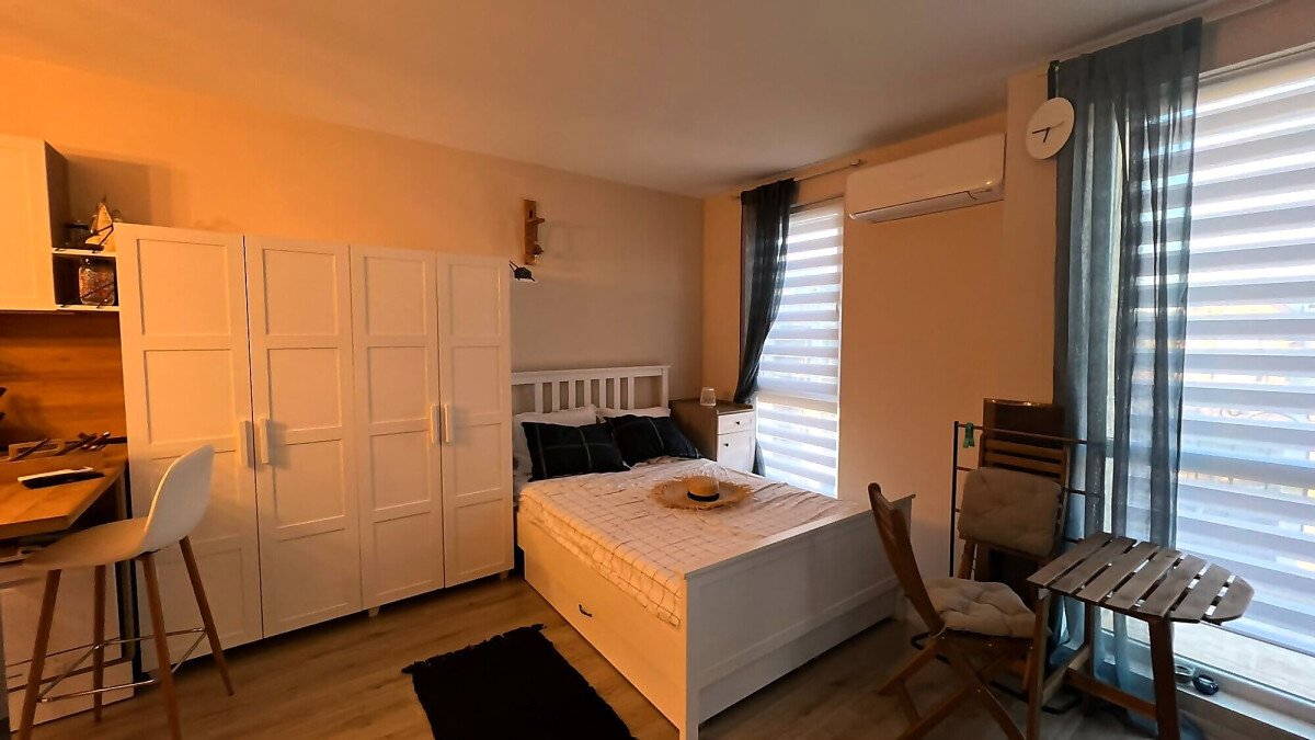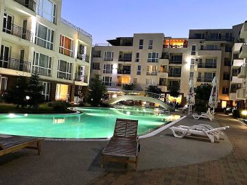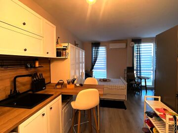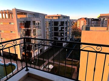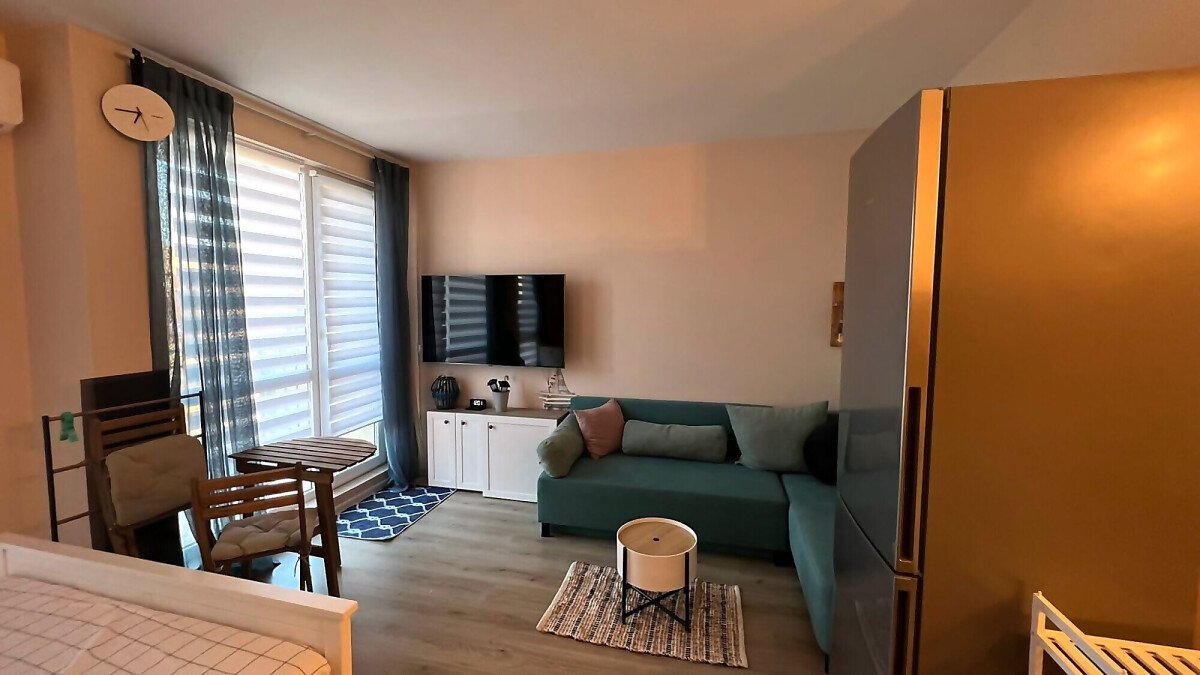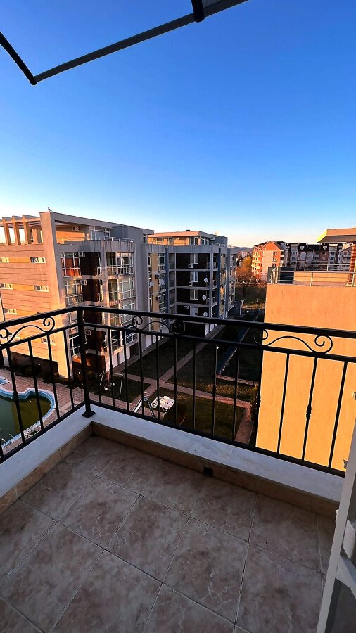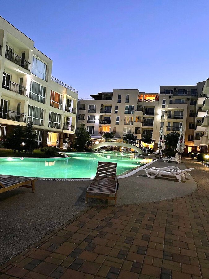 Ние Ви предлагаме да станете собственик на прекрасно студио в този комплекс. Имотът е уютен и много функционален, със следното разпределение – всекидневна с обособен кухненски бокс, кът за хранене и спалня, баня с тоалетна и душ кабина, тераса с красива гледка към басейна и вътрешната част на комплекса. Продава се с обзаведен с модерни и стилни мебели, напълно оборудван, готов за нанасяне.