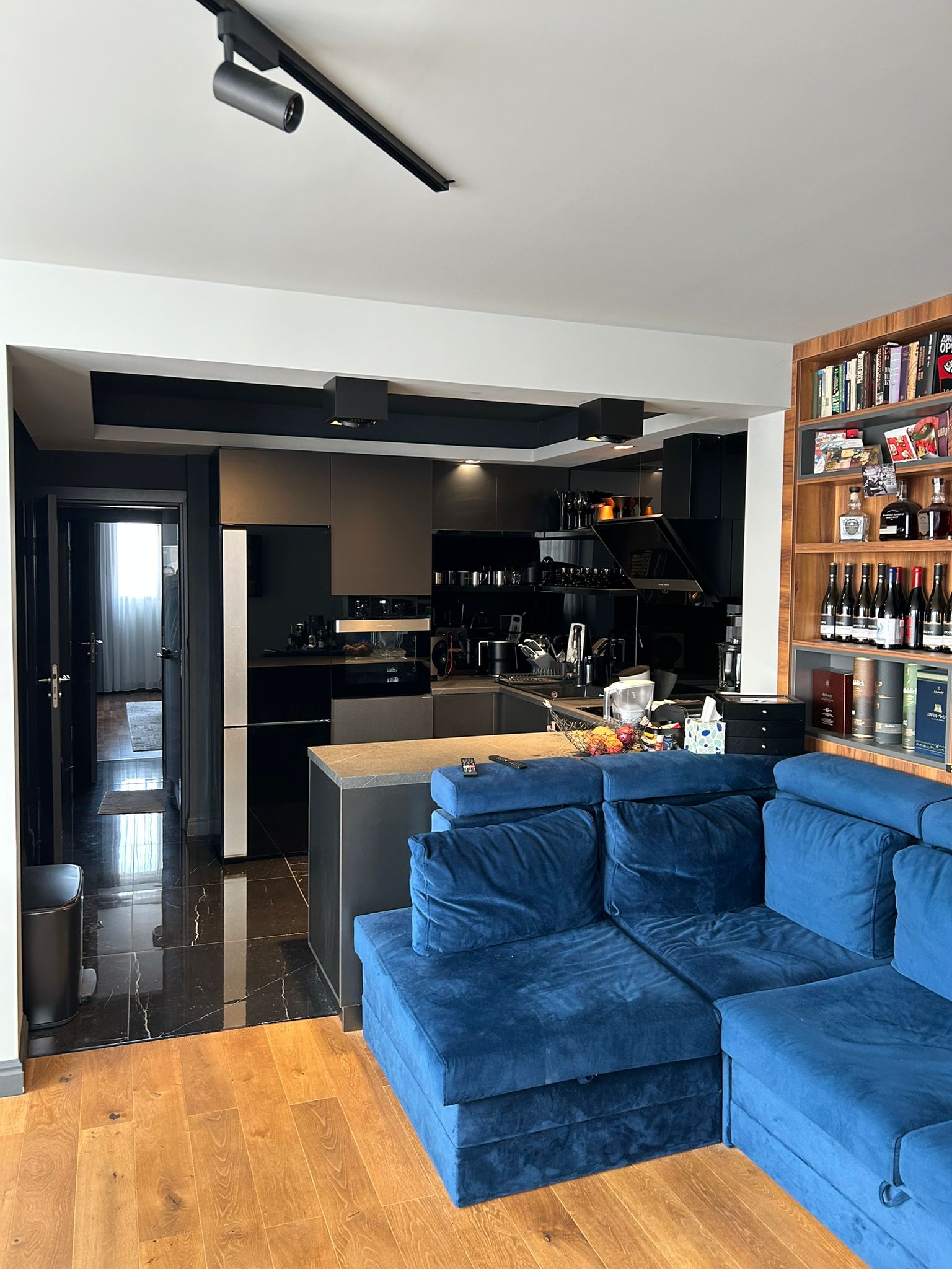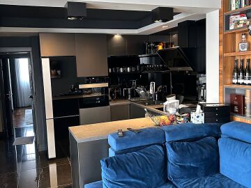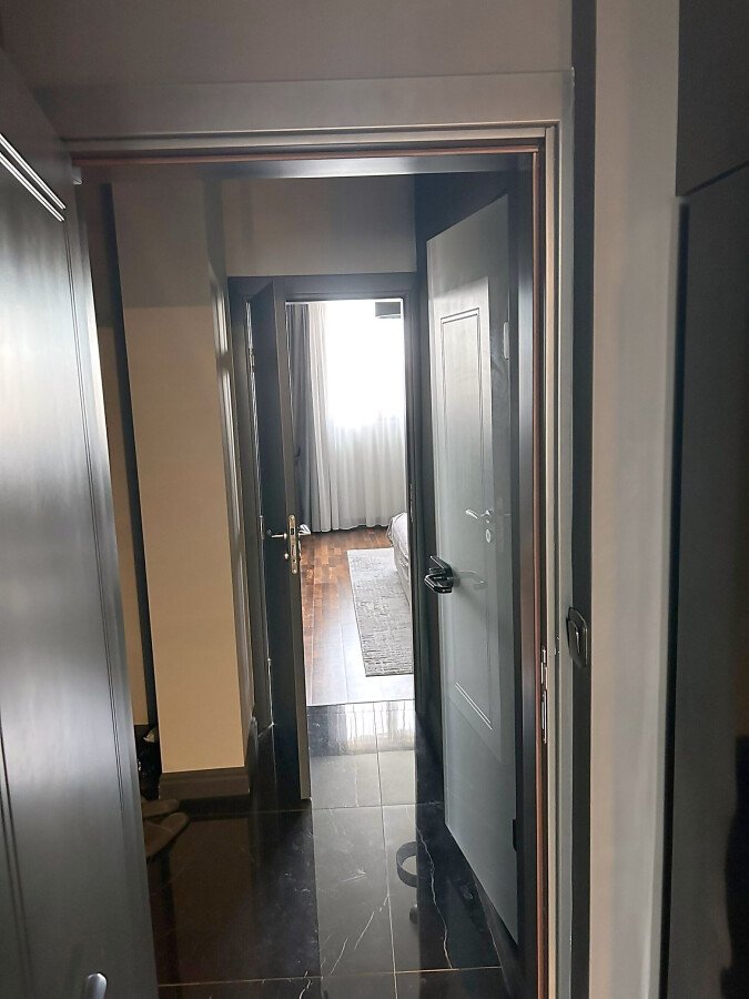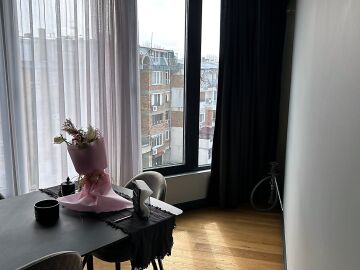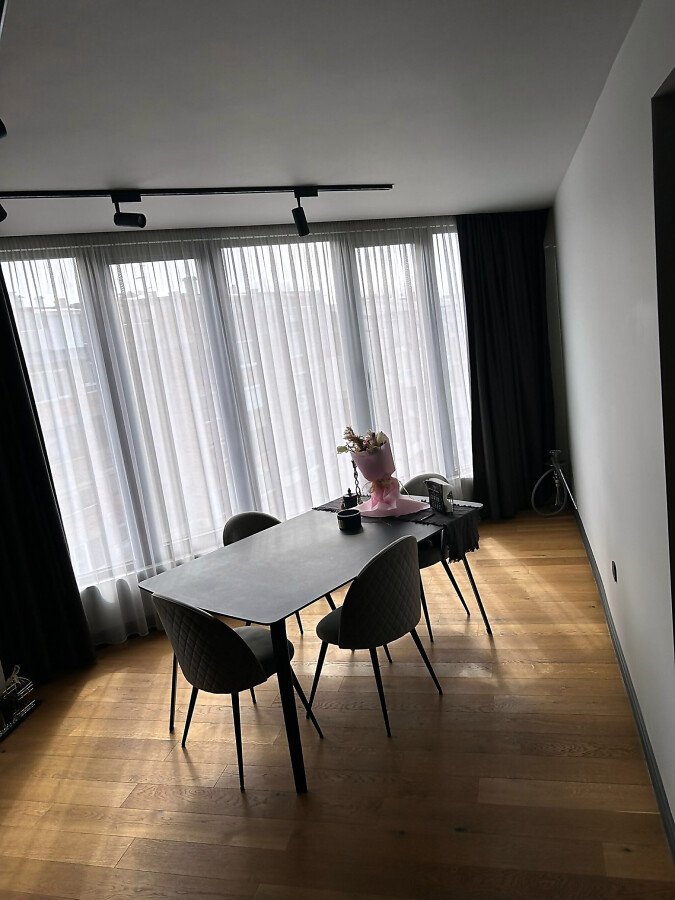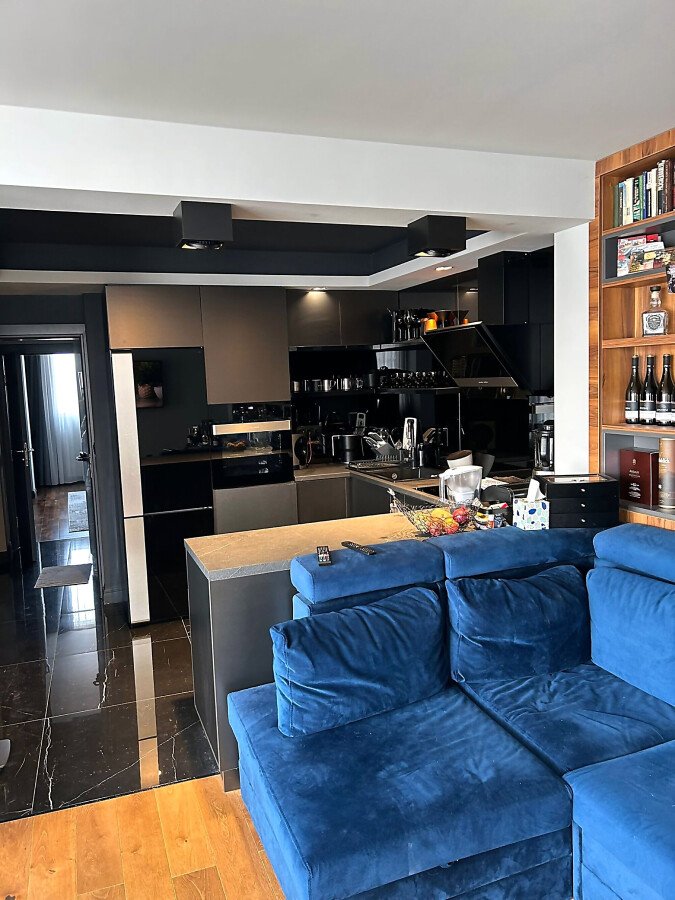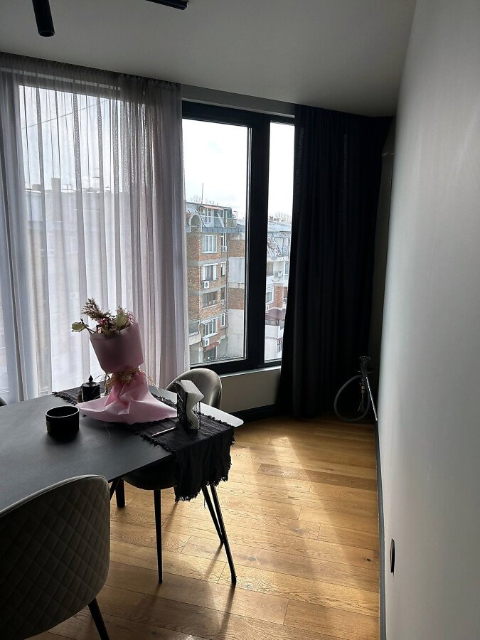 Апартаментът е разположен на четвърти етаж, като в сградата няма асансьор. Площта му по документи е 86 кв.м., но реално е повече, поради присъединени две тераси. Състои се от входно антре, всекидневна с кухненски бокс и зона за хранене, баня с тоалетна и душ кабина, спалня. Обзаведен е луксозно и е оборудван с всички необходими електроуреди.