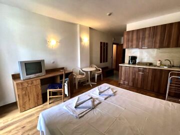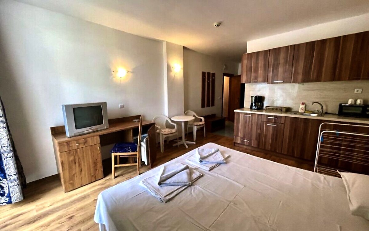 Студиото има следното разпределение - входно антре, всекидневна с кухненски бокс и обособена спалня, баня с тоалетна, тераса. Продава се напълно обзаведено и оборудвано с необходимите домакински електроуреди, готов за нанасяне.