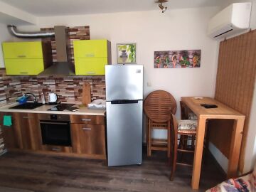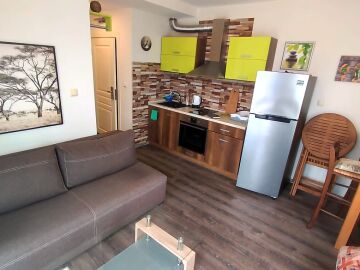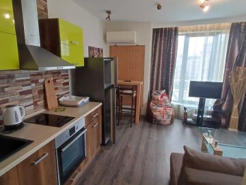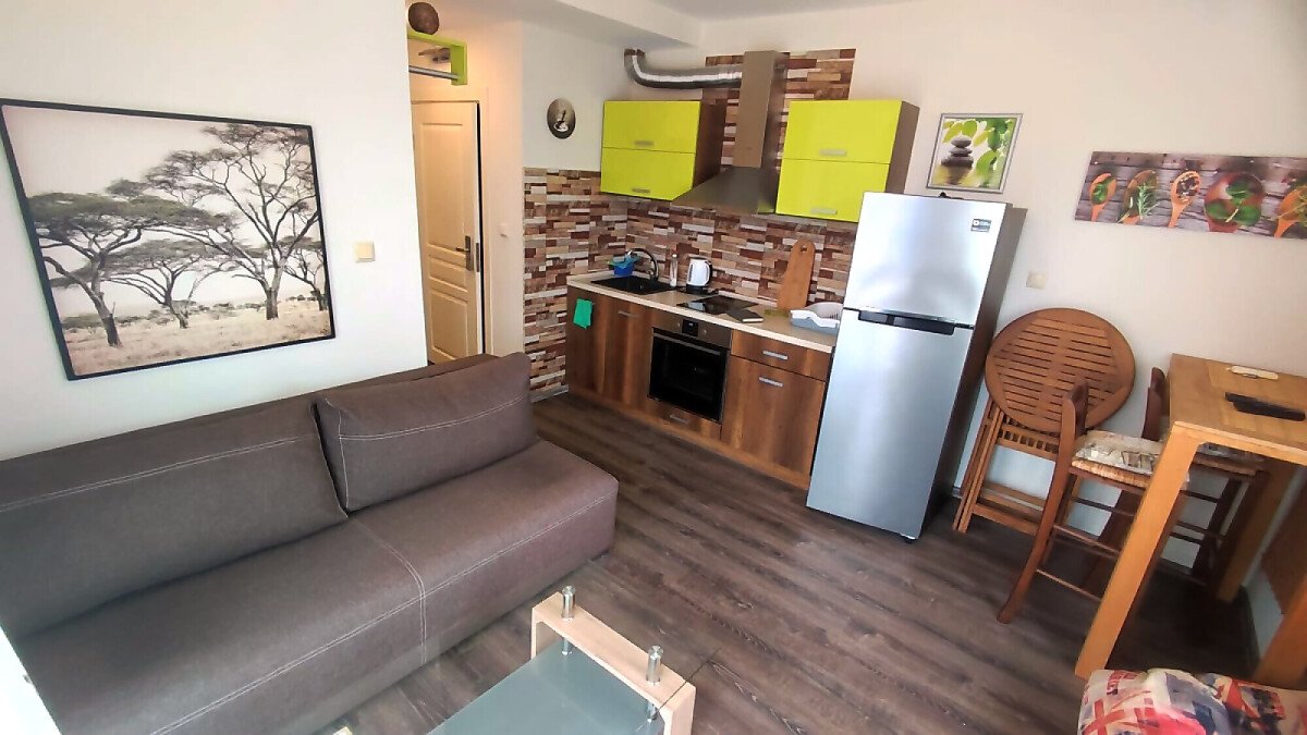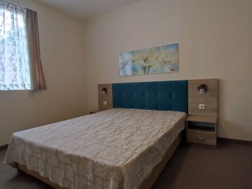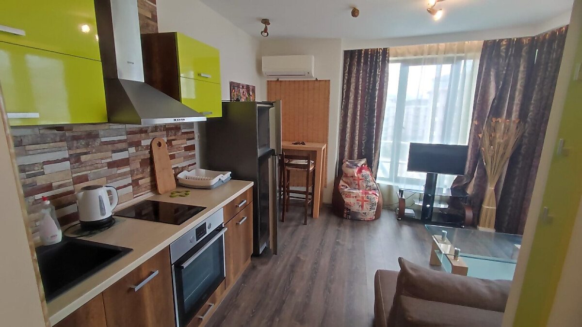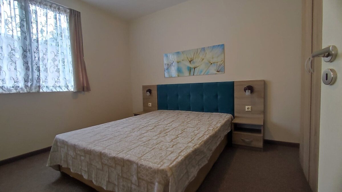 Апартаментът е в отлично състояние след направен дизайнерски ремонт – напълно обзаведен и оборудван. Състои се от всекидневна с кухненски бокс и обособена зона за хранене, спалня, баня с тоалетна и душ кабина, тераса с прекрасна гледка към басейна и вътрешната част на комплекса.
