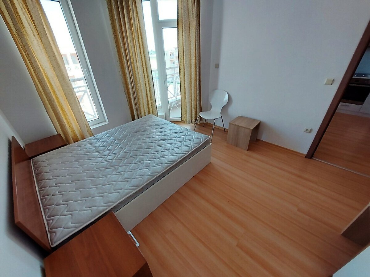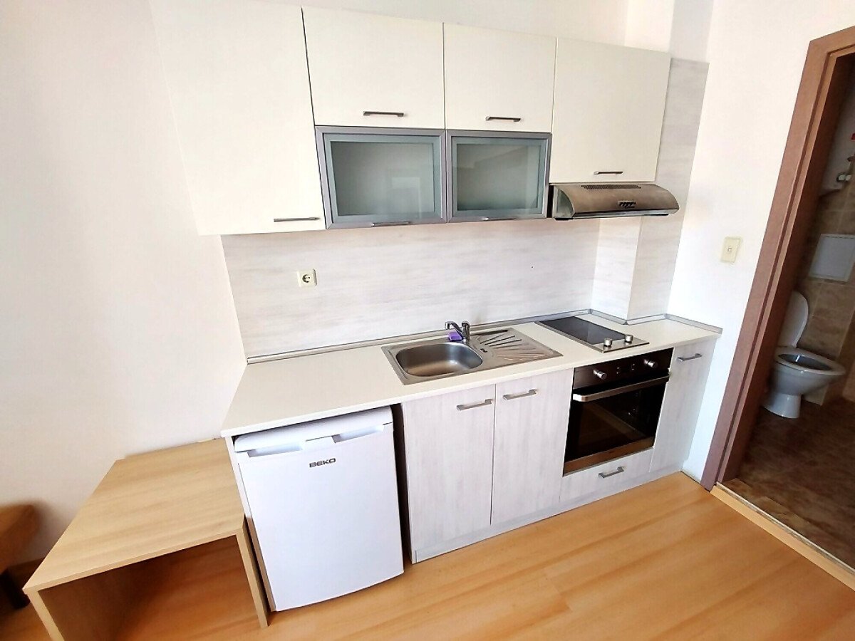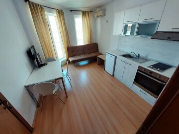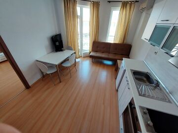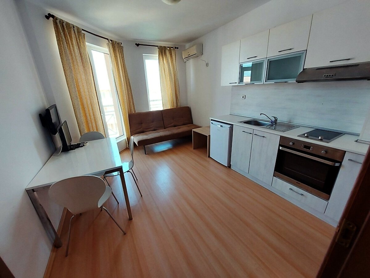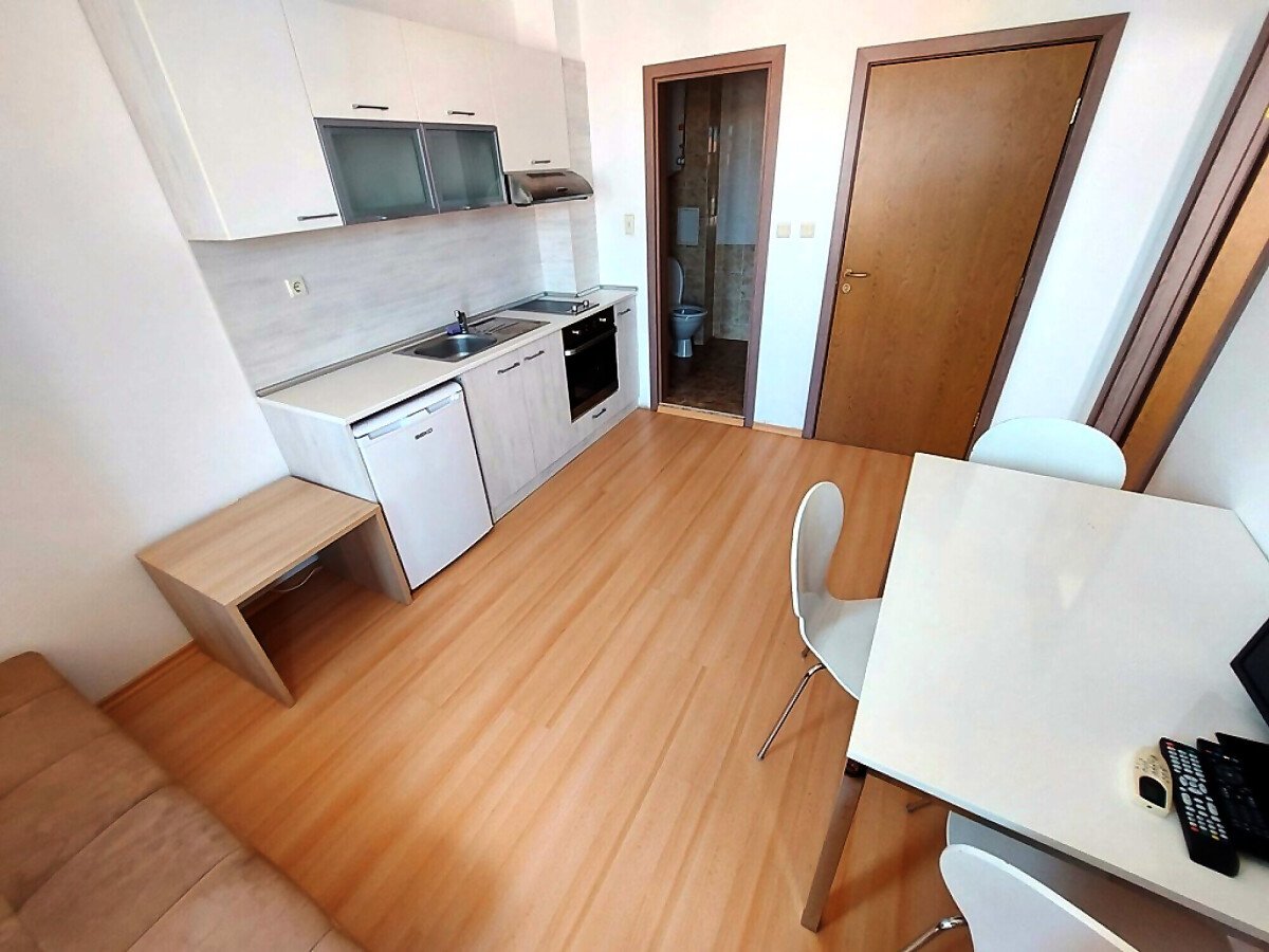 Апартаментът се продава в отлично състояние, с целия пакет обзавеждане и оборудване, готов за нанасяне. Състои се от малка всекидневна с кът за хранене и кухненски бокс, баня с тоалетна, спалня, тераса с гледка към вътрешната част на комплекса.