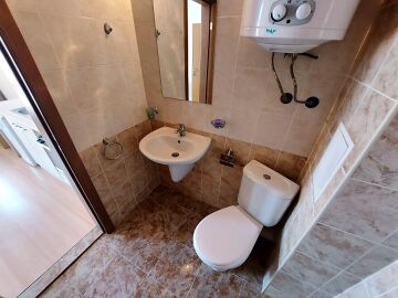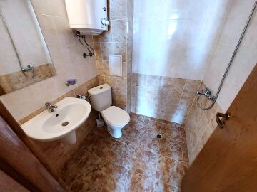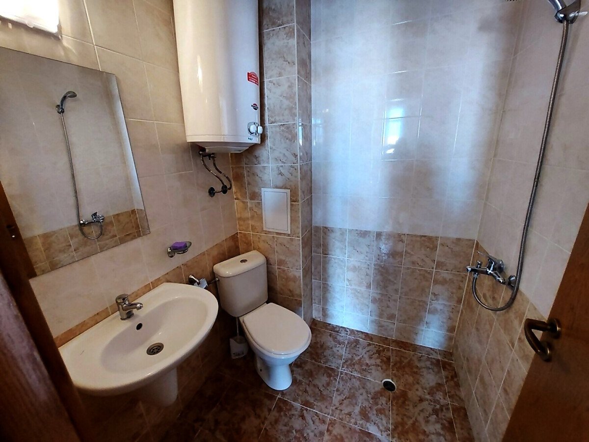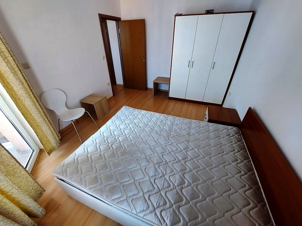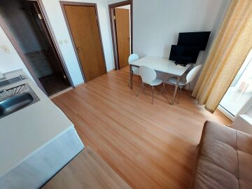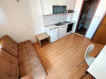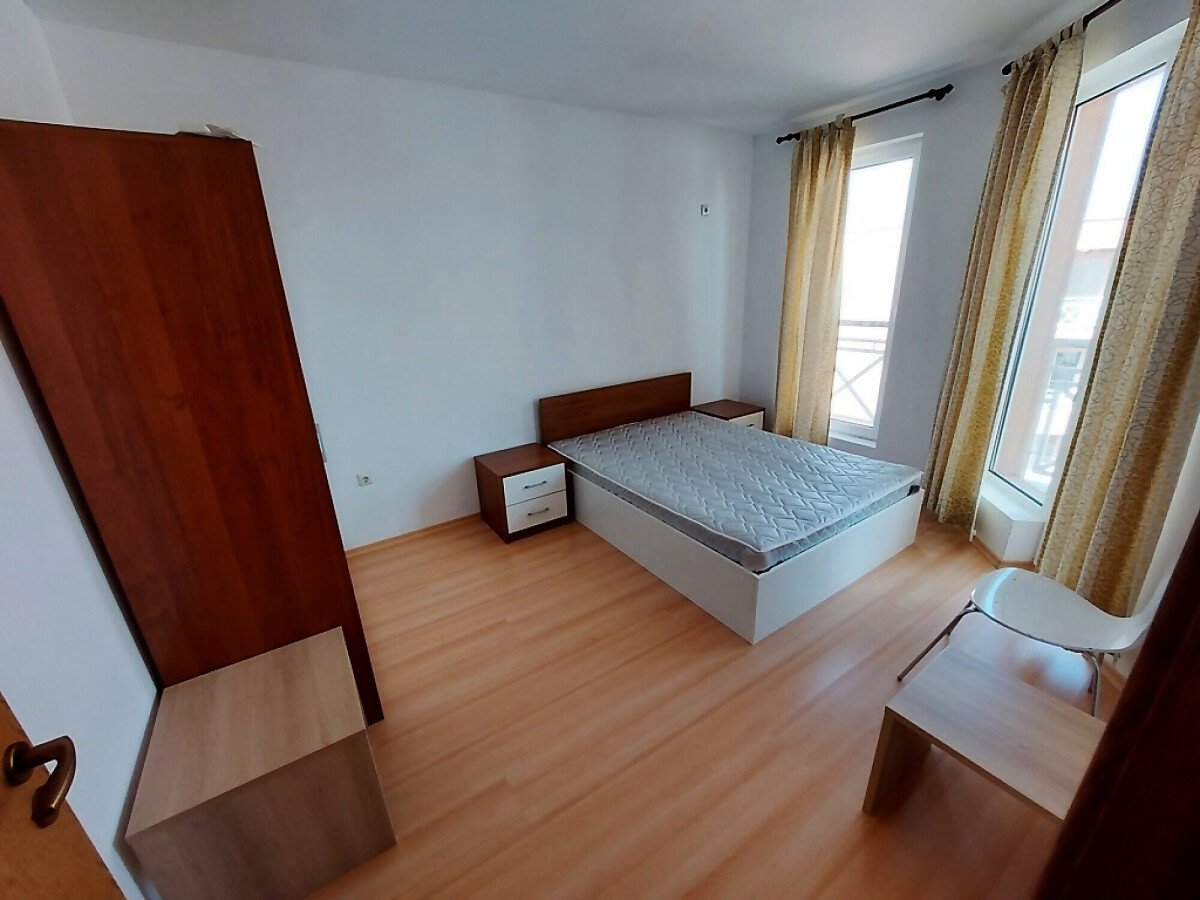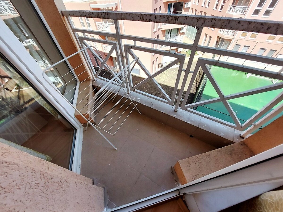 Апартаментът се продава в отлично състояние, с целия пакет обзавеждане и оборудване, готов за нанасяне. Състои се от малка всекидневна с кът за хранене и кухненски бокс, баня с тоалетна, спалня, тераса с гледка към вътрешната част на комплекса.
