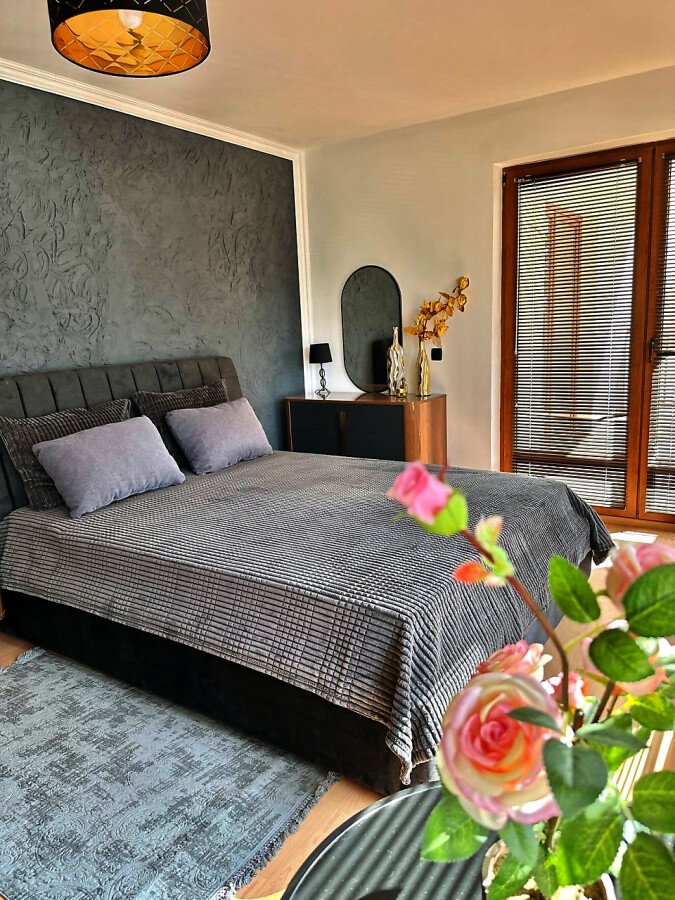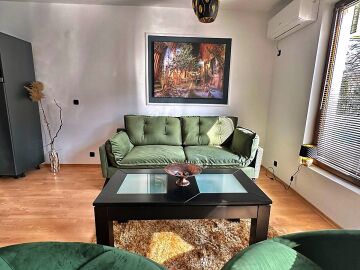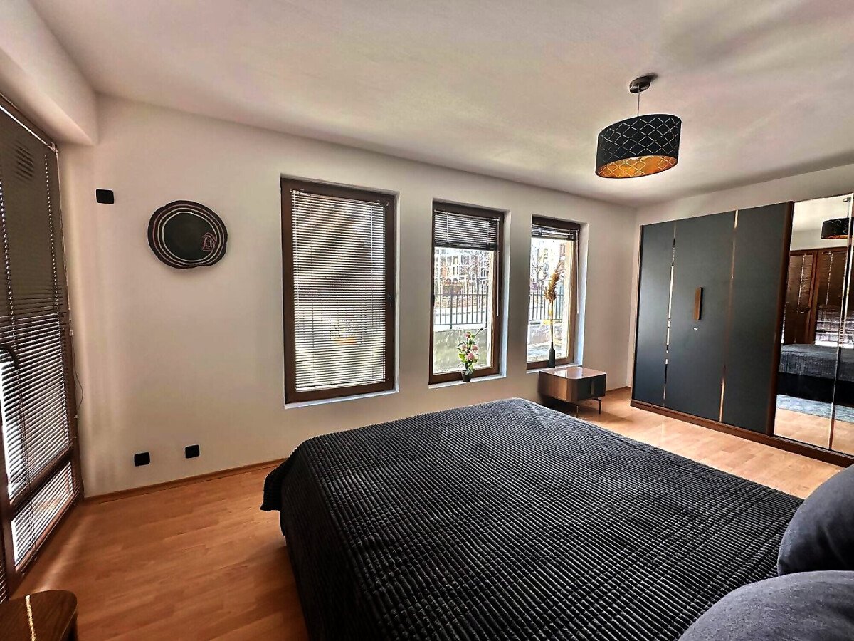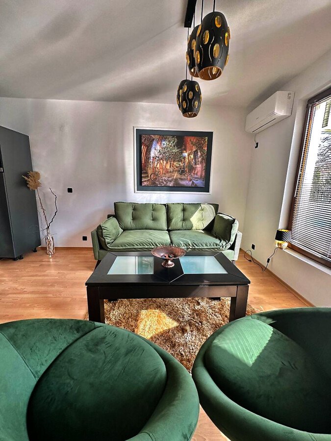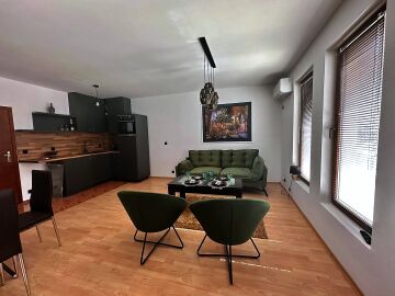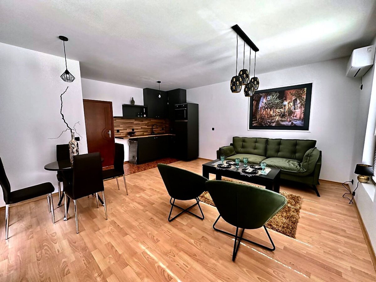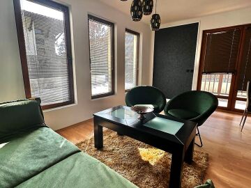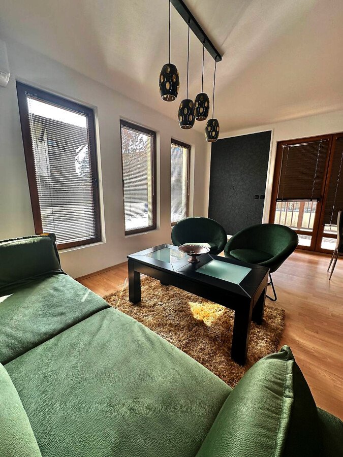 Апартаментът е много просторен и светъл, със следното разпределение - входно антре, голяма всекидневна с кухненски бокс и обособена зона за хранене, спалня, баня с тоалетна и душ кабина, тераса. Продава се чисто нов, в отлично състояние, обзаведен със стилни и качествени мебели, оборудван с домакинска техника, готов за нанасяне.