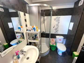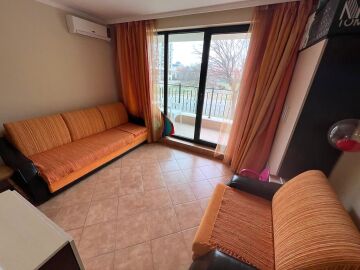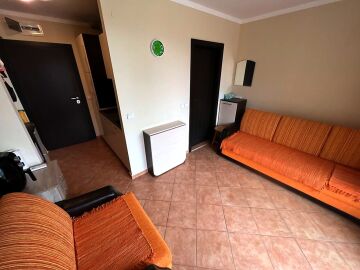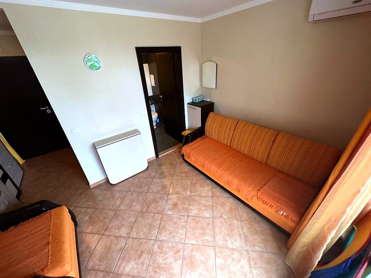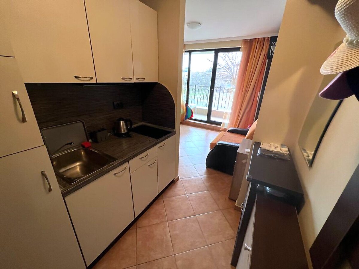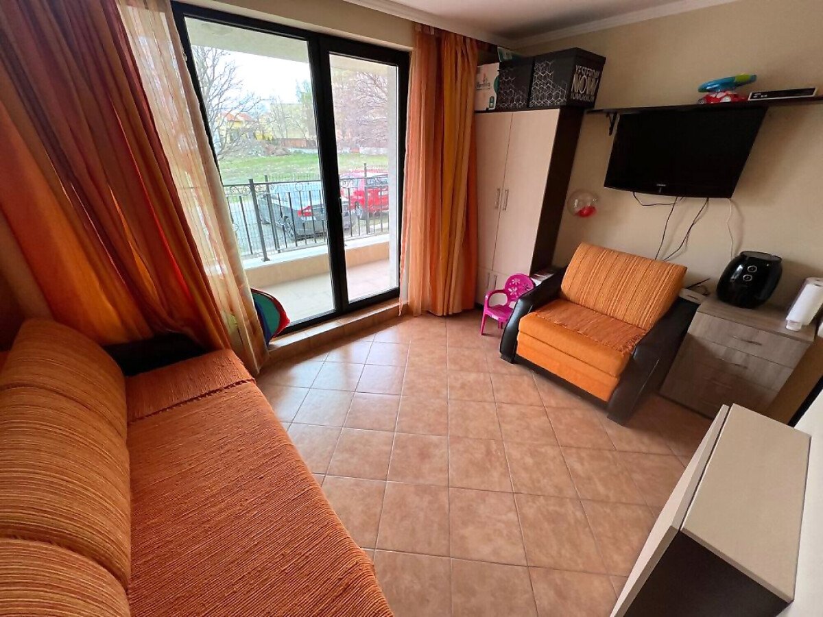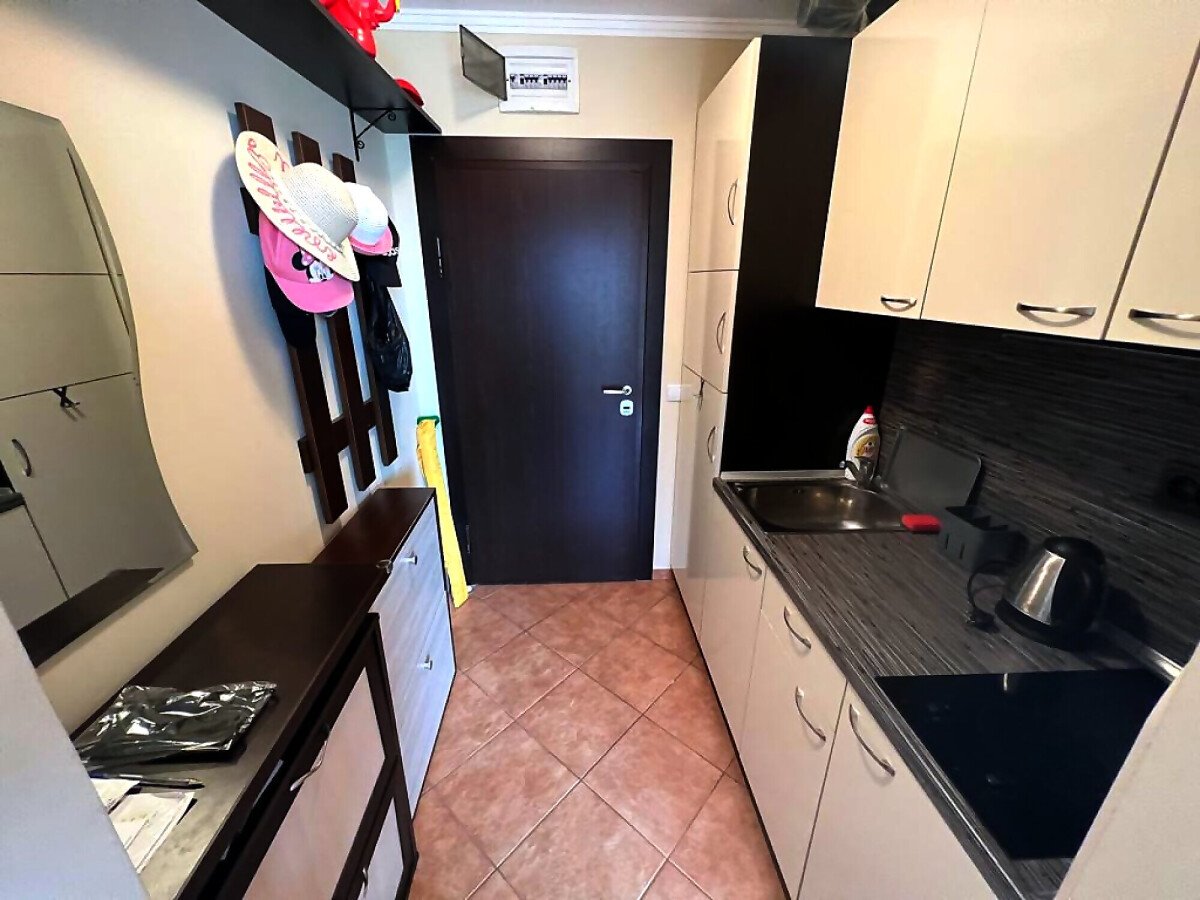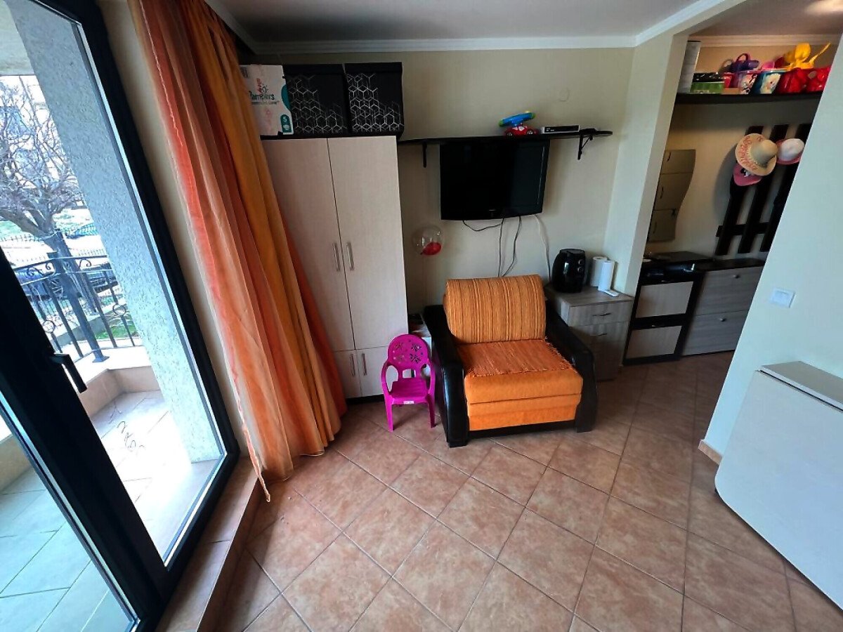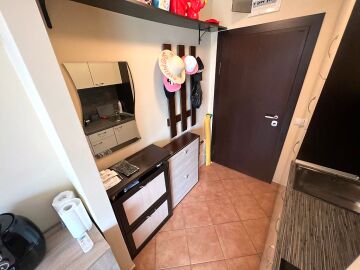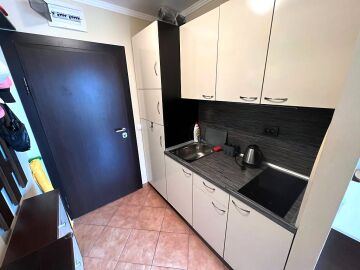 Студиото има следното разпределение – входно антре, всекидневна с обособен кухненски бокс, баня с тоалетна и душ кабина, тераса. Продава се с целия пакет обзавеждане и оборудване, както е на снимките, в много добро състояние, готово за нанасяне.