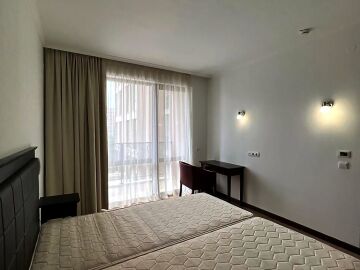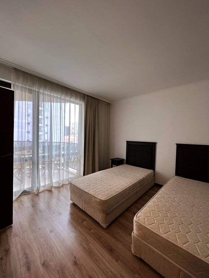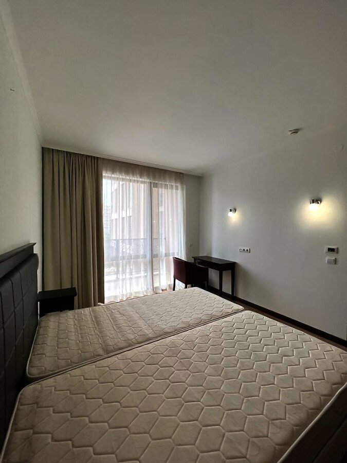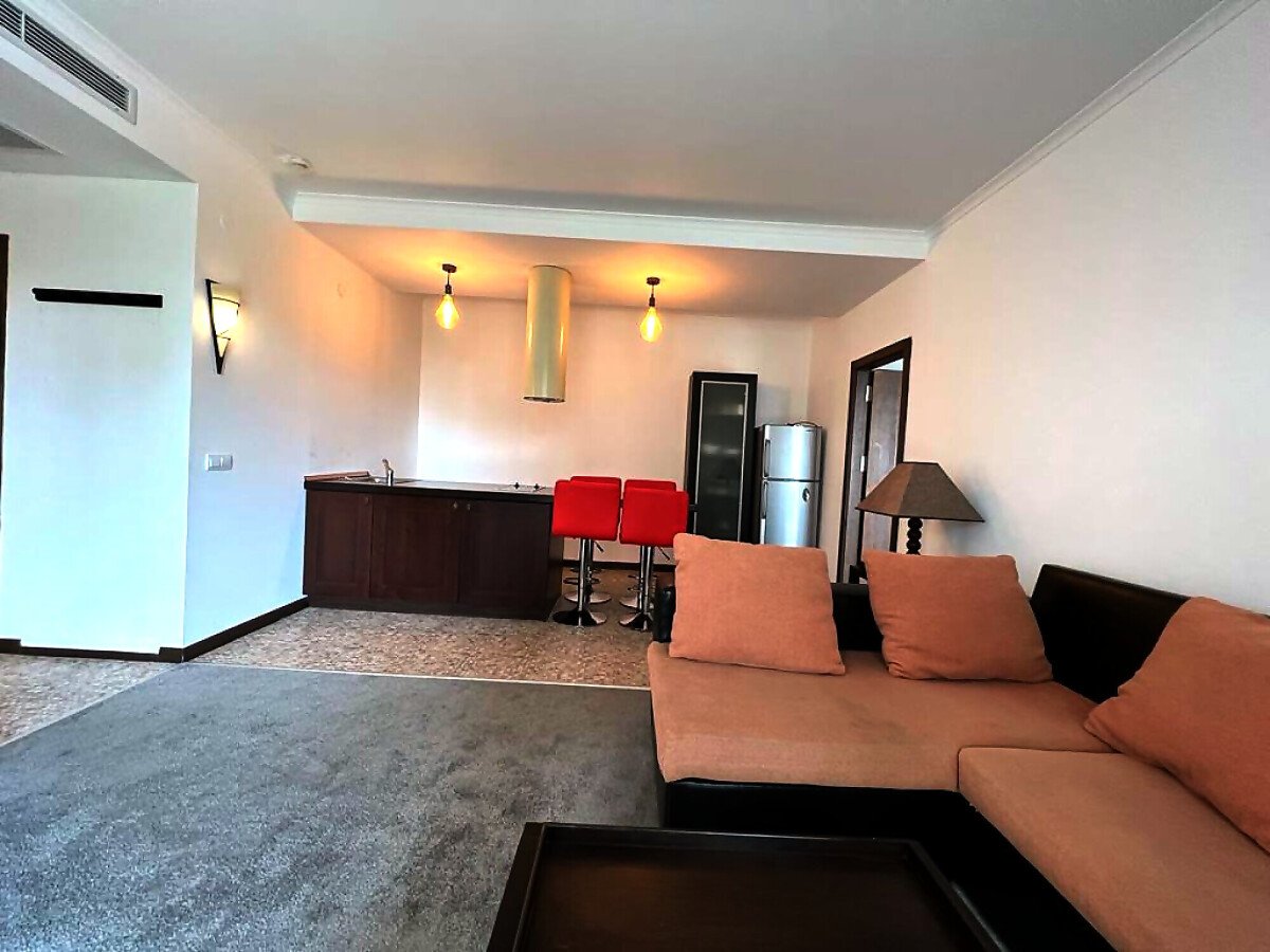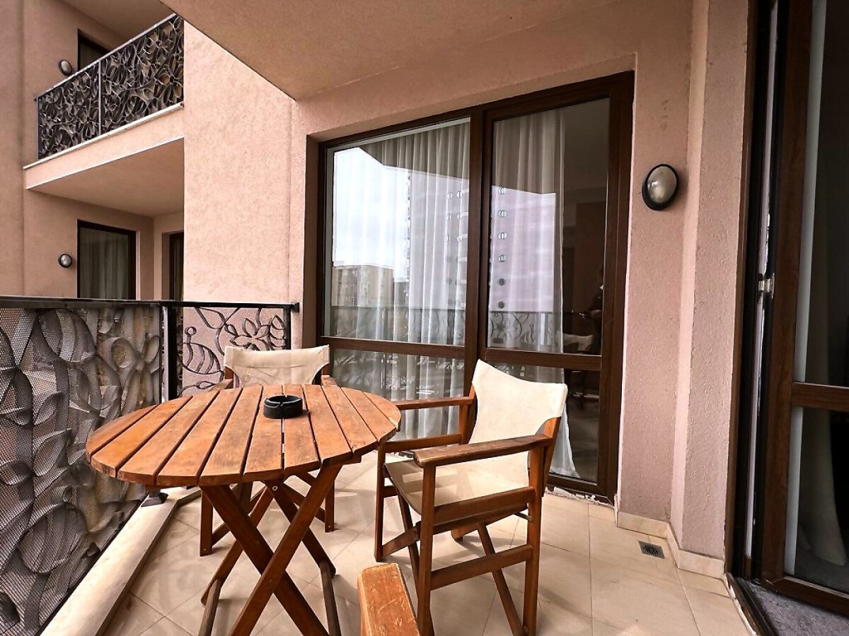 Апартаментът е просторен и много функционален, със следното разпределение – входно антре, всекидневна с малък кухненски бокс, две спални, баня с тоалетна и вана, отделна тоалетна, две тераси. Едната от терасите разкрива невероятна гледка към басейна, а другата – към вътрешната част на комплекса. Продава се в отлично състояние, напълно обзаведен с хубави мебели, оборудван с необходимата техника, готов за нанасяне.