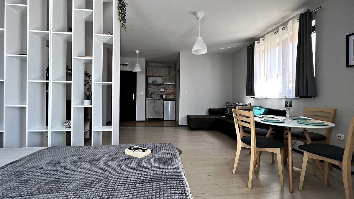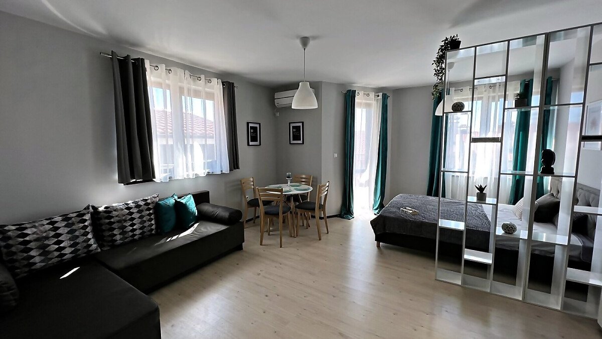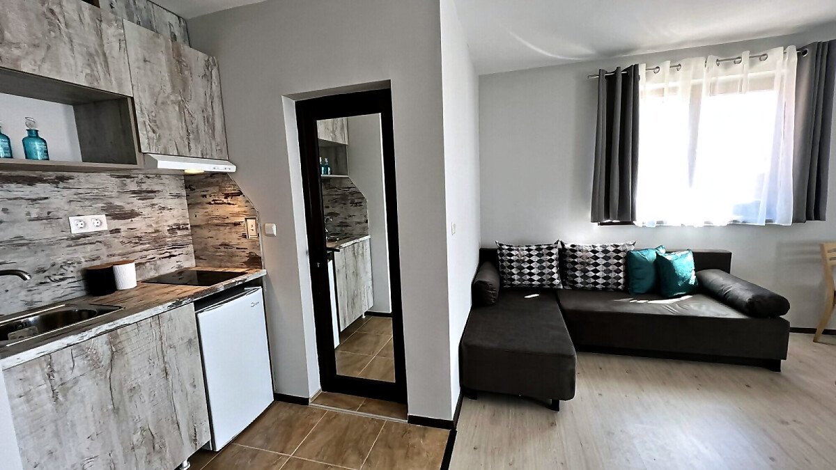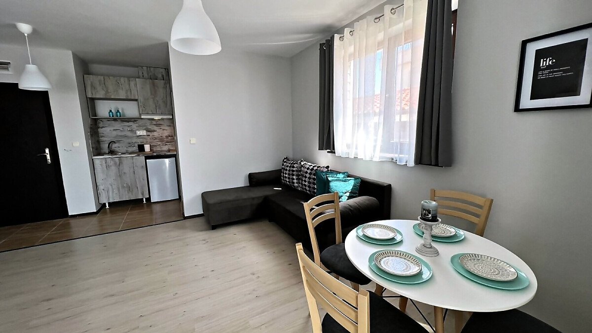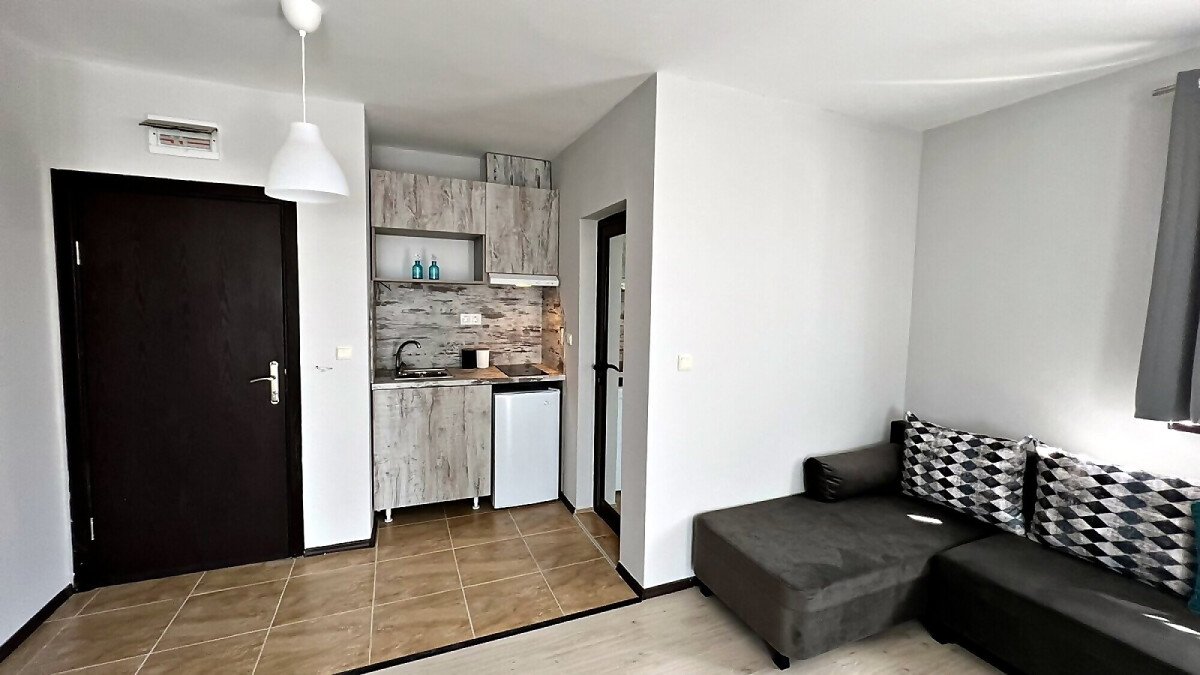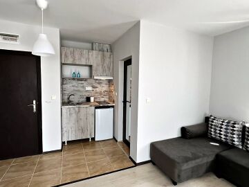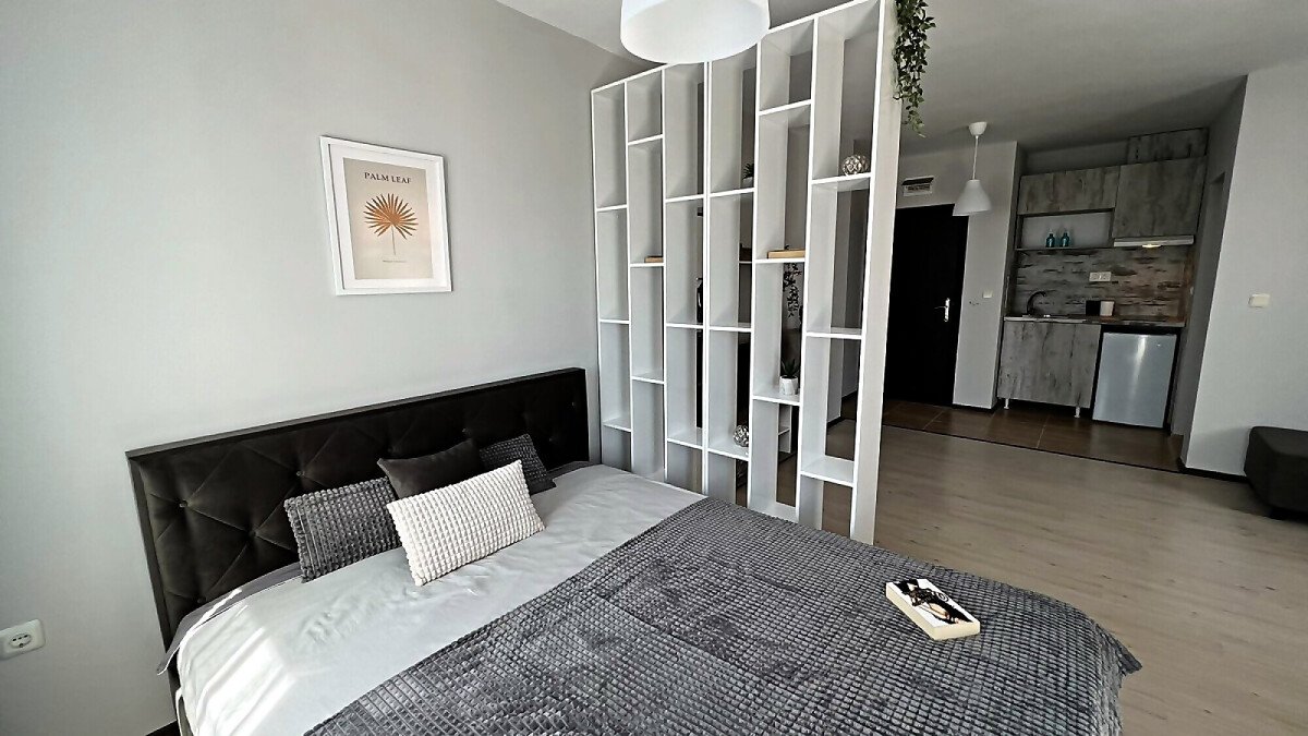 Студиото е много просторно, със следното разпределение – голяма всекидневна с обособена спалня, кът за хранене и малък кухненски бокс, баня с тоалетна, тераса с красива гледка към басейна и вътрешната част на комплекса. Продава се в отлично състояние, напълно оборудвано с домакинска електротехника, обзаведено с качествени мебели, готово за нанасяне.