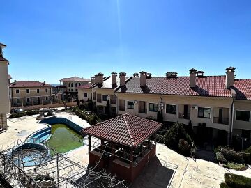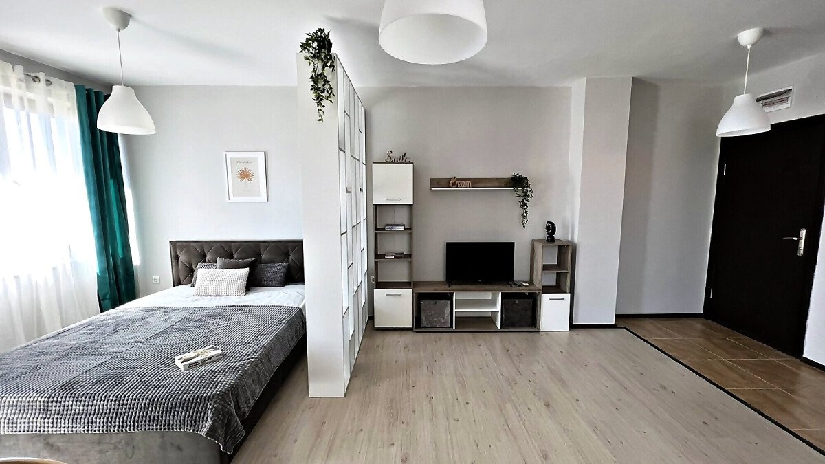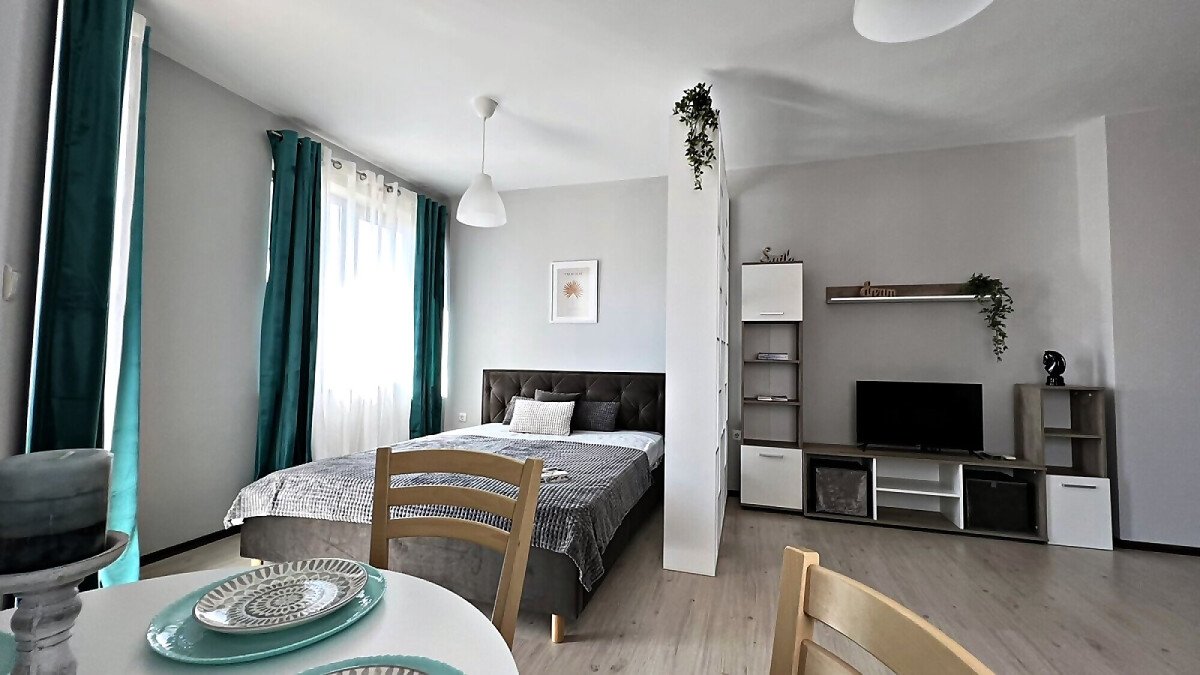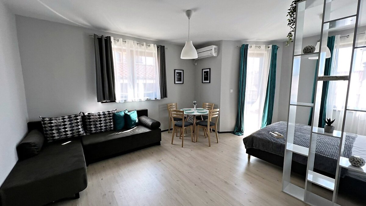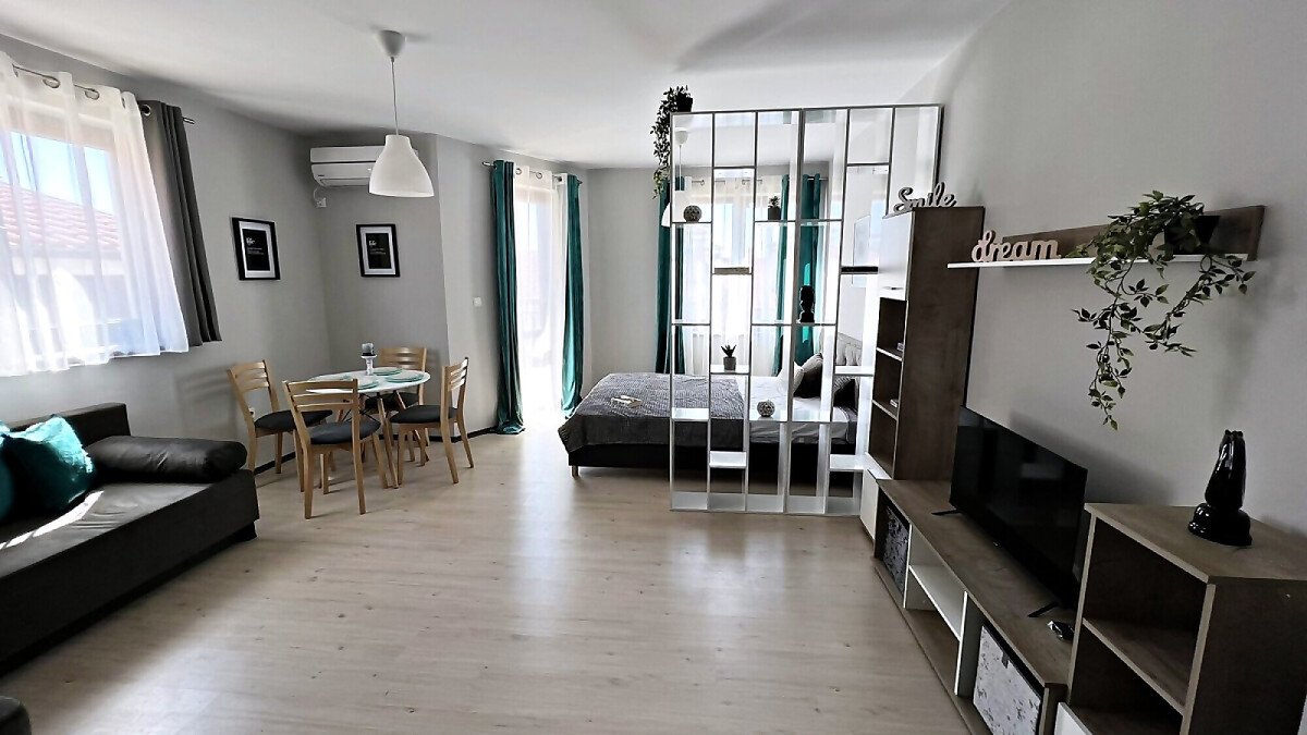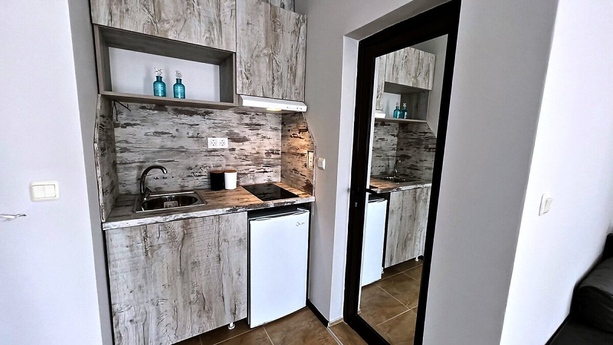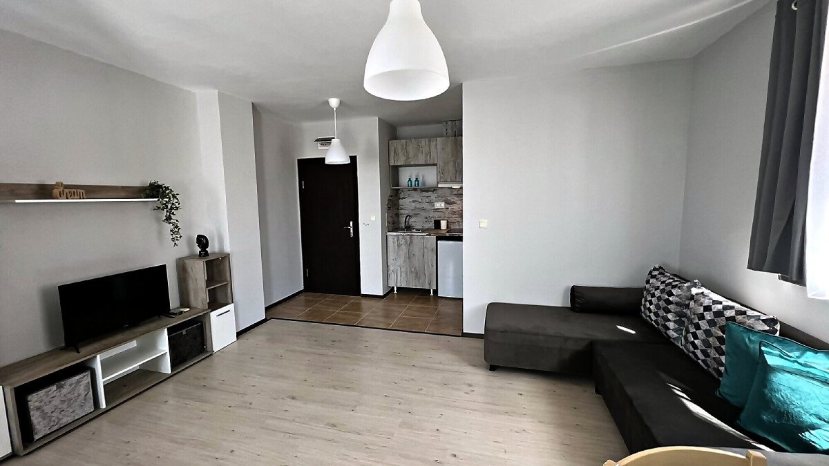 Студиото е много просторно, със следното разпределение – голяма всекидневна с обособена спалня, кът за хранене и малък кухненски бокс, баня с тоалетна, тераса с красива гледка към басейна и вътрешната част на комплекса. Продава се в отлично състояние, напълно оборудвано с домакинска електротехника, обзаведено с качествени мебели, готово за нанасяне.