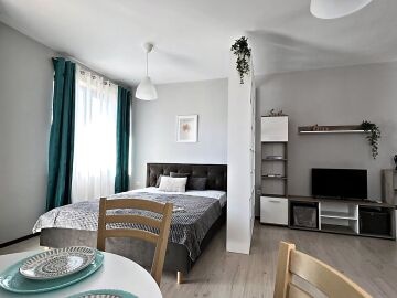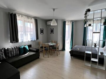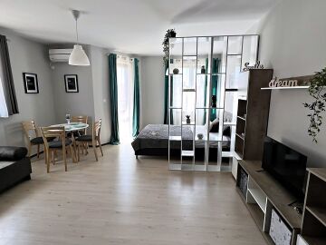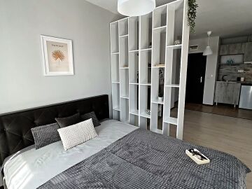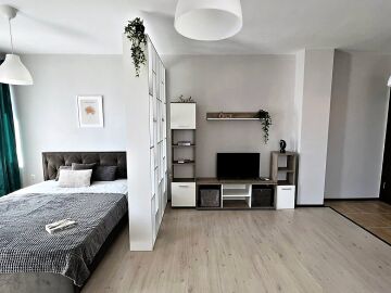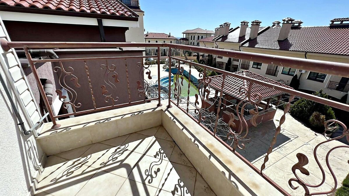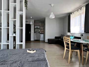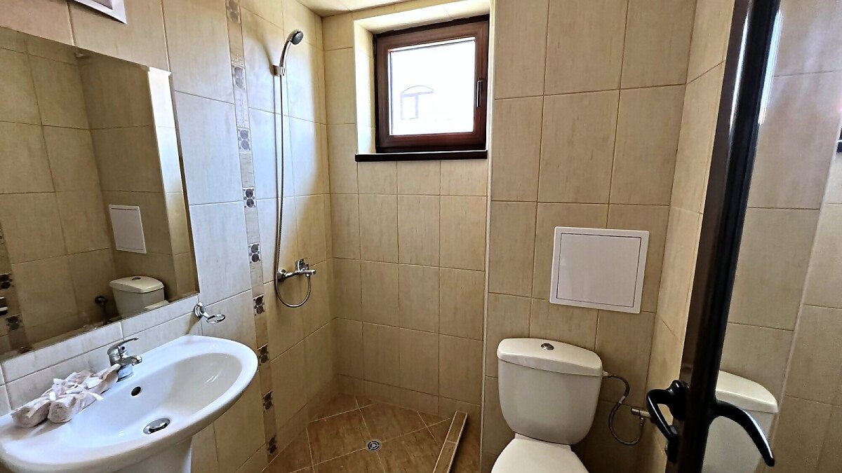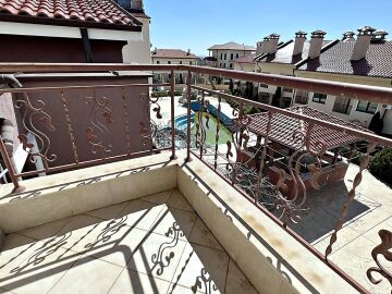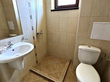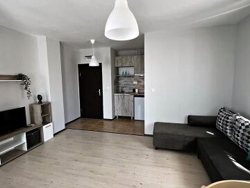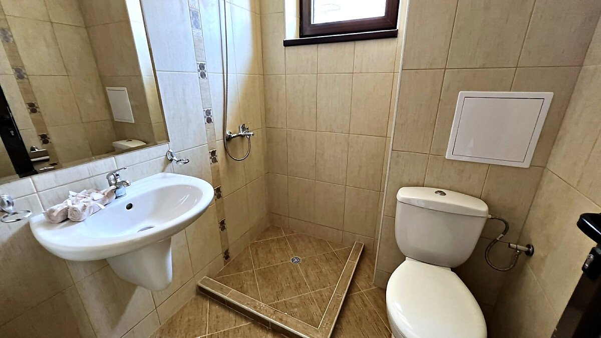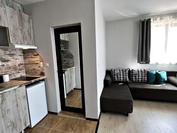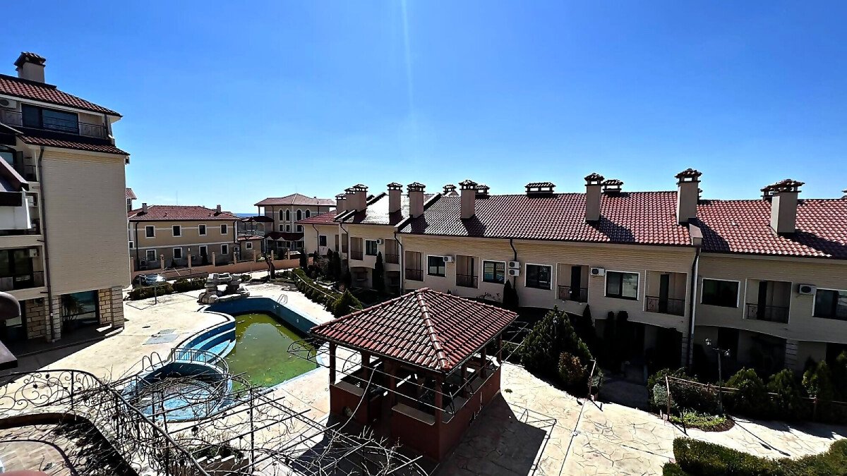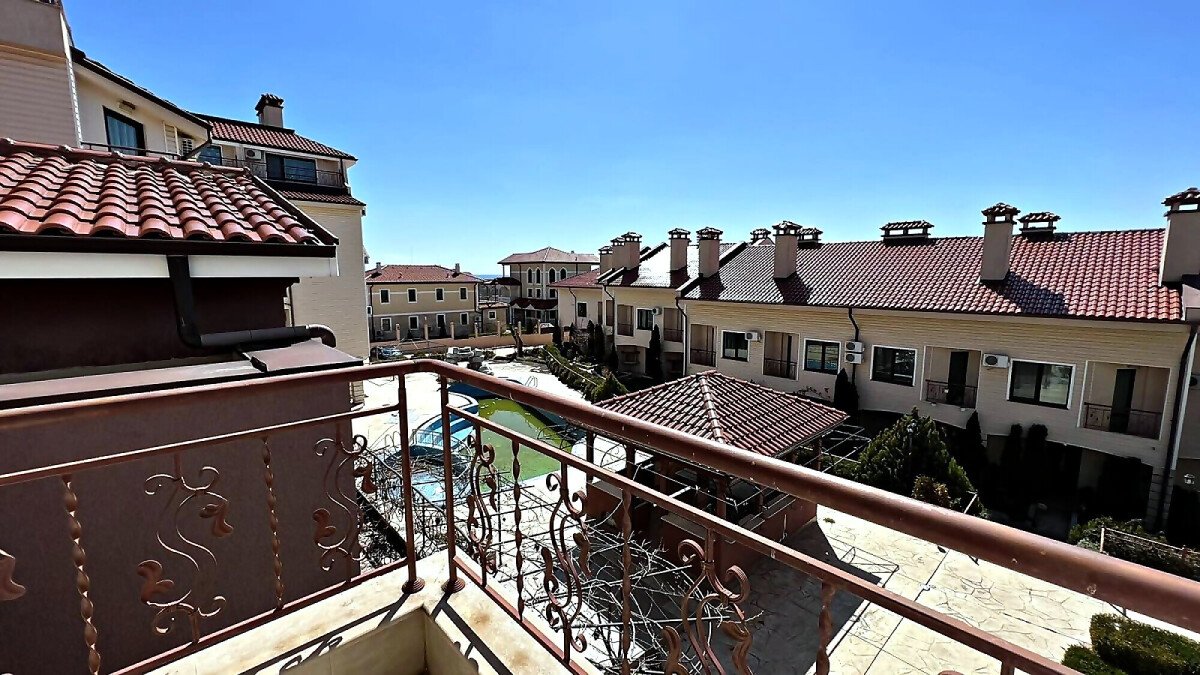 Студиото е много просторно, със следното разпределение – голяма всекидневна с обособена спалня, кът за хранене и малък кухненски бокс, баня с тоалетна, тераса с красива гледка към басейна и вътрешната част на комплекса. Продава се в отлично състояние, напълно оборудвано с домакинска електротехника, обзаведено с качествени мебели, готово за нанасяне.