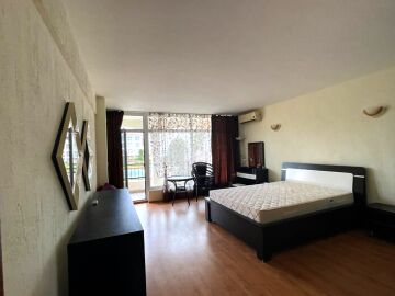 Едната от терасите има гледка към вътрешната част на комплекса и към басейна.