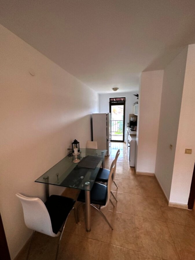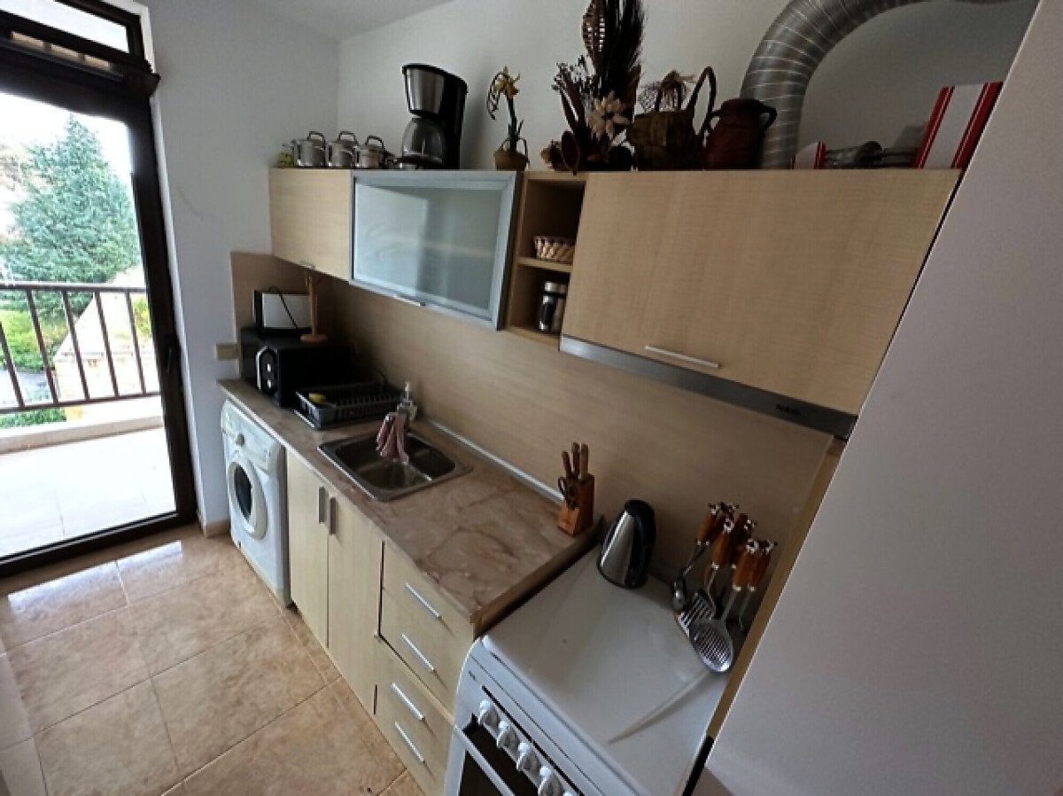 Апартаментът е много функционален, със следното разпределение – входно антре, всекидневна с обособен кухненски бокс и кът за хранене, две спални, тоалетна, баня с тоалетна и вана, две тераси. Едната от терасите разкрива уникална гледка към морето, а другата – към планината. Жилището е подходящо за целогодишно живеене, напълно обзаведено и оборудвано – и в трите стаи има климатик.