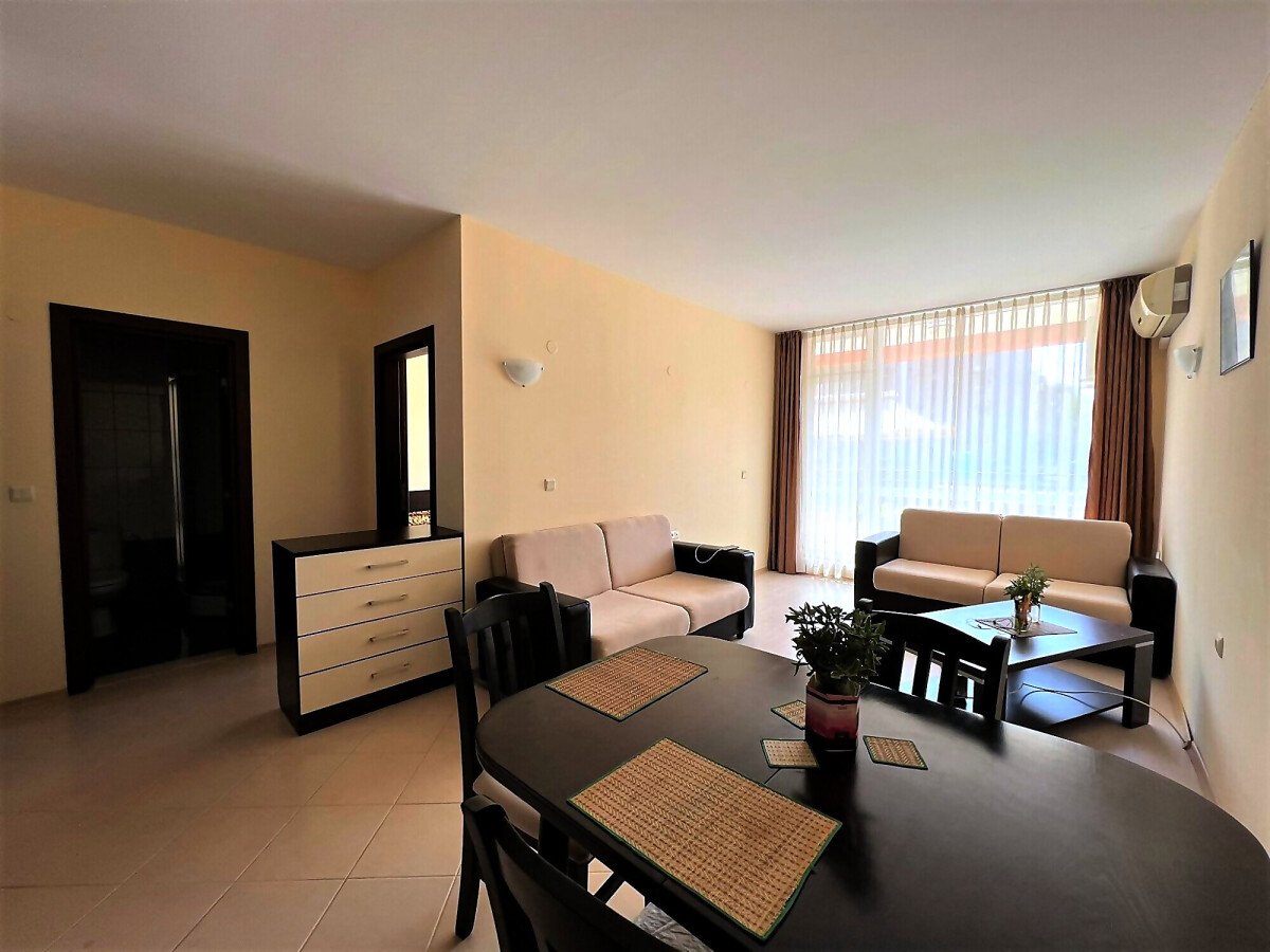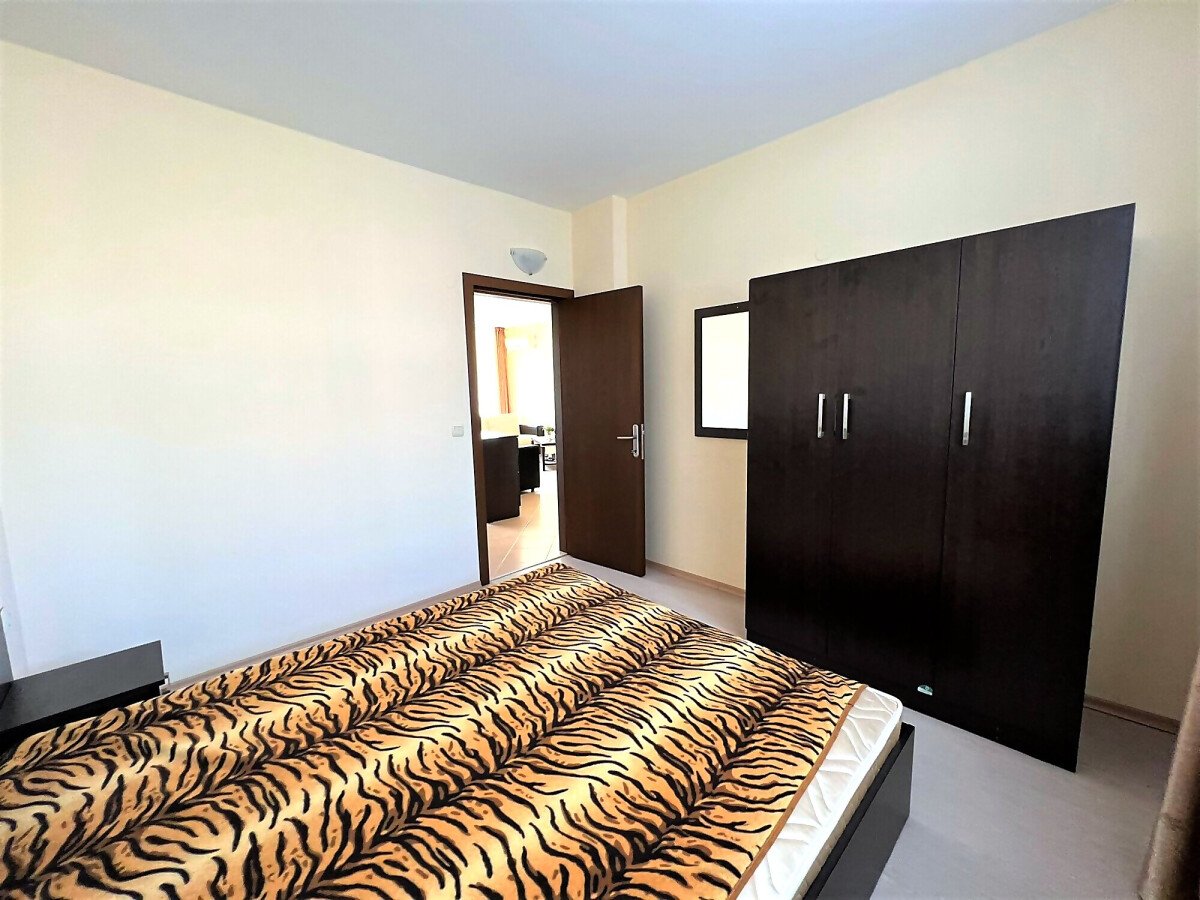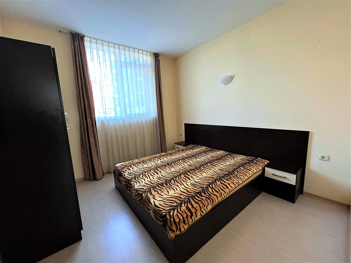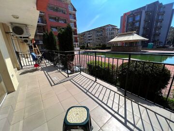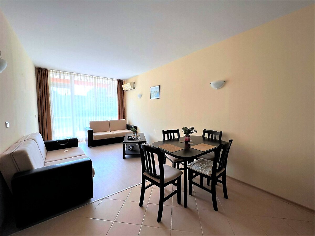 Апартаментът е светъл, просторен и много функционален, със следното разпределение – входно антре, всекидневна с обособена зона за хранене и кухненски бокс, две спални, тоалетна, баня с тоалетна и душ кабина, тераса с прекрасна гледка към вътрешната озеленена част на комплекса и към басейна. Продава се в отлично състояние, напълно оборудван и мебелиран, както е на снимките, готов за нанасяне.