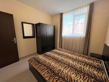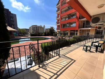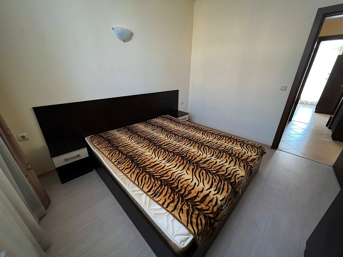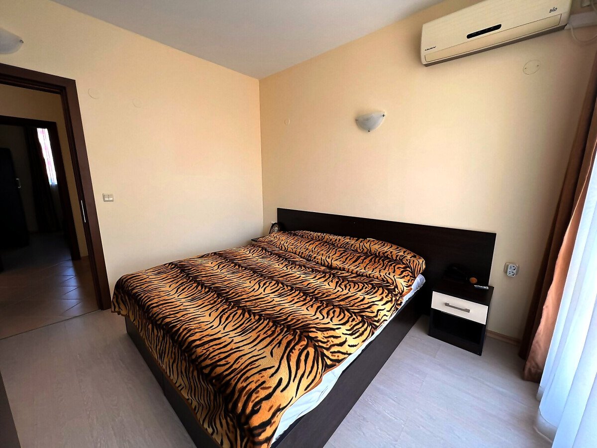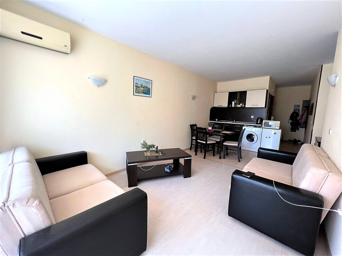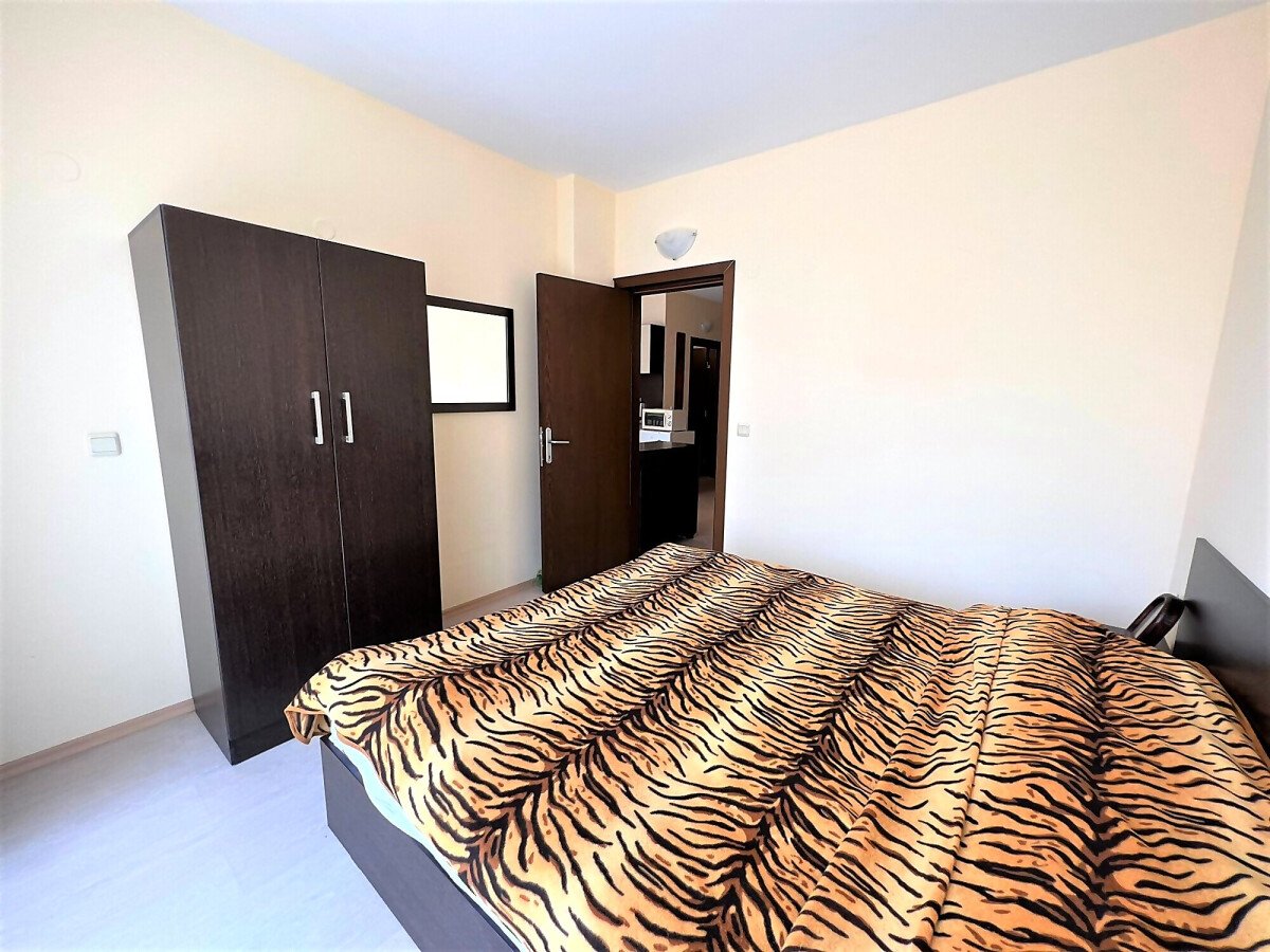 Апартаментът е светъл, просторен и много функционален, със следното разпределение – входно антре, всекидневна с обособена зона за хранене и кухненски бокс, две спални, тоалетна, баня с тоалетна и душ кабина, тераса с прекрасна гледка към вътрешната озеленена част на комплекса и към басейна. Продава се в отлично състояние, напълно оборудван и мебелиран, както е на снимките, готов за нанасяне.